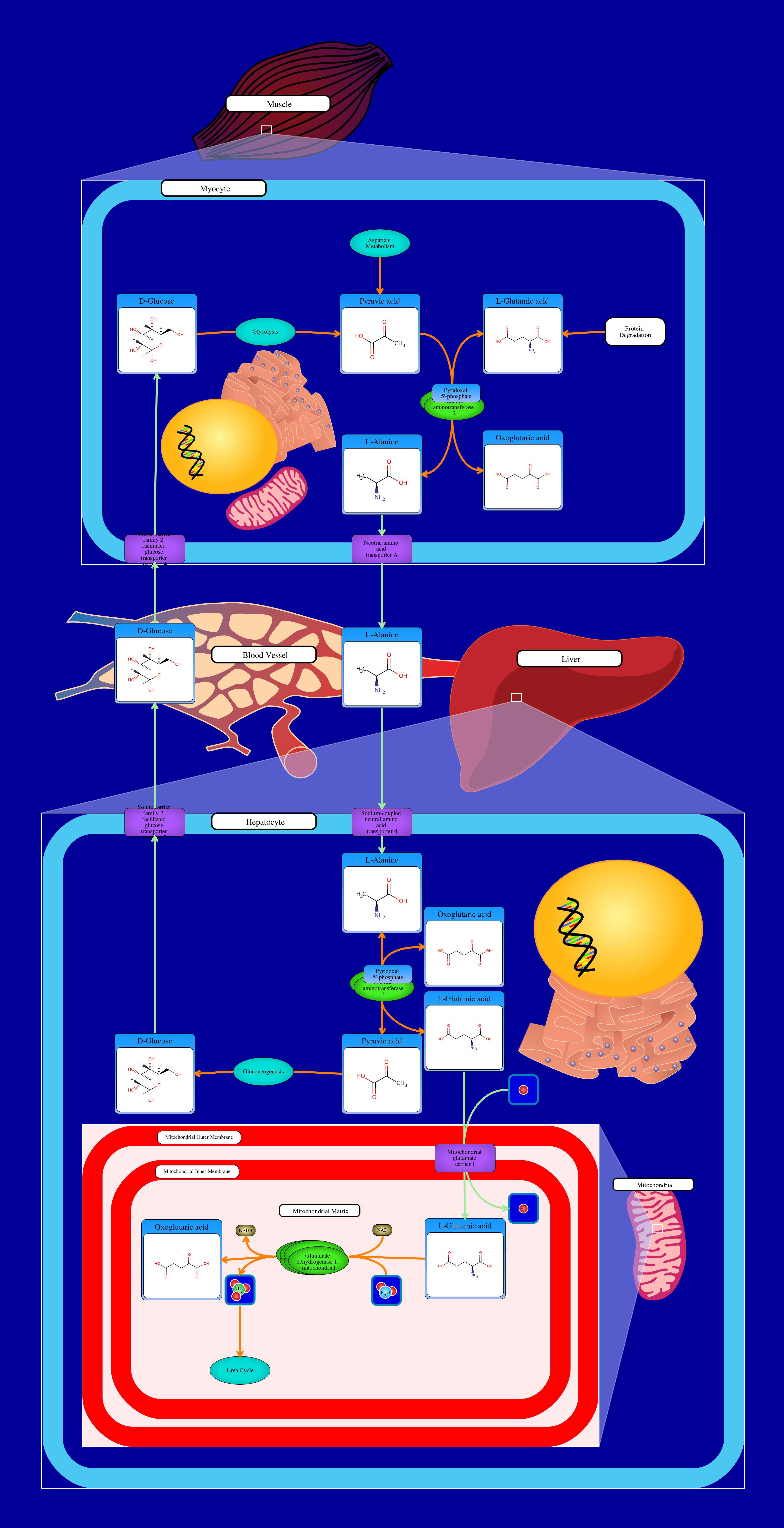 Alanine subsequently moves through the circulatory system to the liver where the reaction previously catalyzed by alanine aminotransferase is reversed to produce pyruvate. This pyruvate is converted into glucose through the process of gluconeogenesis which subsequently is transported back to the muscle tissue. Meanwhile, glutamate dehydrogenase in the mitochondria catabolizes glutamate into ammonium. Ammonium moves on to form urea in the urea cycle.