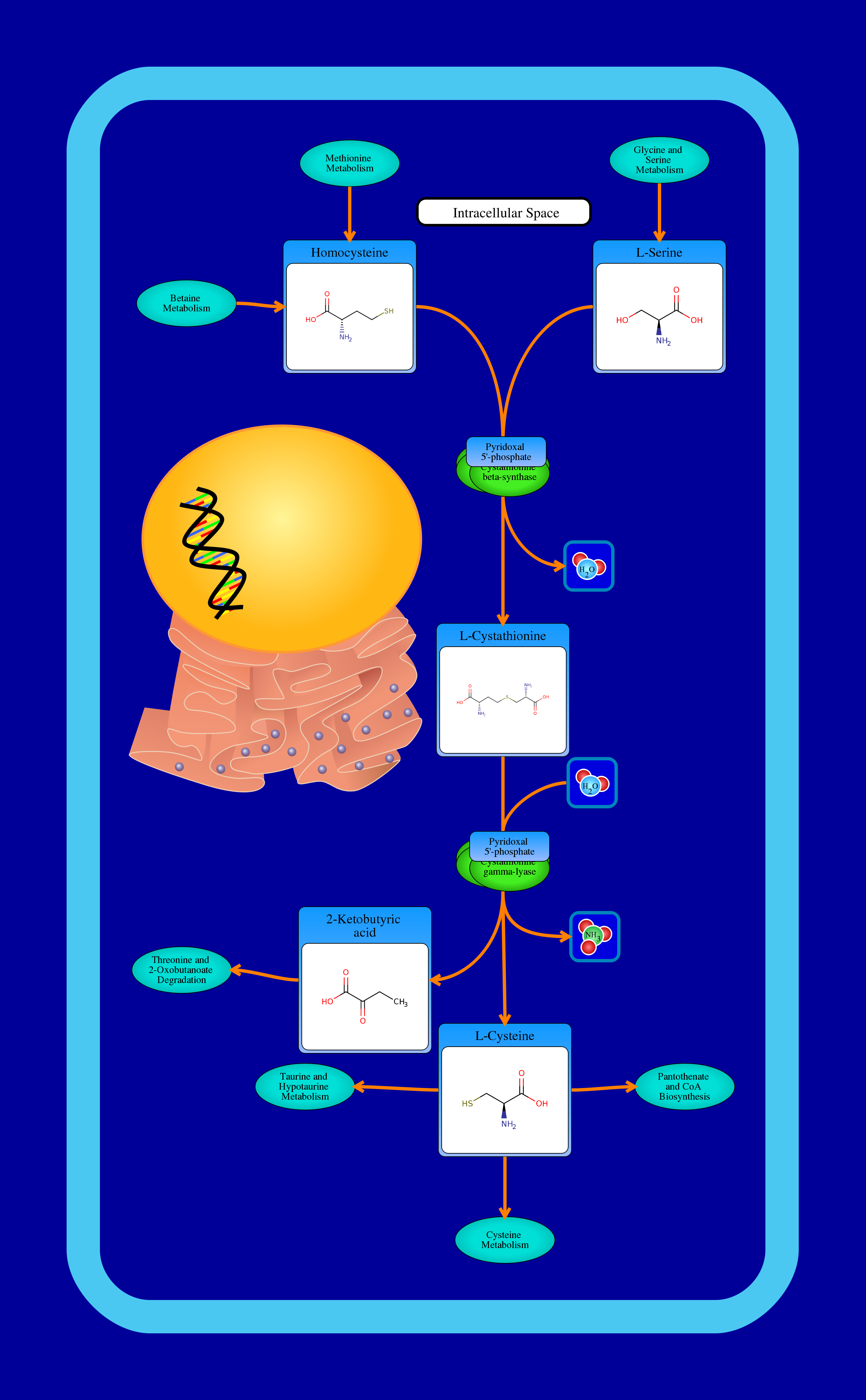 Homocysteine is an amino acid and homologue of cysteine that appears in the body as a result of the degradation of methionine. In mammals, homocysteine is used to biosynthesize cysteine via the following pathway. First the enzyme cystathionine beta-synthetase irreversibly condenses homocysteine with L-serine, forming L-cystathionine. The L-cystathionine is then cleaved by cystathionine gamma-lyase, producing 2-oxobutanoate, L-cysteine, and ammonia. The 2-oxobutanoate is further broken down via the 2-oxobutanoate degradation pathway, producing citric acid cycle intermediates, while the L-cysteine goes to the cysteine metabolism pathway. The homocysteine degradation pathway composes a part of the larger methionine metabolism pathway.