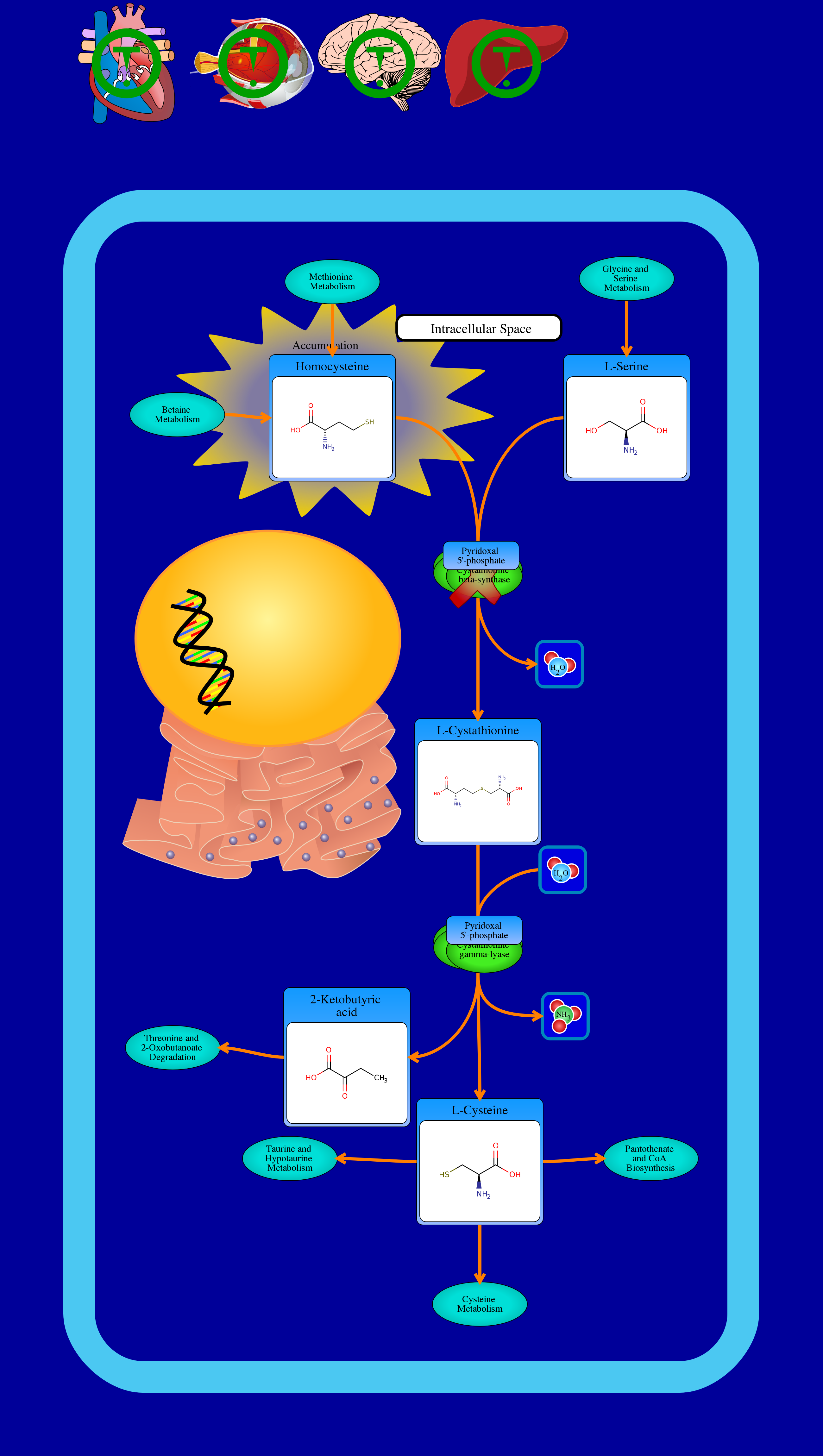 Homocystinuria, Cystathionine beta-Synthase Deficiency, also known as homocystinuria, is a inherited disorder of amino acid methionine metabolism caused by a defective cystathionine beta-Synthase. Cystathionine beta-Synthase catalyzes the conversion of homocysteine and L-Serine into L-Cystathionine which is the substrate of cystathionine gamma-lyase. This disorder is characterized by a large accumulation of homocysteine in the cell. Symptoms of the disorder include thromboembolism, ectopia lentis and/or severe myopia, skeletal system deficiency and developmental delay. Treatment with homocystinuria aims at correct the biochemical abnormalities through disorder management (e.g. surveillance, circumstances to avoid, prevention of primary manifestations, etc.
