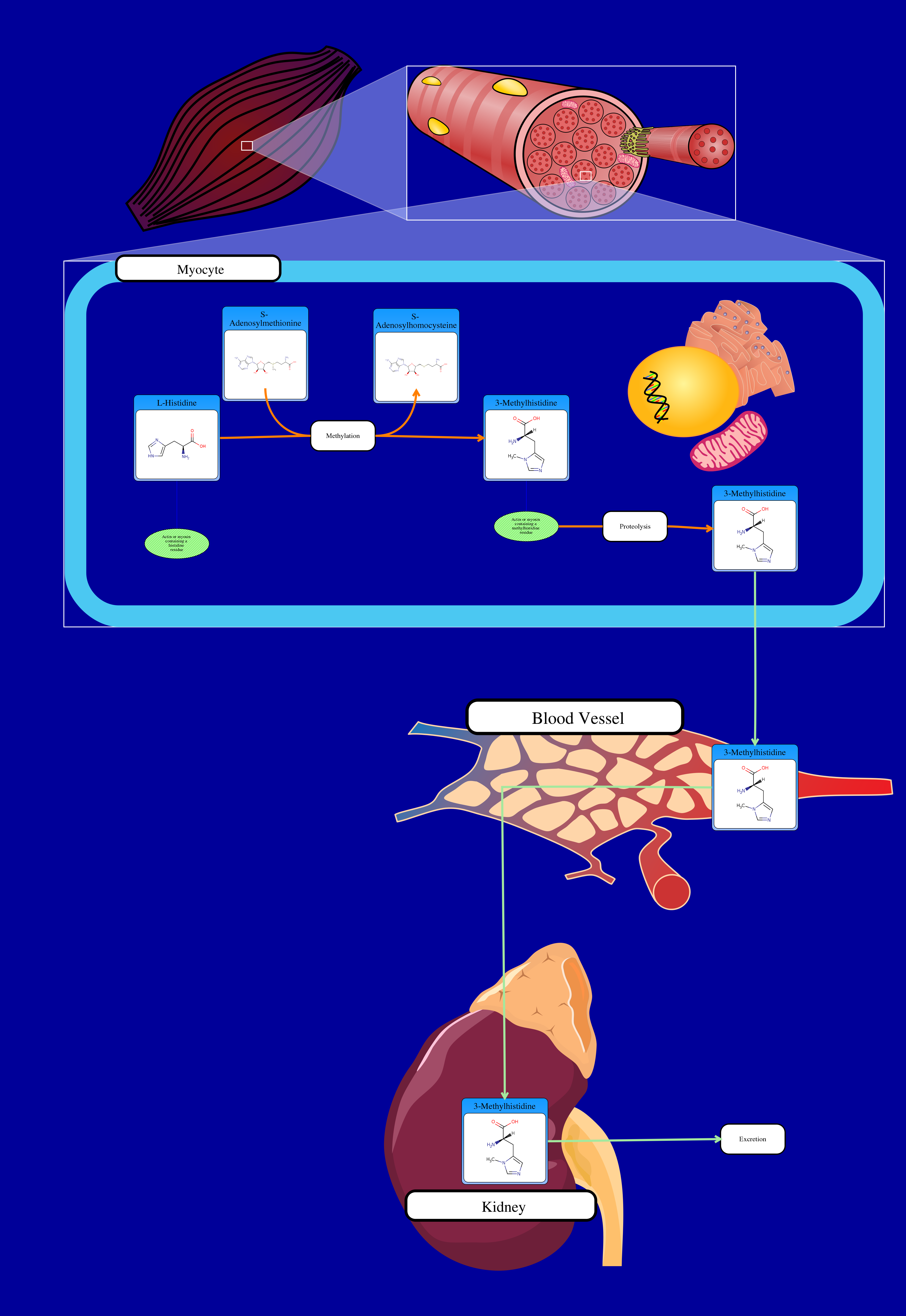 After its formation in the myocytes, methylhistidine enters the blood stream and travels to the kidneys, where it is excreted in the urine.