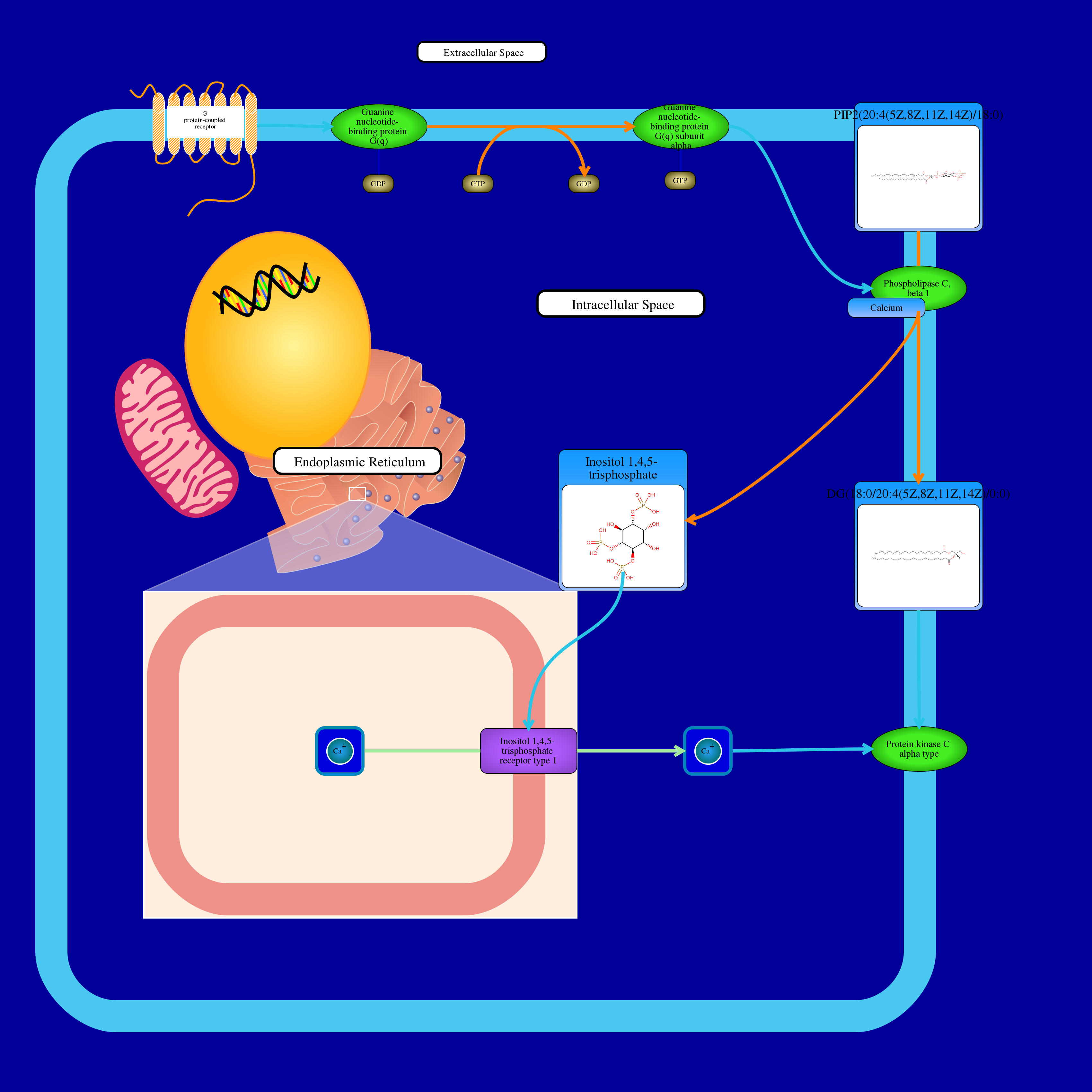 G protein-coupled receptors sense stimuli outside the cell and transmit signals across the plasma membrane. Activation of protein kinase C (PKC) is one of the common signaling pathways. When a class of GPCRs are activated by a ligand, they activate Gq protein to bind GTP instead of GDP. After the Gq becomes active, it activates phospholipase C (PLC) to cleave the membrane lipid phosphatidylinositol 4,5-bisphosphate (PIP2) into inositol 1,4,5-trisphosphate (IP3) and diacyl glycerol (DAG). IP3 can bind Ins3P receptor to open calcium channel by diffusion from cytoplasm to ER. Activated calcium channel will release the calcium from ER into cytoplasm. Calcium can activate the kinase activity of PKC.