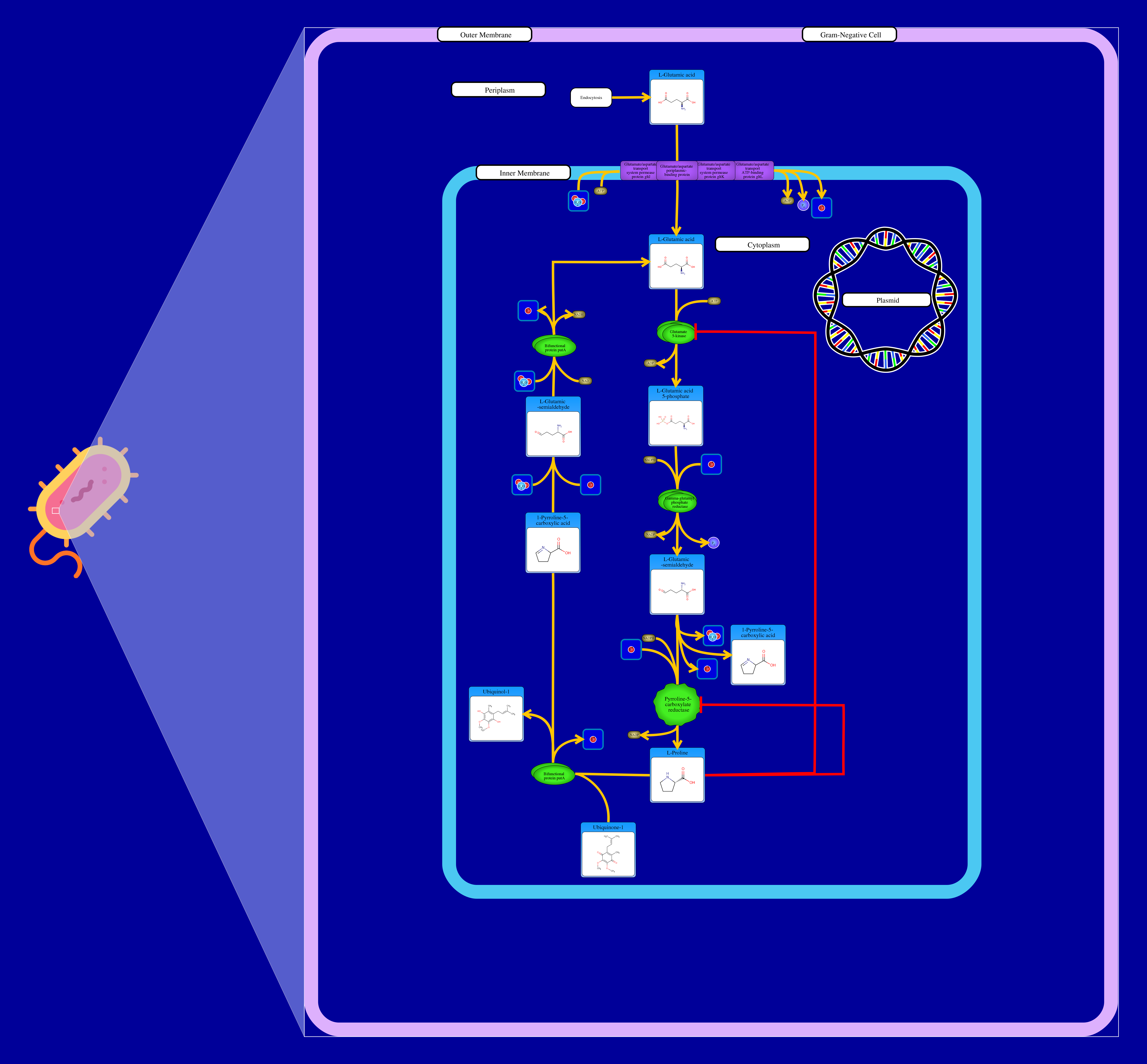 The creation of L-proline in E. coli starts with L-glutamic acid being phosphorylated through an ATP driven glutamate 5-kinase resulting in a L-glutamic acid 5-phosphate. This compound is then reduced through an NADPH driven gamma glutamyl phosphate reductase resulting in the release of a phosphate, an NADP and a L-glutamic gamma-semialdehyde. L-glutamic gamma-semialdehyde is dehydrated spontaneously, resulting in a release of water,hydrogen ion and 1-Pyrroline-5-carboxylic acid. The latter compound is reduced by an NADPH driven pyrroline-5-carboxylate reductase which is then reduced to L-proline. L-proline works as a repressor of the pyrroline-5-carboxylate reductase enzyme and glutamate 5-kinase. Three genetic loci, proA, proB and proC control the biosynthesis of L-proline in E. coli.The pathway begins with a reaction that is catalyzed by γ-glutamyl kinase, which is encoded by proB. Next, NADPH-dependent reduction of γ-glutamyl phosphate to glutamate-5-semialdehyde, occurs through catalyzation by glutamate-5-semialdehyde dehydrogenase, encoded by proA. Following this, both enzymes join together in a multimeric bi-functional enzyme complex called γ-glutamyl kinase-GP-reductase multienzyme complex. This formation is thought to protect the highly labile glutamyl phosphate from the antagonistic nucleophilic and aqueous environment found in the cell. Finally, NADPH-dependent pyrroline-5-carboxylate reductase encoded by proC catalyzes the reduction of pyrroline 5-carboxylate into L-proline. Proline is metabolized in E. coli by returning to the form of L-glutamate, which is then degraded to α-ketoglutarate,which serves as an intermediary of the TCA cycle. Interestingly enough, L-glutamate, the obligate intermediate of the proline degradation pathway, is not able to serve as an outright source of carbon and energy for E. coli, because the rate at which glutamate transport supplies exogenous glutamate is not adequate. The process by which proline is turned into L-glutamate starts with L-proline interacting with ubiquinone through a bifunctional protein putA resulting in an ubiquinol, a hydrogen ion and a 1-pyrroline-5-carboxylic acid. The latter compound is then hydrated spontaneously resulting in a L-glutamic gamma-semialdehyde. This compound is then processed by interacting with water through an NAD driven bifunctional protein putA resulting in a hydrogen ion, NADH and L-glutamic acid.