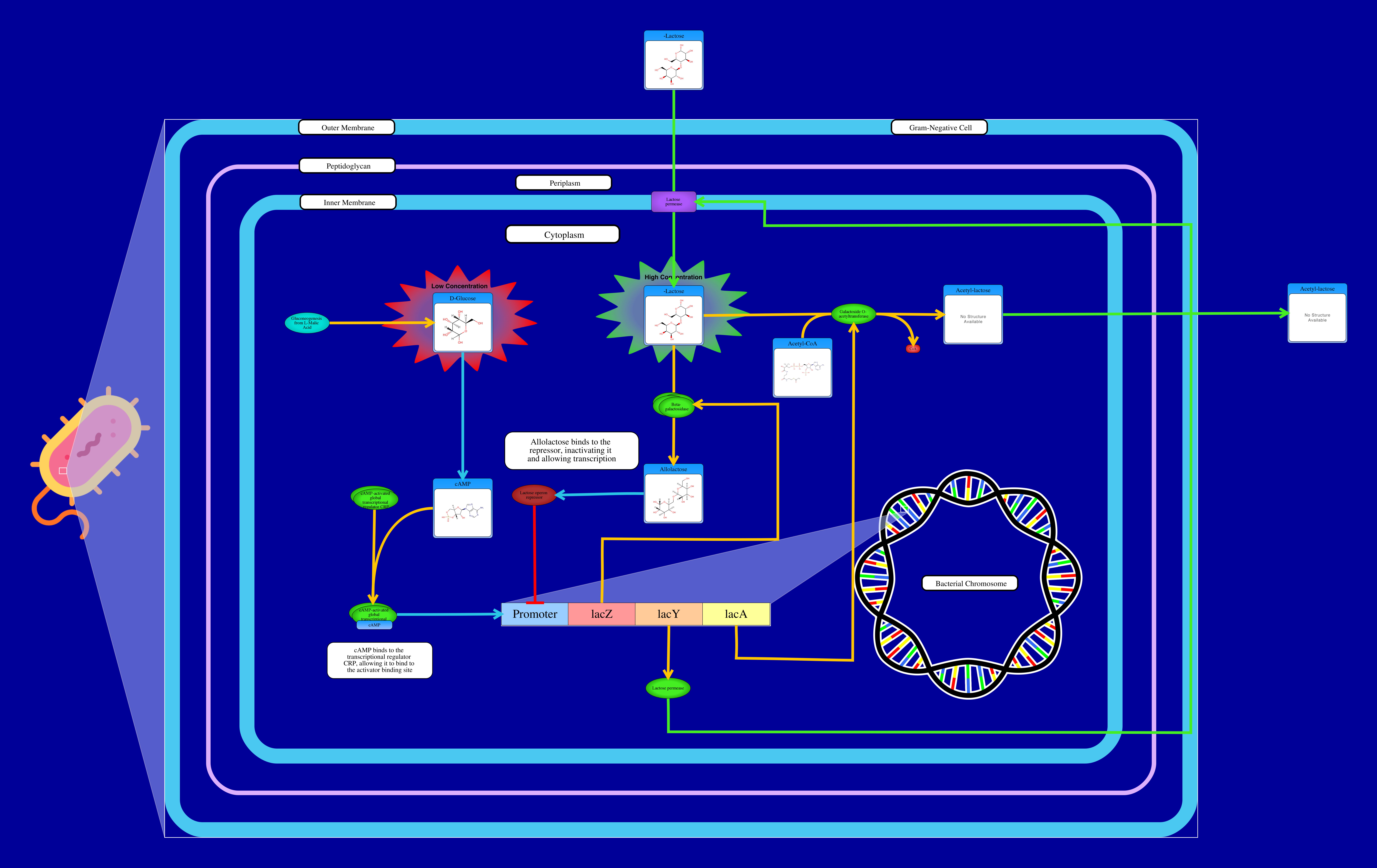 The lac operon in E. coli produces three proteins that are used to metabolize lactose in the absence of glucose. If glucose is present in the cell, cAMP levels will be low, and only a small amount will be able to bind to the cAMP-activated global transcriptional regulator (CRP or CAP). Without cAMP bound, the protein is unactivated, and cannot bind to the activator binding site of the operon. However, when glucose levels are low, cAMP levels are higher, and more can bind to and activate CRP, allowing it to activate the operon. At the same time, if lactose levels in the cell are low, there will be minimal amounts of allolactose produced by any beta-galactosidase present currently in the cell. Allolactose is necessary to bind to the lactose operon repressor, and without allolactose bound to the repressor, it is tightly bound to the operator region of the operon. However, when concentrations of lactose are higher in the cell, more allolactose is produced, and when it binds to the repressor, the repressor cannot bind to the operator, freeing it and allowing RNA polymerase to bind. This, combined with the binding of the CRP protein to the activator binding site leads to all three genes in the operon being transcribed.
