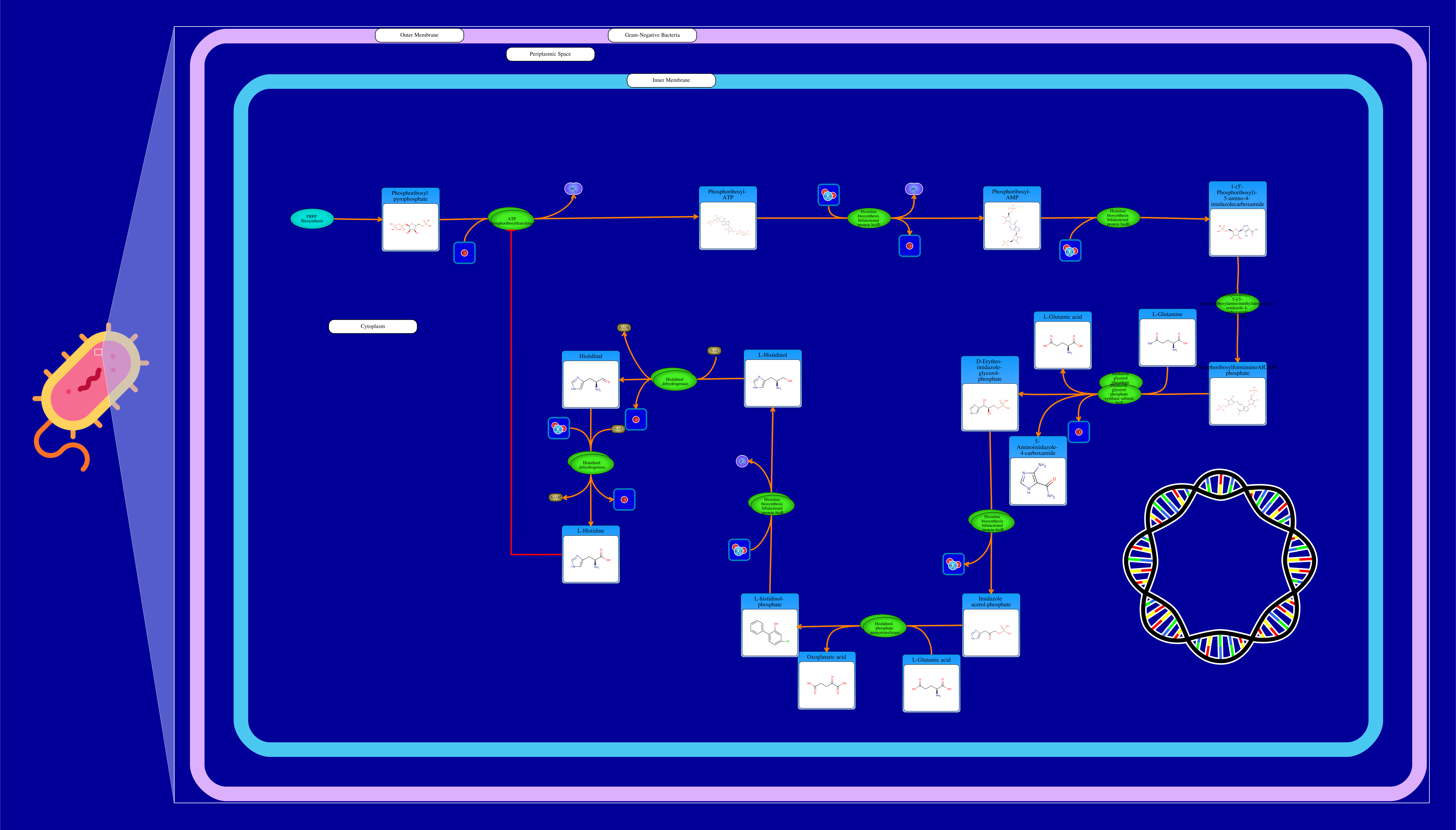 Histidine biosynthesis starts with a product of PRPP biosynthesis pathway, phosphoribosyl pyrophosphate which interacts with a hydrogen ion through an ATP phosphoribosyltransferase resulting in an pyrophosphate and a phosphoribosyl-ATP. The phosphoribosyl-ATP interacts with water through a phosphoribosyl-AMP cyclohydrolase / phosphoribosyl-ATP pyrophosphatase resulting in the release of pyrophosphate, hydrogen ion and a phosphoribosyl-AMP. The same enzyme proceeds to interact with phosphoribosyl-AMP and water resulting in a 1-(5'-Phosphoribosyl)-5-amino-4-imidazolecarboxamide. The product is then isomerized by a N-(5'-phospho-L-ribosyl-formimino)-5-amino-1-(5'-phosphoribosyl)-4-imidazolecarboxamide isomerase resulting in a PhosphoribosylformiminoAICAR-phosphate, which reacts with L-glutamine through an imidazole glycerol phosphate synthase resulting in a L-glutamic acid, hydrogen ion, 5-aminoimidazole-4-carboxamide and a D-erythro-imidazole-glycerol-phosphate. D-erythro-imidazole-glycerol-phosphate reacts with a imidazoleglycerol-phosphate dehydratase / histidinol-phosphatase, dehydrating the compound and resulting in a imidazole acetol-phosphate. Next, imidazole acetol-phosphate reacts with L-glutamic acid through a histidinol-phosphate aminotransferase, releasing oxoglutaric acid and L-histidinol-phosphate. The latter compound interacts with water and a imidazoleglycerol-phosphate dehydratase / histidinol-phosphatase resulting in L-histidinol and phosphate. L-histidinol interacts with a NAD-driven histidinol dehydrogenase resulting in a Histidinal. Histidinal in turn reacts with water in a NAD driven histidinal dehydrogenase resulting in L-Histidine.
