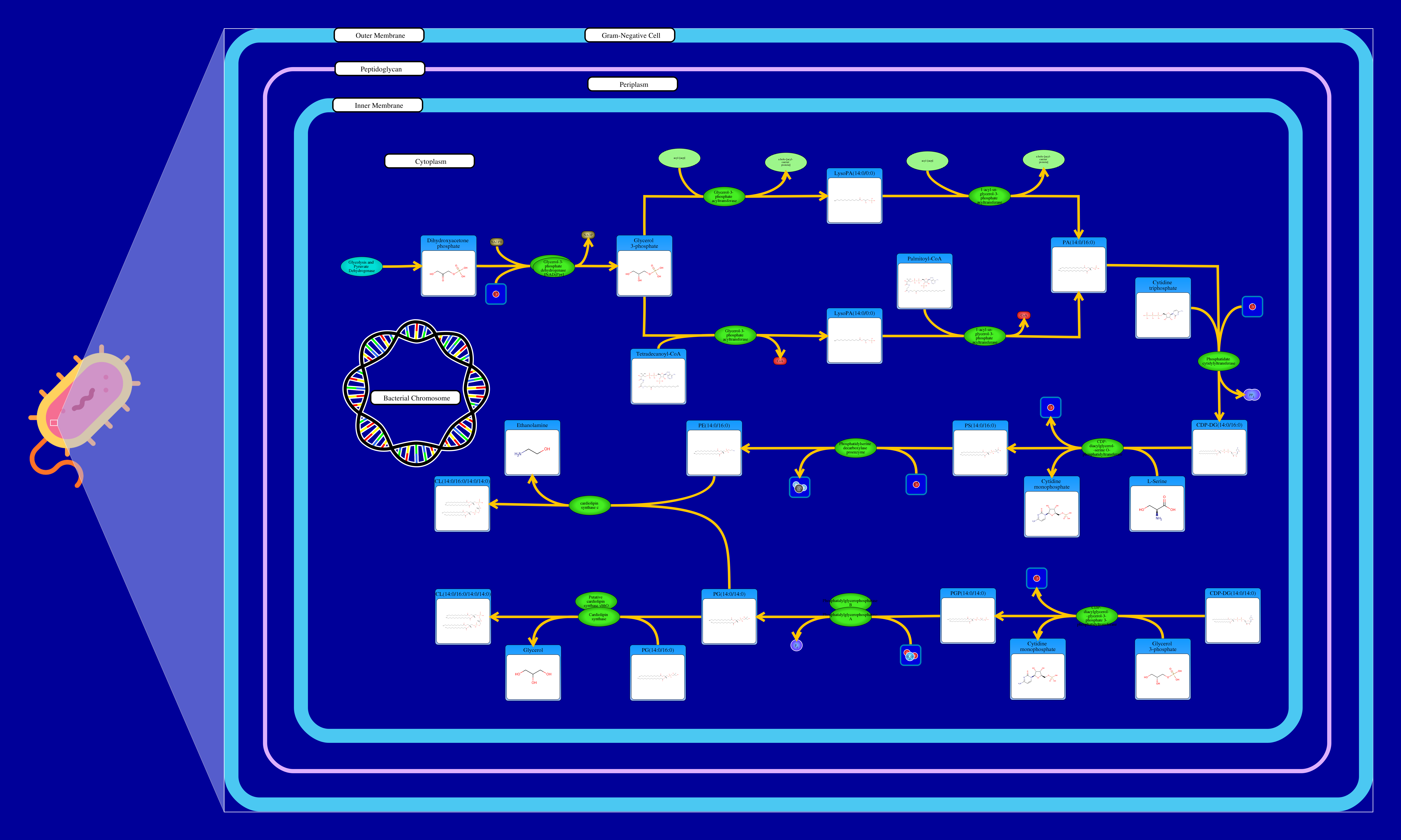 Phospholipids are membrane components in E. coli. The major phospholipids of E. coli are phosphatidylethanolamine, phosphatidylglycerol, and cardiolipin. All phospholipids contain sn-glycerol-3-phosphate esterified with fatty acids at the sn-1 and sn-2 positions. The reaction starts from a glycerone phosphate (dihydroxyacetone phosphate) produced in glycolysis. The glycerone phosphate is transformed into an sn-glycerol 3-phosphate (glycerol 3 phosphate) by NADPH-driven glycerol-3-phosphate dehydrogenase. sn-Glycerol 3-phosphate is transformed to a 1-acyl-sn-glycerol 3-phosphate (lysophosphatidic acid). This can be achieved by an sn-glycerol-3-phosphate acyltransferase that interacts either with a long-chain acyl-CoA or with an acyl-[acp]. The 1-acyl-sn-glycerol 3-phosphate is transformed into a 1,2-diacyl-sn-glycerol 3-phosphate (phosphatidic acid) through a 1-acylglycerol-3-phosphate O-acyltransferase. This compound is then converted into a CPD-diacylglycerol through a CTP phosphatidate cytididyltransferase. CPD-diacylglycerol can be transformed either into an L-1-phosphatidylserine or an L-1-phosphatidylglycerol-phosphate through a phosphatidylserine synthase or a phosphatidylglycerophosphate synthase, respectively. The L-1-phosphatidylserine transforms into L-1-phosphatidylethanolamine through a phosphatidylserine decarboxylase. On the other hand, L-1-phosphatidylglycerol-phosphate gets transformed into an L-1-phosphatidyl-glycerol through a phosphatidylglycerophosphatase. These 2 products combine to produce a cardiolipin and an ethanolamine. The L-1 phosphatidyl-glycerol can also interact with cardiolipin synthase resulting in a glycerol and a cardiolipin.