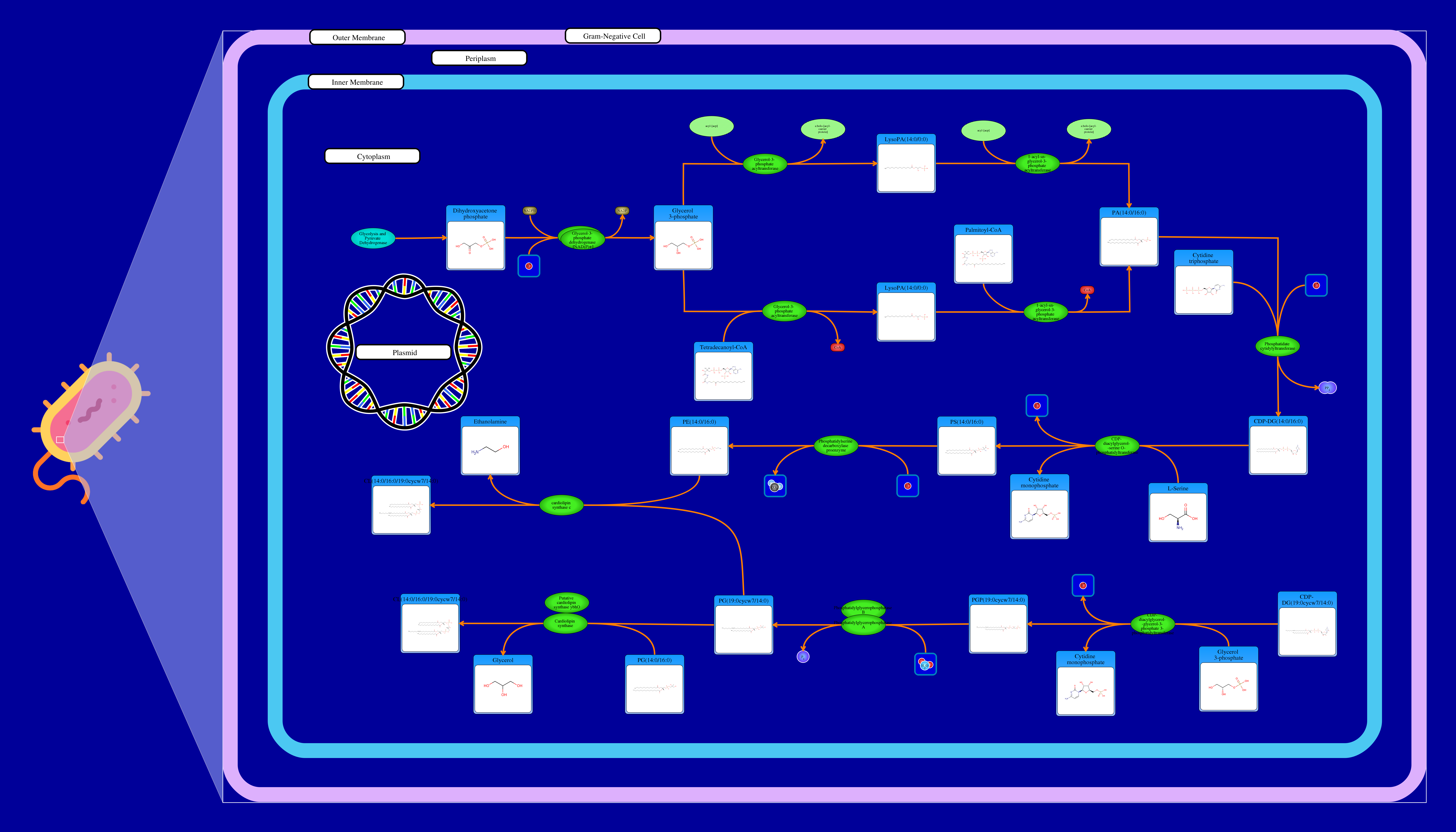 Phospholipids are membrane components in E. coli. The major phospholipids of E. coli are phosphatidylethanolamine, phosphatidylglycerol, and cardiolipin. All phospholipids contain sn-glycerol-3-phosphate esterified with fatty acids at the sn-1 and sn-2 positions. The reaction starts from a glycerone phosphate (dihydroxyacetone phosphate) produced in glycolysis. The glycerone phosphate is transformed into an sn-glycerol 3-phosphate (glycerol 3 phosphate) by NADPH-driven glycerol-3-phosphate dehydrogenase. sn-Glycerol 3-phosphate is transformed to a 1-acyl-sn-glycerol 3-phosphate (lysophosphatidic acid). This can be achieved by an sn-glycerol-3-phosphate acyltransferase that interacts either with a long-chain acyl-CoA or with an acyl-[acp]. The 1-acyl-sn-glycerol 3-phosphate is transformed into a 1,2-diacyl-sn-glycerol 3-phosphate (phosphatidic acid) through a 1-acylglycerol-3-phosphate O-acyltransferase. This compound is then converted into a CPD-diacylglycerol through a CTP phosphatidate cytididyltransferase. CPD-diacylglycerol can be transformed either into an L-1-phosphatidylserine or an L-1-phosphatidylglycerol-phosphate through a phosphatidylserine synthase or a phosphatidylglycerophosphate synthase, respectively. The L-1-phosphatidylserine transforms into L-1-phosphatidylethanolamine through a phosphatidylserine decarboxylase. On the other hand, L-1-phosphatidylglycerol-phosphate gets transformed into an L-1-phosphatidyl-glycerol through a phosphatidylglycerophosphatase. These 2 products combine to produce a cardiolipin and an ethanolamine. The L-1 phosphatidyl-glycerol can also interact with cardiolipin synthase resulting in a glycerol and a cardiolipin.