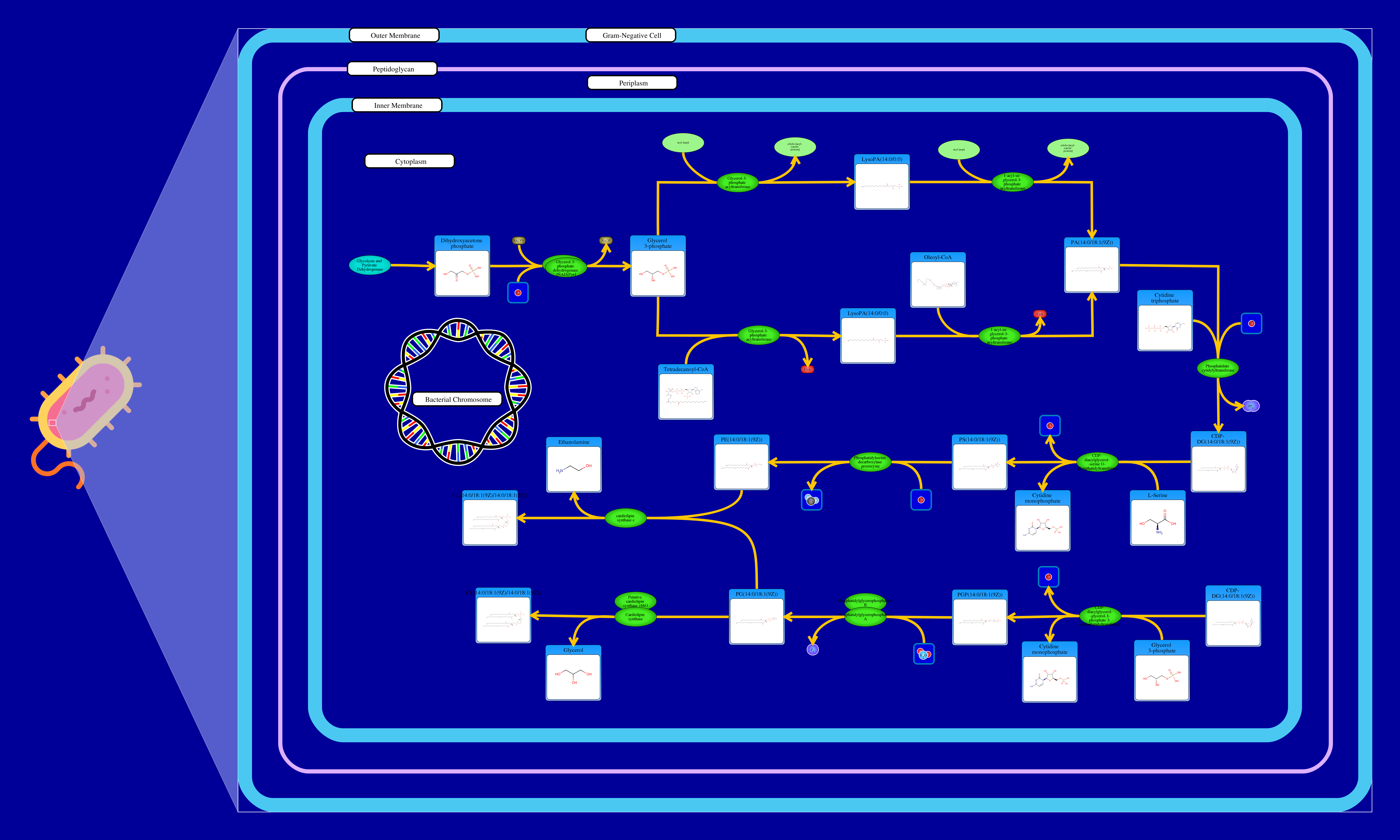 Phospholipids are membrane components in E. coli. The major phospholipids of E. coli are phosphatidylethanolamine, phosphatidylglycerol, and cardiolipin. All phospholipids contain sn-glycerol-3-phosphate esterified with fatty acids at the sn-1 and sn-2 positions. The reaction starts from a glycerone phosphate (dihydroxyacetone phosphate) produced in glycolysis. The glycerone phosphate is transformed into an sn-glycerol 3-phosphate (glycerol 3 phosphate) by NADPH-driven glycerol-3-phosphate dehydrogenase. sn-Glycerol 3-phosphate is transformed to a 1-acyl-sn-glycerol 3-phosphate (lysophosphatidic acid). This can be achieved by an sn-glycerol-3-phosphate acyltransferase that interacts either with a long-chain acyl-CoA or with an acyl-[acp]. The 1-acyl-sn-glycerol 3-phosphate is transformed into a 1,2-diacyl-sn-glycerol 3-phosphate (phosphatidic acid) through a 1-acylglycerol-3-phosphate O-acyltransferase. This compound is then converted into a CPD-diacylglycerol through a CTP phosphatidate cytididyltransferase. CPD-diacylglycerol can be transformed either into an L-1-phosphatidylserine or an L-1-phosphatidylglycerol-phosphate through a phosphatidylserine synthase or a phosphatidylglycerophosphate synthase, respectively. The L-1-phosphatidylserine transforms into L-1-phosphatidylethanolamine through a phosphatidylserine decarboxylase. On the other hand, L-1-phosphatidylglycerol-phosphate gets transformed into an L-1-phosphatidyl-glycerol through a phosphatidylglycerophosphatase. These 2 products combine to produce a cardiolipin and an ethanolamine. The L-1 phosphatidyl-glycerol can also interact with cardiolipin synthase resulting in a glycerol and a cardiolipin.