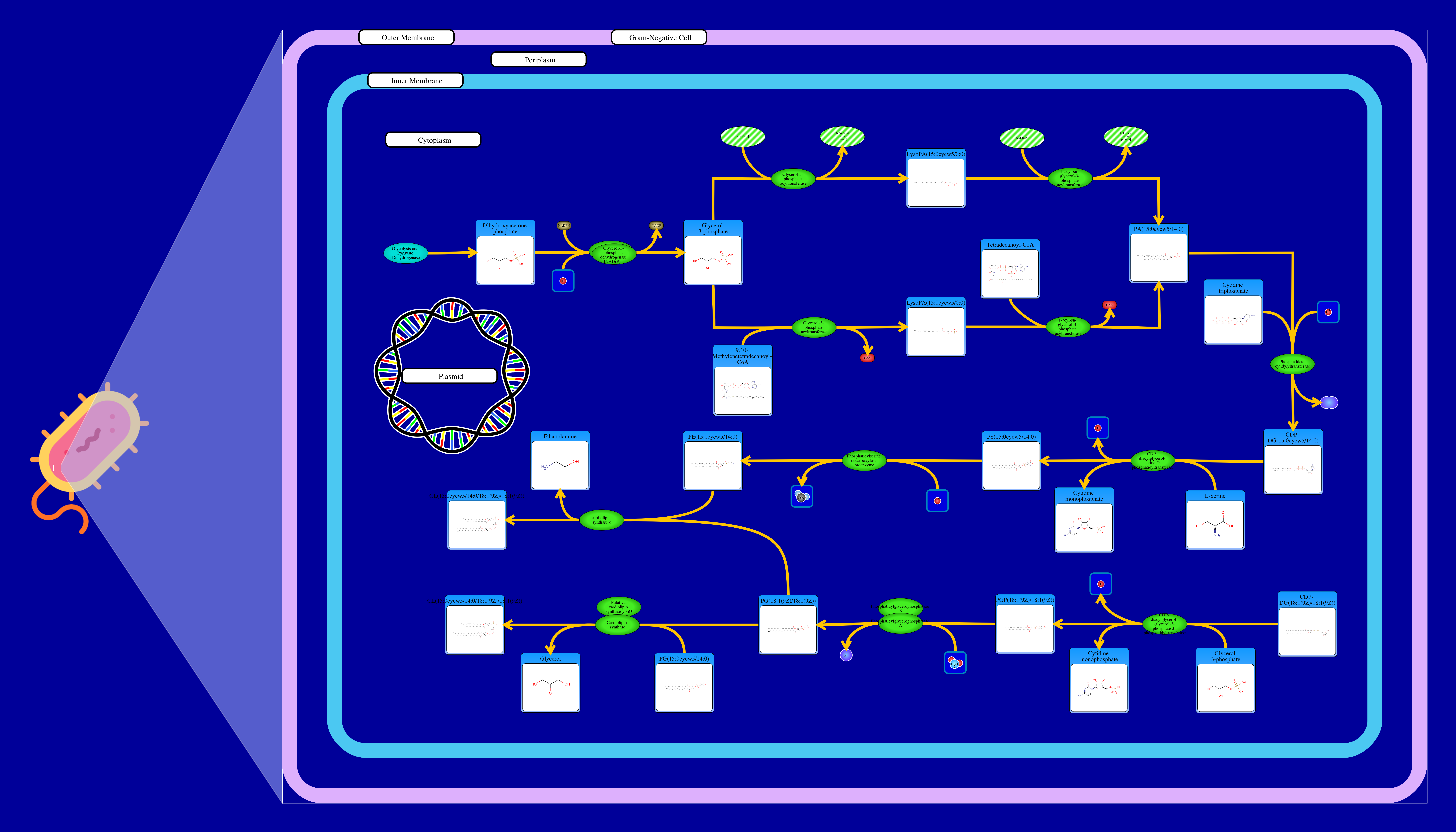 Phospholipids are membrane components in E. coli. The major phospholipids of E. coli are phosphatidylethanolamine, phosphatidylglycerol, and cardiolipin. All phospholipids contain sn-glycerol-3-phosphate esterified with fatty acids at the sn-1 and sn-2 positions. The reaction starts from a glycerone phosphate (dihydroxyacetone phosphate) produced in glycolysis. The glycerone phosphate is transformed into an sn-glycerol 3-phosphate (glycerol 3 phosphate) by NADPH-driven glycerol-3-phosphate dehydrogenase. sn-Glycerol 3-phosphate is transformed to a 1-acyl-sn-glycerol 3-phosphate (lysophosphatidic acid). This can be achieved by an sn-glycerol-3-phosphate acyltransferase that interacts either with a long-chain acyl-CoA or with an acyl-[acp]. The 1-acyl-sn-glycerol 3-phosphate is transformed into a 1,2-diacyl-sn-glycerol 3-phosphate (phosphatidic acid) through a 1-acylglycerol-3-phosphate O-acyltransferase. This compound is then converted into a CPD-diacylglycerol through a CTP phosphatidate cytididyltransferase. CPD-diacylglycerol can be transformed either into an L-1-phosphatidylserine or an L-1-phosphatidylglycerol-phosphate through a phosphatidylserine synthase or a phosphatidylglycerophosphate synthase, respectively. The L-1-phosphatidylserine transforms into L-1-phosphatidylethanolamine through a phosphatidylserine decarboxylase. On the other hand, L-1-phosphatidylglycerol-phosphate gets transformed into an L-1-phosphatidyl-glycerol through a phosphatidylglycerophosphatase. These 2 products combine to produce a cardiolipin and an ethanolamine. The L-1 phosphatidyl-glycerol can also interact with cardiolipin synthase resulting in a glycerol and a cardiolipin.
