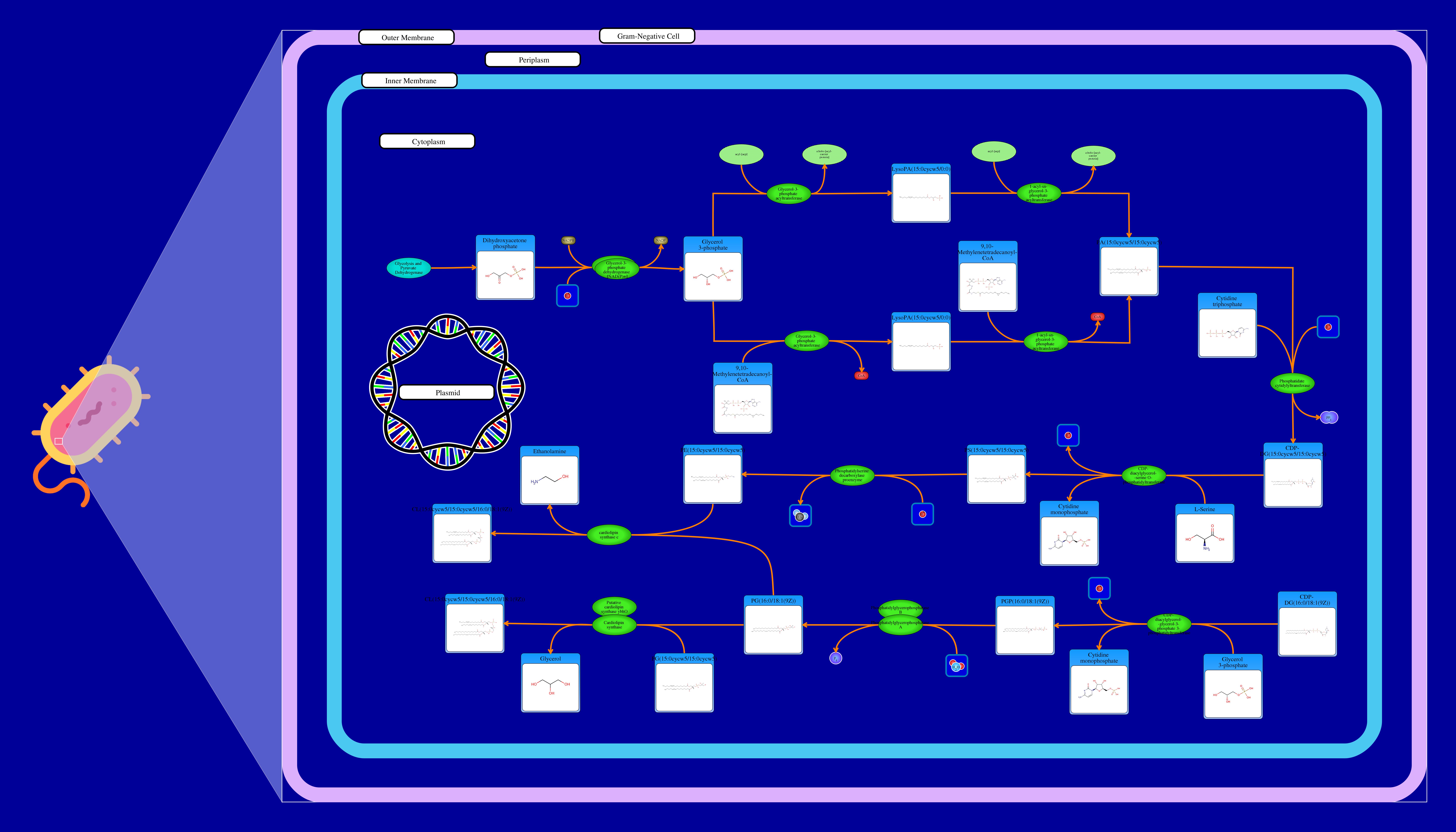 Phospholipids are membrane components in E. coli. The major phospholipids of E. coli are phosphatidylethanolamine, phosphatidylglycerol, and cardiolipin. All phospholipids contain sn-glycerol-3-phosphate esterified with fatty acids at the sn-1 and sn-2 positions. The reaction starts from a glycerone phosphate (dihydroxyacetone phosphate) produced in glycolysis. The glycerone phosphate is transformed into an sn-glycerol 3-phosphate (glycerol 3 phosphate) by NADPH-driven glycerol-3-phosphate dehydrogenase. sn-Glycerol 3-phosphate is transformed to a 1-acyl-sn-glycerol 3-phosphate (lysophosphatidic acid). This can be achieved by an sn-glycerol-3-phosphate acyltransferase that interacts either with a long-chain acyl-CoA or with an acyl-[acp]. The 1-acyl-sn-glycerol 3-phosphate is transformed into a 1,2-diacyl-sn-glycerol 3-phosphate (phosphatidic acid) through a 1-acylglycerol-3-phosphate O-acyltransferase. This compound is then converted into a CPD-diacylglycerol through a CTP phosphatidate cytididyltransferase. CPD-diacylglycerol can be transformed either into an L-1-phosphatidylserine or an L-1-phosphatidylglycerol-phosphate through a phosphatidylserine synthase or a phosphatidylglycerophosphate synthase, respectively. The L-1-phosphatidylserine transforms into L-1-phosphatidylethanolamine through a phosphatidylserine decarboxylase. On the other hand, L-1-phosphatidylglycerol-phosphate gets transformed into an L-1-phosphatidyl-glycerol through a phosphatidylglycerophosphatase. These 2 products combine to produce a cardiolipin and an ethanolamine. The L-1 phosphatidyl-glycerol can also interact with cardiolipin synthase resulting in a glycerol and a cardiolipin.