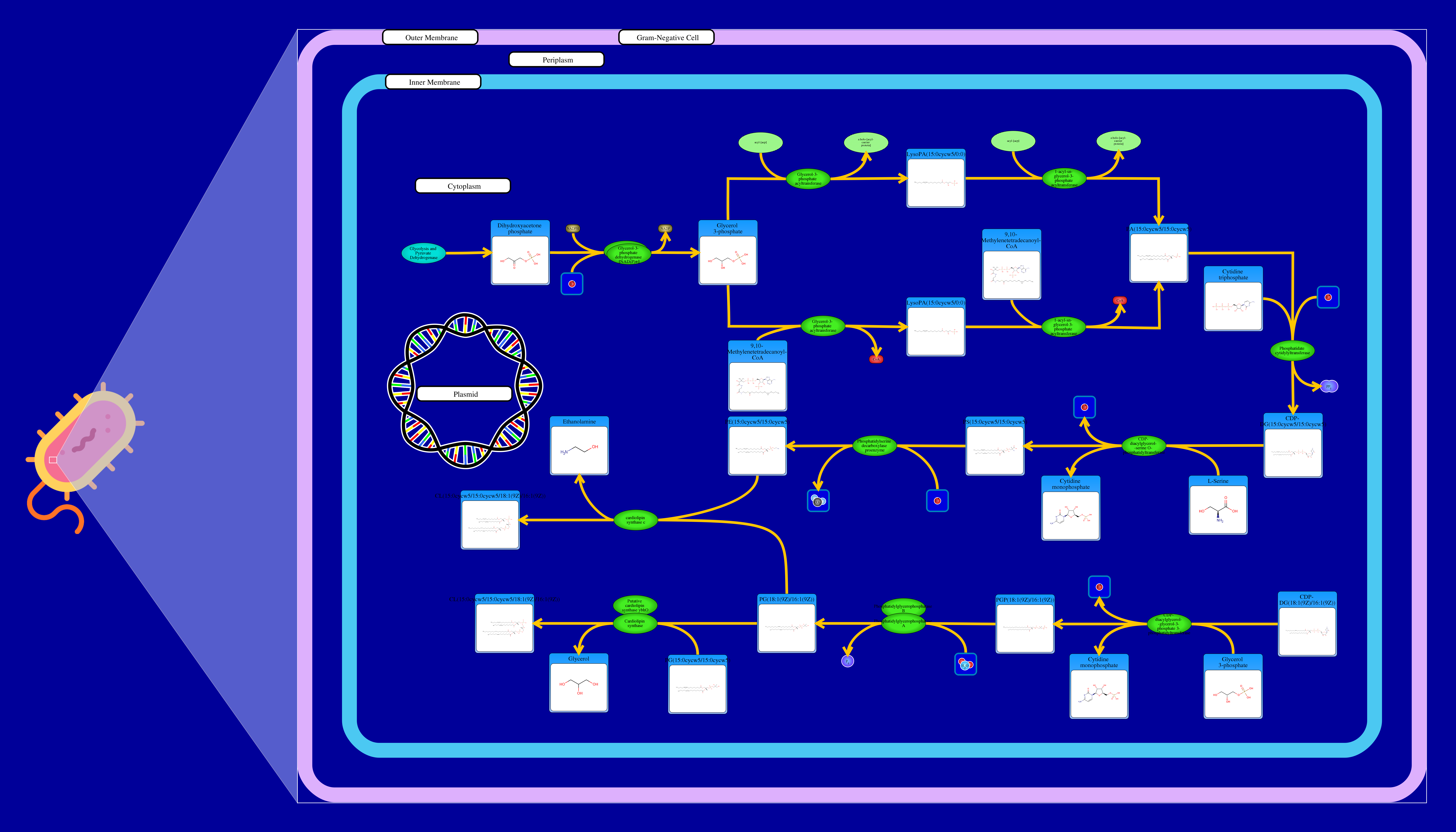Phospholipids are membrane components in E. coli. The major phospholipids of E. coli are phosphatidylethanolamine, phosphatidylglycerol, and cardiolipin. All phospholipids contain sn-glycerol-3-phosphate esterified with fatty acids at the sn-1 and sn-2 positions. The reaction starts from a glycerone phosphate (dihydroxyacetone phosphate) produced in glycolysis. The glycerone phosphate is transformed into an sn-glycerol 3-phosphate (glycerol 3 phosphate) by NADPH-driven glycerol-3-phosphate dehydrogenase. sn-Glycerol 3-phosphate is transformed to a 1-acyl-sn-glycerol 3-phosphate (lysophosphatidic acid). This can be achieved by an sn-glycerol-3-phosphate acyltransferase that interacts either with a long-chain acyl-CoA or with an acyl-[acp]. The 1-acyl-sn-glycerol 3-phosphate is transformed into a 1,2-diacyl-sn-glycerol 3-phosphate (phosphatidic acid) through a 1-acylglycerol-3-phosphate O-acyltransferase. This compound is then converted into a CPD-diacylglycerol through a CTP phosphatidate cytididyltransferase. CPD-diacylglycerol can be transformed either into an L-1-phosphatidylserine or an L-1-phosphatidylglycerol-phosphate through a phosphatidylserine synthase or a phosphatidylglycerophosphate synthase, respectively. The L-1-phosphatidylserine transforms into L-1-phosphatidylethanolamine through a phosphatidylserine decarboxylase. On the other hand, L-1-phosphatidylglycerol-phosphate gets transformed into an L-1-phosphatidyl-glycerol through a phosphatidylglycerophosphatase. These 2 products combine to produce a cardiolipin and an ethanolamine. The L-1 phosphatidyl-glycerol can also interact with cardiolipin synthase resulting in a glycerol and a cardiolipin.