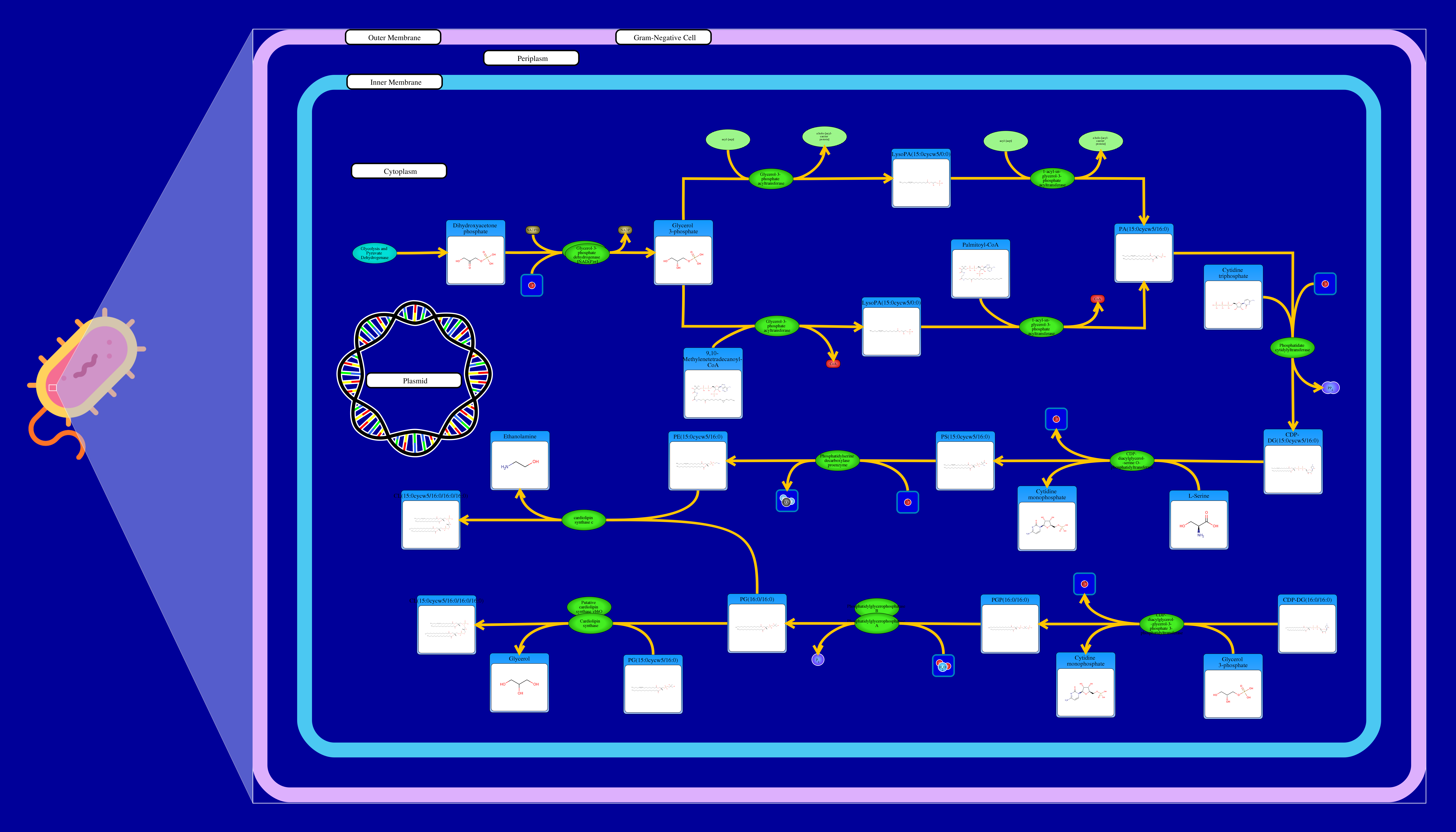 Phospholipids are membrane components in E. coli. The major phospholipids of E. coli are phosphatidylethanolamine, phosphatidylglycerol, and cardiolipin. All phospholipids contain sn-glycerol-3-phosphate esterified with fatty acids at the sn-1 and sn-2 positions. The reaction starts from a glycerone phosphate (dihydroxyacetone phosphate) produced in glycolysis. The glycerone phosphate is transformed into an sn-glycerol 3-phosphate (glycerol 3 phosphate) by NADPH-driven glycerol-3-phosphate dehydrogenase. sn-Glycerol 3-phosphate is transformed to a 1-acyl-sn-glycerol 3-phosphate (lysophosphatidic acid). This can be achieved by an sn-glycerol-3-phosphate acyltransferase that interacts either with a long-chain acyl-CoA or with an acyl-[acp]. The 1-acyl-sn-glycerol 3-phosphate is transformed into a 1,2-diacyl-sn-glycerol 3-phosphate (phosphatidic acid) through a 1-acylglycerol-3-phosphate O-acyltransferase. This compound is then converted into a CPD-diacylglycerol through a CTP phosphatidate cytididyltransferase. CPD-diacylglycerol can be transformed either into an L-1-phosphatidylserine or an L-1-phosphatidylglycerol-phosphate through a phosphatidylserine synthase or a phosphatidylglycerophosphate synthase, respectively. The L-1-phosphatidylserine transforms into L-1-phosphatidylethanolamine through a phosphatidylserine decarboxylase. On the other hand, L-1-phosphatidylglycerol-phosphate gets transformed into an L-1-phosphatidyl-glycerol through a phosphatidylglycerophosphatase. These 2 products combine to produce a cardiolipin and an ethanolamine. The L-1 phosphatidyl-glycerol can also interact with cardiolipin synthase resulting in a glycerol and a cardiolipin.