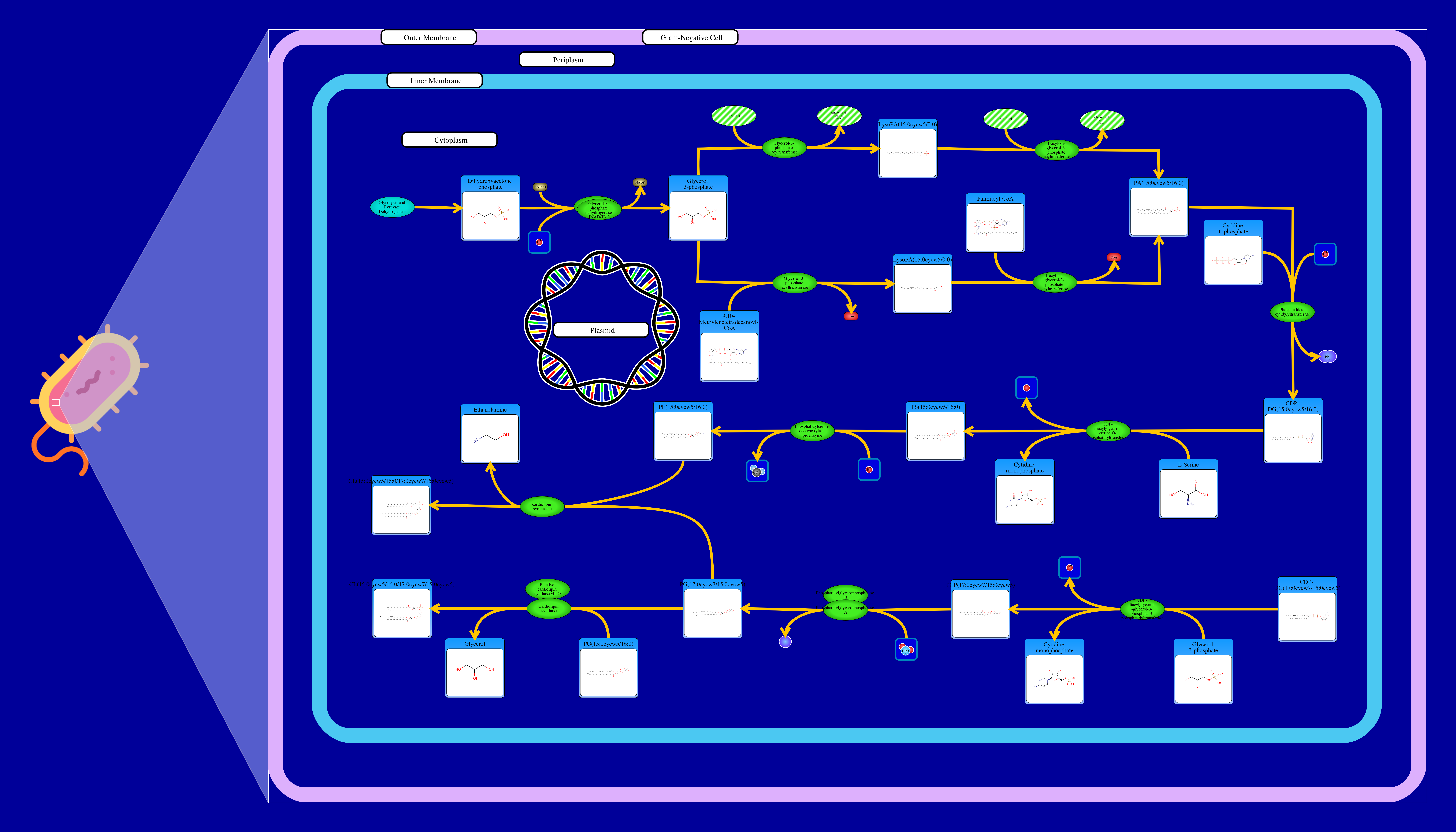 Phospholipids are membrane components in E. coli. The major phospholipids of E. coli are phosphatidylethanolamine, phosphatidylglycerol, and cardiolipin. All phospholipids contain sn-glycerol-3-phosphate esterified with fatty acids at the sn-1 and sn-2 positions. The reaction starts from a glycerone phosphate (dihydroxyacetone phosphate) produced in glycolysis. The glycerone phosphate is transformed into an sn-glycerol 3-phosphate (glycerol 3 phosphate) by NADPH-driven glycerol-3-phosphate dehydrogenase. sn-Glycerol 3-phosphate is transformed to a 1-acyl-sn-glycerol 3-phosphate (lysophosphatidic acid). This can be achieved by an sn-glycerol-3-phosphate acyltransferase that interacts either with a long-chain acyl-CoA or with an acyl-[acp]. The 1-acyl-sn-glycerol 3-phosphate is transformed into a 1,2-diacyl-sn-glycerol 3-phosphate (phosphatidic acid) through a 1-acylglycerol-3-phosphate O-acyltransferase. This compound is then converted into a CPD-diacylglycerol through a CTP phosphatidate cytididyltransferase. CPD-diacylglycerol can be transformed either into an L-1-phosphatidylserine or an L-1-phosphatidylglycerol-phosphate through a phosphatidylserine synthase or a phosphatidylglycerophosphate synthase, respectively. The L-1-phosphatidylserine transforms into L-1-phosphatidylethanolamine through a phosphatidylserine decarboxylase. On the other hand, L-1-phosphatidylglycerol-phosphate gets transformed into an L-1-phosphatidyl-glycerol through a phosphatidylglycerophosphatase. These 2 products combine to produce a cardiolipin and an ethanolamine. The L-1 phosphatidyl-glycerol can also interact with cardiolipin synthase resulting in a glycerol and a cardiolipin.