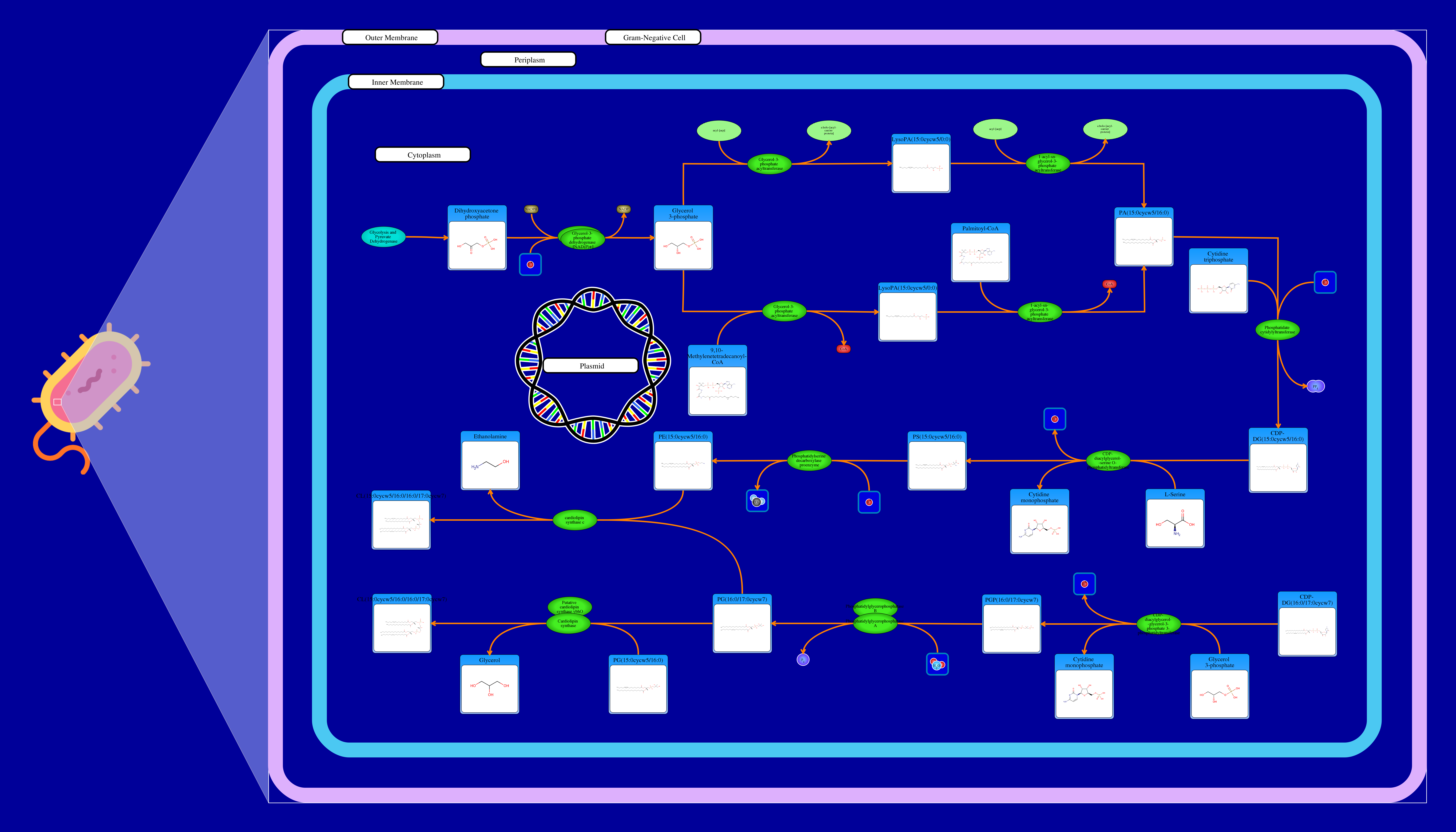 Phospholipids are membrane components in E. coli. The major phospholipids of E. coli are phosphatidylethanolamine, phosphatidylglycerol, and cardiolipin. All phospholipids contain sn-glycerol-3-phosphate esterified with fatty acids at the sn-1 and sn-2 positions. The reaction starts from a glycerone phosphate (dihydroxyacetone phosphate) produced in glycolysis. The glycerone phosphate is transformed into an sn-glycerol 3-phosphate (glycerol 3 phosphate) by NADPH-driven glycerol-3-phosphate dehydrogenase. sn-Glycerol 3-phosphate is transformed to a 1-acyl-sn-glycerol 3-phosphate (lysophosphatidic acid). This can be achieved by an sn-glycerol-3-phosphate acyltransferase that interacts either with a long-chain acyl-CoA or with an acyl-[acp]. The 1-acyl-sn-glycerol 3-phosphate is transformed into a 1,2-diacyl-sn-glycerol 3-phosphate (phosphatidic acid) through a 1-acylglycerol-3-phosphate O-acyltransferase. This compound is then converted into a CPD-diacylglycerol through a CTP phosphatidate cytididyltransferase. CPD-diacylglycerol can be transformed either into an L-1-phosphatidylserine or an L-1-phosphatidylglycerol-phosphate through a phosphatidylserine synthase or a phosphatidylglycerophosphate synthase, respectively. The L-1-phosphatidylserine transforms into L-1-phosphatidylethanolamine through a phosphatidylserine decarboxylase. On the other hand, L-1-phosphatidylglycerol-phosphate gets transformed into an L-1-phosphatidyl-glycerol through a phosphatidylglycerophosphatase. These 2 products combine to produce a cardiolipin and an ethanolamine. The L-1 phosphatidyl-glycerol can also interact with cardiolipin synthase resulting in a glycerol and a cardiolipin.