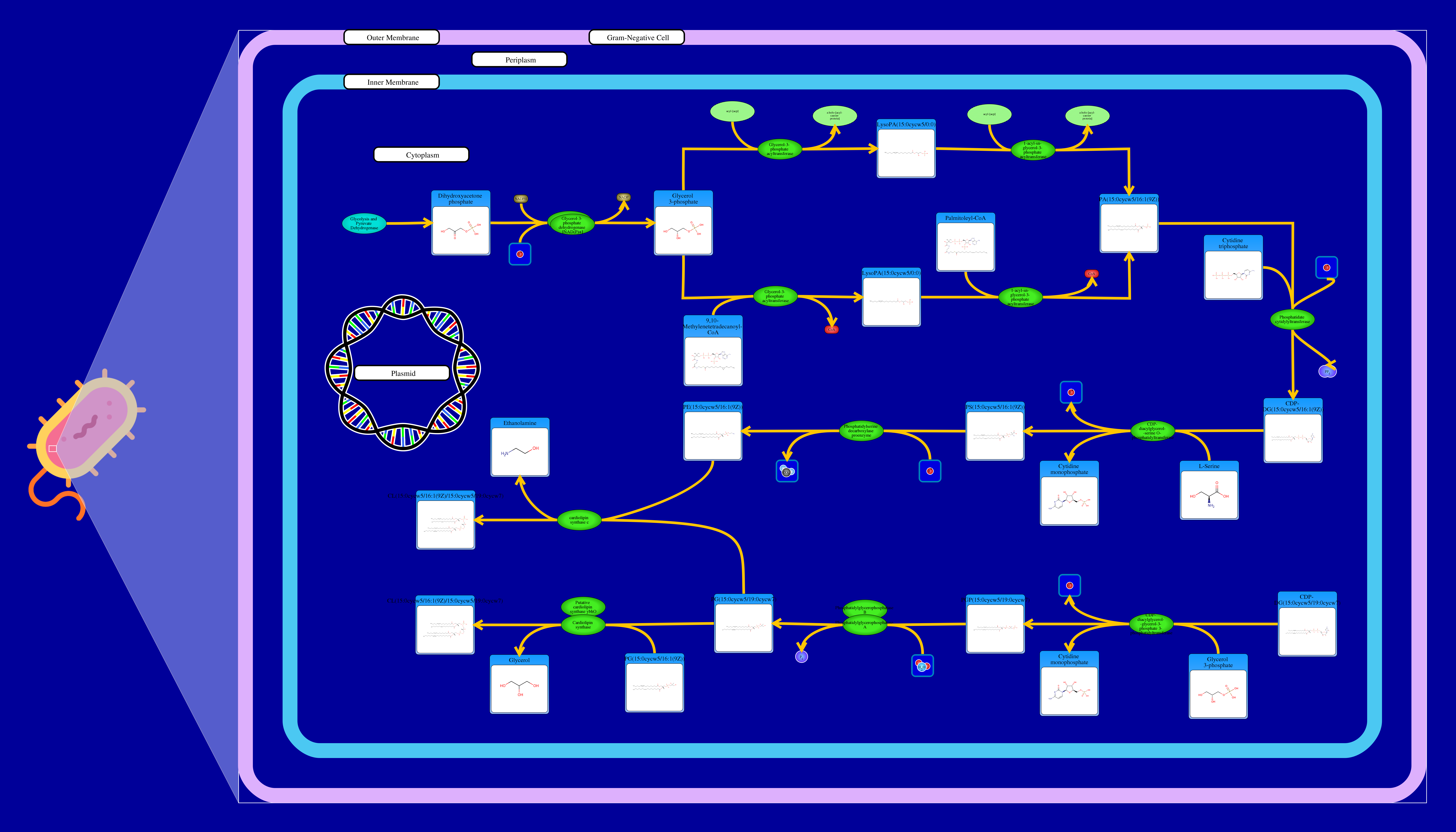 Phospholipids are membrane components in E. coli. The major phospholipids of E. coli are phosphatidylethanolamine, phosphatidylglycerol, and cardiolipin. All phospholipids contain sn-glycerol-3-phosphate esterified with fatty acids at the sn-1 and sn-2 positions. The reaction starts from a glycerone phosphate (dihydroxyacetone phosphate) produced in glycolysis. The glycerone phosphate is transformed into an sn-glycerol 3-phosphate (glycerol 3 phosphate) by NADPH-driven glycerol-3-phosphate dehydrogenase. sn-Glycerol 3-phosphate is transformed to a 1-acyl-sn-glycerol 3-phosphate (lysophosphatidic acid). This can be achieved by an sn-glycerol-3-phosphate acyltransferase that interacts either with a long-chain acyl-CoA or with an acyl-[acp]. The 1-acyl-sn-glycerol 3-phosphate is transformed into a 1,2-diacyl-sn-glycerol 3-phosphate (phosphatidic acid) through a 1-acylglycerol-3-phosphate O-acyltransferase. This compound is then converted into a CPD-diacylglycerol through a CTP phosphatidate cytididyltransferase. CPD-diacylglycerol can be transformed either into an L-1-phosphatidylserine or an L-1-phosphatidylglycerol-phosphate through a phosphatidylserine synthase or a phosphatidylglycerophosphate synthase, respectively. The L-1-phosphatidylserine transforms into L-1-phosphatidylethanolamine through a phosphatidylserine decarboxylase. On the other hand, L-1-phosphatidylglycerol-phosphate gets transformed into an L-1-phosphatidyl-glycerol through a phosphatidylglycerophosphatase. These 2 products combine to produce a cardiolipin and an ethanolamine. The L-1 phosphatidyl-glycerol can also interact with cardiolipin synthase resulting in a glycerol and a cardiolipin.