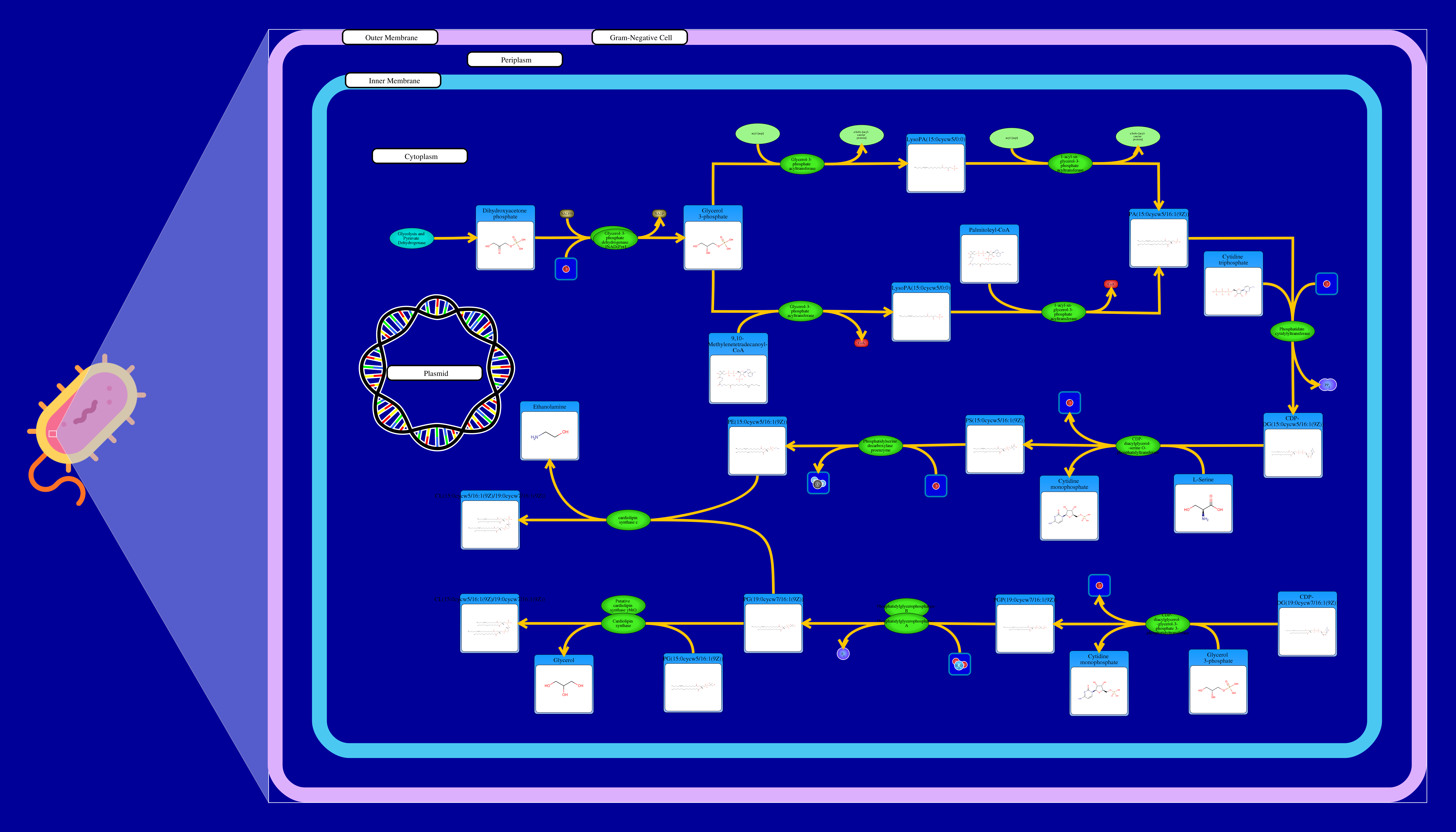 Phospholipids are membrane components in E. coli. The major phospholipids of E. coli are phosphatidylethanolamine, phosphatidylglycerol, and cardiolipin. All phospholipids contain sn-glycerol-3-phosphate esterified with fatty acids at the sn-1 and sn-2 positions. The reaction starts from a glycerone phosphate (dihydroxyacetone phosphate) produced in glycolysis. The glycerone phosphate is transformed into an sn-glycerol 3-phosphate (glycerol 3 phosphate) by NADPH-driven glycerol-3-phosphate dehydrogenase. sn-Glycerol 3-phosphate is transformed to a 1-acyl-sn-glycerol 3-phosphate (lysophosphatidic acid). This can be achieved by an sn-glycerol-3-phosphate acyltransferase that interacts either with a long-chain acyl-CoA or with an acyl-[acp]. The 1-acyl-sn-glycerol 3-phosphate is transformed into a 1,2-diacyl-sn-glycerol 3-phosphate (phosphatidic acid) through a 1-acylglycerol-3-phosphate O-acyltransferase. This compound is then converted into a CPD-diacylglycerol through a CTP phosphatidate cytididyltransferase. CPD-diacylglycerol can be transformed either into an L-1-phosphatidylserine or an L-1-phosphatidylglycerol-phosphate through a phosphatidylserine synthase or a phosphatidylglycerophosphate synthase, respectively. The L-1-phosphatidylserine transforms into L-1-phosphatidylethanolamine through a phosphatidylserine decarboxylase. On the other hand, L-1-phosphatidylglycerol-phosphate gets transformed into an L-1-phosphatidyl-glycerol through a phosphatidylglycerophosphatase. These 2 products combine to produce a cardiolipin and an ethanolamine. The L-1 phosphatidyl-glycerol can also interact with cardiolipin synthase resulting in a glycerol and a cardiolipin.