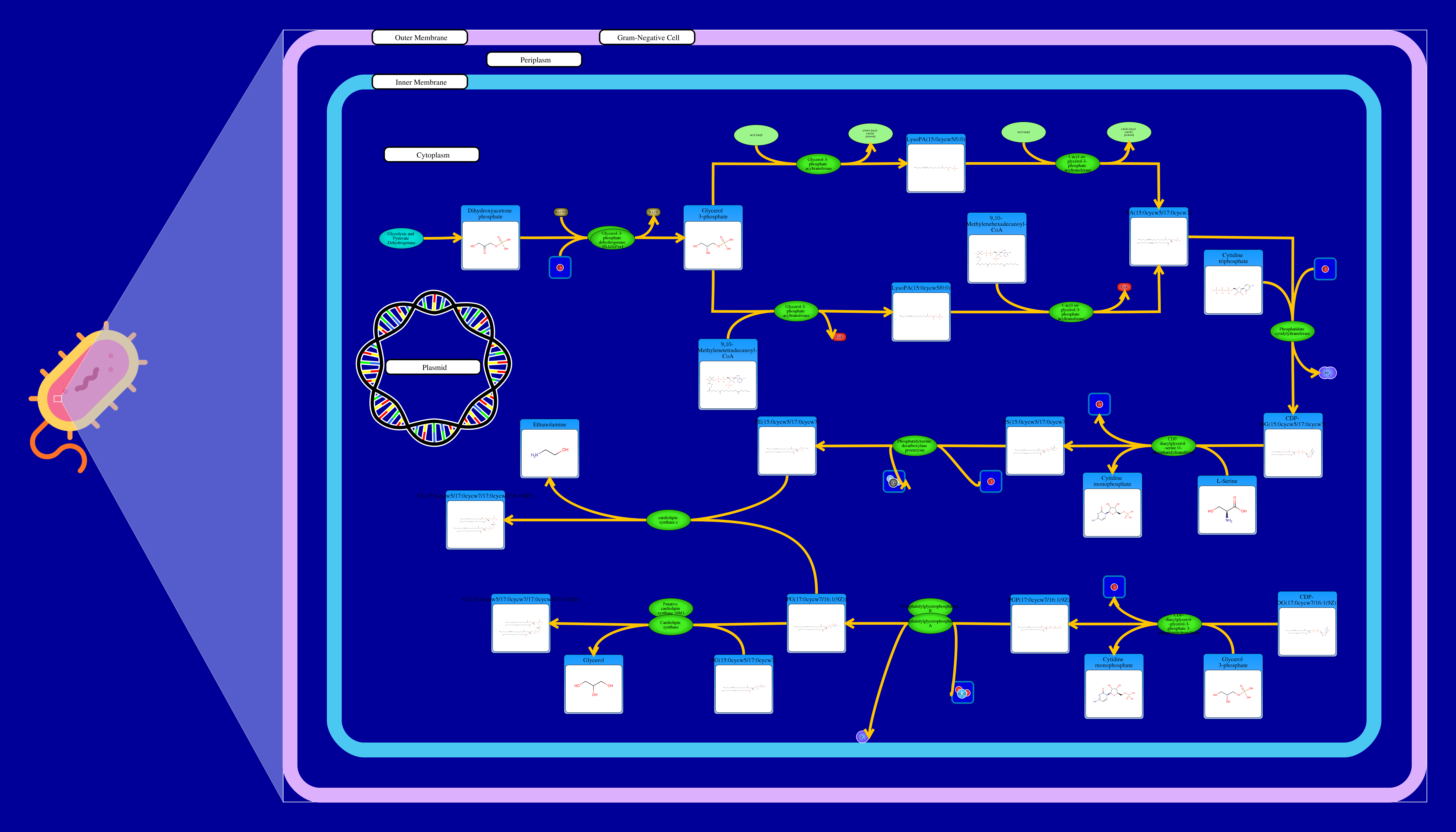 Phospholipids are membrane components in E. coli. The major phospholipids of E. coli are phosphatidylethanolamine, phosphatidylglycerol, and cardiolipin. All phospholipids contain sn-glycerol-3-phosphate esterified with fatty acids at the sn-1 and sn-2 positions. The reaction starts from a glycerone phosphate (dihydroxyacetone phosphate) produced in glycolysis. The glycerone phosphate is transformed into an sn-glycerol 3-phosphate (glycerol 3 phosphate) by NADPH-driven glycerol-3-phosphate dehydrogenase. sn-Glycerol 3-phosphate is transformed to a 1-acyl-sn-glycerol 3-phosphate (lysophosphatidic acid). This can be achieved by an sn-glycerol-3-phosphate acyltransferase that interacts either with a long-chain acyl-CoA or with an acyl-[acp]. The 1-acyl-sn-glycerol 3-phosphate is transformed into a 1,2-diacyl-sn-glycerol 3-phosphate (phosphatidic acid) through a 1-acylglycerol-3-phosphate O-acyltransferase. This compound is then converted into a CPD-diacylglycerol through a CTP phosphatidate cytididyltransferase. CPD-diacylglycerol can be transformed either into an L-1-phosphatidylserine or an L-1-phosphatidylglycerol-phosphate through a phosphatidylserine synthase or a phosphatidylglycerophosphate synthase, respectively. The L-1-phosphatidylserine transforms into L-1-phosphatidylethanolamine through a phosphatidylserine decarboxylase. On the other hand, L-1-phosphatidylglycerol-phosphate gets transformed into an L-1-phosphatidyl-glycerol through a phosphatidylglycerophosphatase. These 2 products combine to produce a cardiolipin and an ethanolamine. The L-1 phosphatidyl-glycerol can also interact with cardiolipin synthase resulting in a glycerol and a cardiolipin.