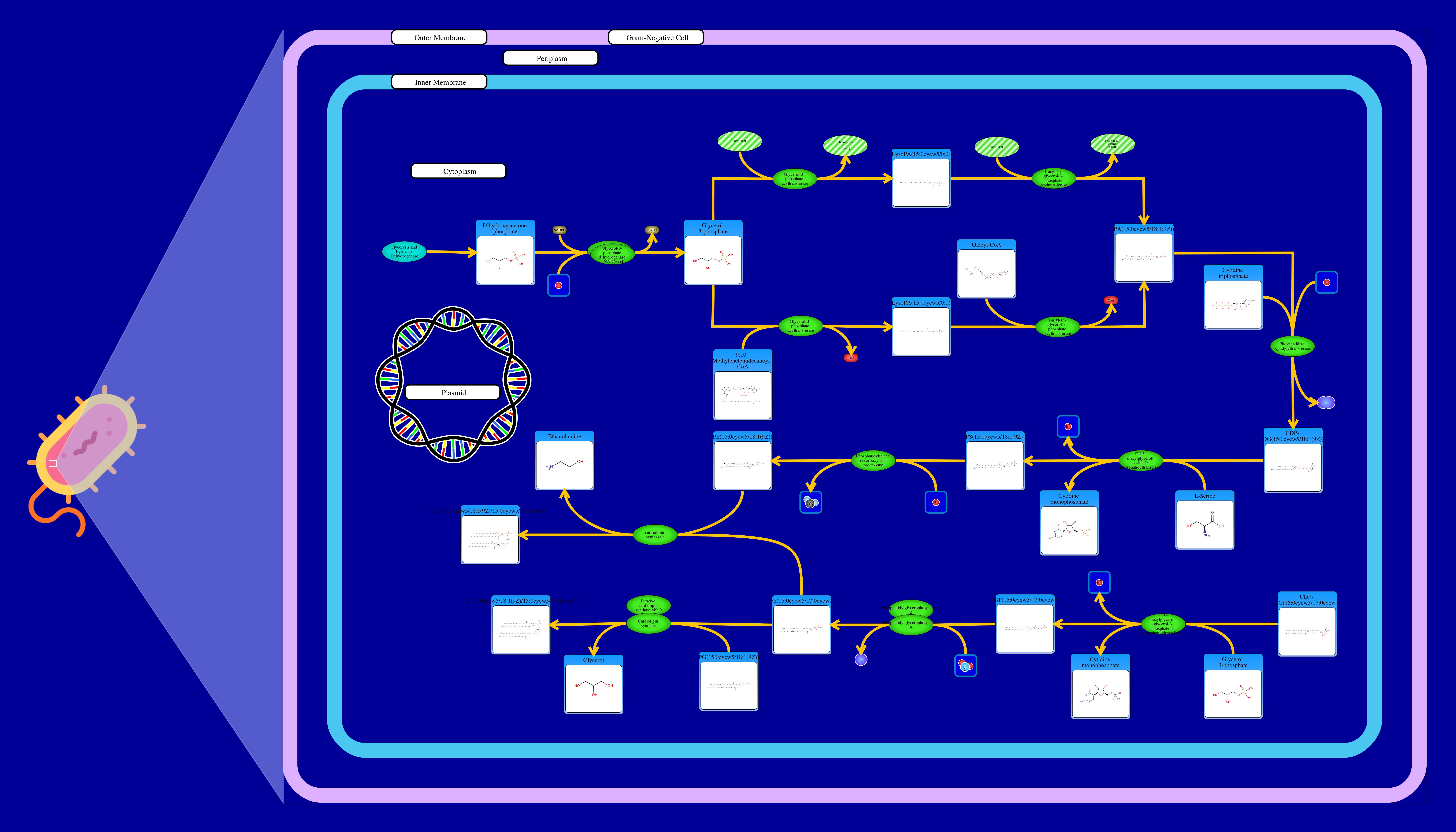 Phospholipids are membrane components in E. coli. The major phospholipids of E. coli are phosphatidylethanolamine, phosphatidylglycerol, and cardiolipin. All phospholipids contain sn-glycerol-3-phosphate esterified with fatty acids at the sn-1 and sn-2 positions. The reaction starts from a glycerone phosphate (dihydroxyacetone phosphate) produced in glycolysis. The glycerone phosphate is transformed into an sn-glycerol 3-phosphate (glycerol 3 phosphate) by NADPH-driven glycerol-3-phosphate dehydrogenase. sn-Glycerol 3-phosphate is transformed to a 1-acyl-sn-glycerol 3-phosphate (lysophosphatidic acid). This can be achieved by an sn-glycerol-3-phosphate acyltransferase that interacts either with a long-chain acyl-CoA or with an acyl-[acp]. The 1-acyl-sn-glycerol 3-phosphate is transformed into a 1,2-diacyl-sn-glycerol 3-phosphate (phosphatidic acid) through a 1-acylglycerol-3-phosphate O-acyltransferase. This compound is then converted into a CPD-diacylglycerol through a CTP phosphatidate cytididyltransferase. CPD-diacylglycerol can be transformed either into an L-1-phosphatidylserine or an L-1-phosphatidylglycerol-phosphate through a phosphatidylserine synthase or a phosphatidylglycerophosphate synthase, respectively. The L-1-phosphatidylserine transforms into L-1-phosphatidylethanolamine through a phosphatidylserine decarboxylase. On the other hand, L-1-phosphatidylglycerol-phosphate gets transformed into an L-1-phosphatidyl-glycerol through a phosphatidylglycerophosphatase. These 2 products combine to produce a cardiolipin and an ethanolamine. The L-1 phosphatidyl-glycerol can also interact with cardiolipin synthase resulting in a glycerol and a cardiolipin.