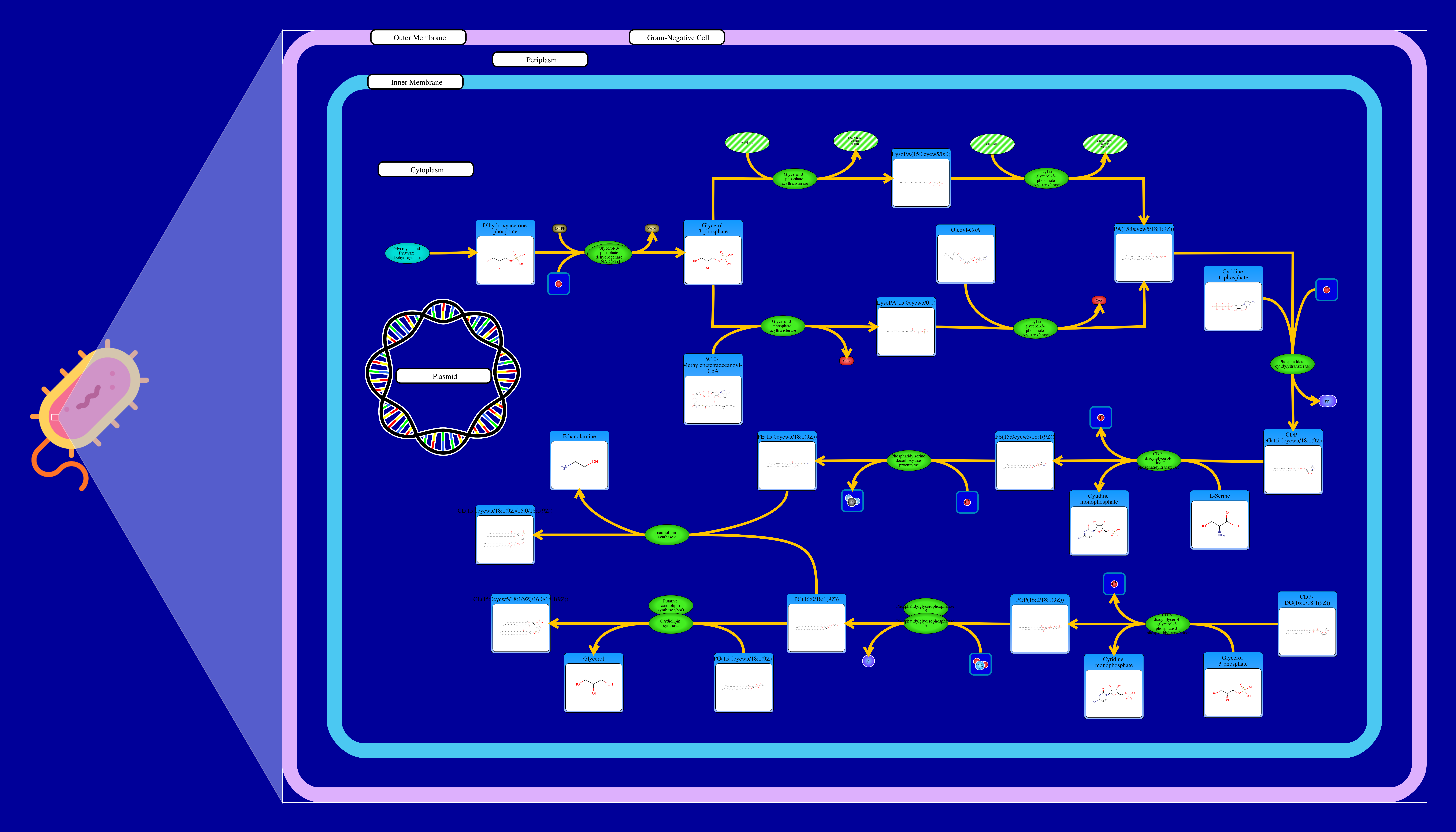 Phospholipids are membrane components in E. coli. The major phospholipids of E. coli are phosphatidylethanolamine, phosphatidylglycerol, and cardiolipin. All phospholipids contain sn-glycerol-3-phosphate esterified with fatty acids at the sn-1 and sn-2 positions. The reaction starts from a glycerone phosphate (dihydroxyacetone phosphate) produced in glycolysis. The glycerone phosphate is transformed into an sn-glycerol 3-phosphate (glycerol 3 phosphate) by NADPH-driven glycerol-3-phosphate dehydrogenase. sn-Glycerol 3-phosphate is transformed to a 1-acyl-sn-glycerol 3-phosphate (lysophosphatidic acid). This can be achieved by an sn-glycerol-3-phosphate acyltransferase that interacts either with a long-chain acyl-CoA or with an acyl-[acp]. The 1-acyl-sn-glycerol 3-phosphate is transformed into a 1,2-diacyl-sn-glycerol 3-phosphate (phosphatidic acid) through a 1-acylglycerol-3-phosphate O-acyltransferase. This compound is then converted into a CPD-diacylglycerol through a CTP phosphatidate cytididyltransferase. CPD-diacylglycerol can be transformed either into an L-1-phosphatidylserine or an L-1-phosphatidylglycerol-phosphate through a phosphatidylserine synthase or a phosphatidylglycerophosphate synthase, respectively. The L-1-phosphatidylserine transforms into L-1-phosphatidylethanolamine through a phosphatidylserine decarboxylase. On the other hand, L-1-phosphatidylglycerol-phosphate gets transformed into an L-1-phosphatidyl-glycerol through a phosphatidylglycerophosphatase. These 2 products combine to produce a cardiolipin and an ethanolamine. The L-1 phosphatidyl-glycerol can also interact with cardiolipin synthase resulting in a glycerol and a cardiolipin.