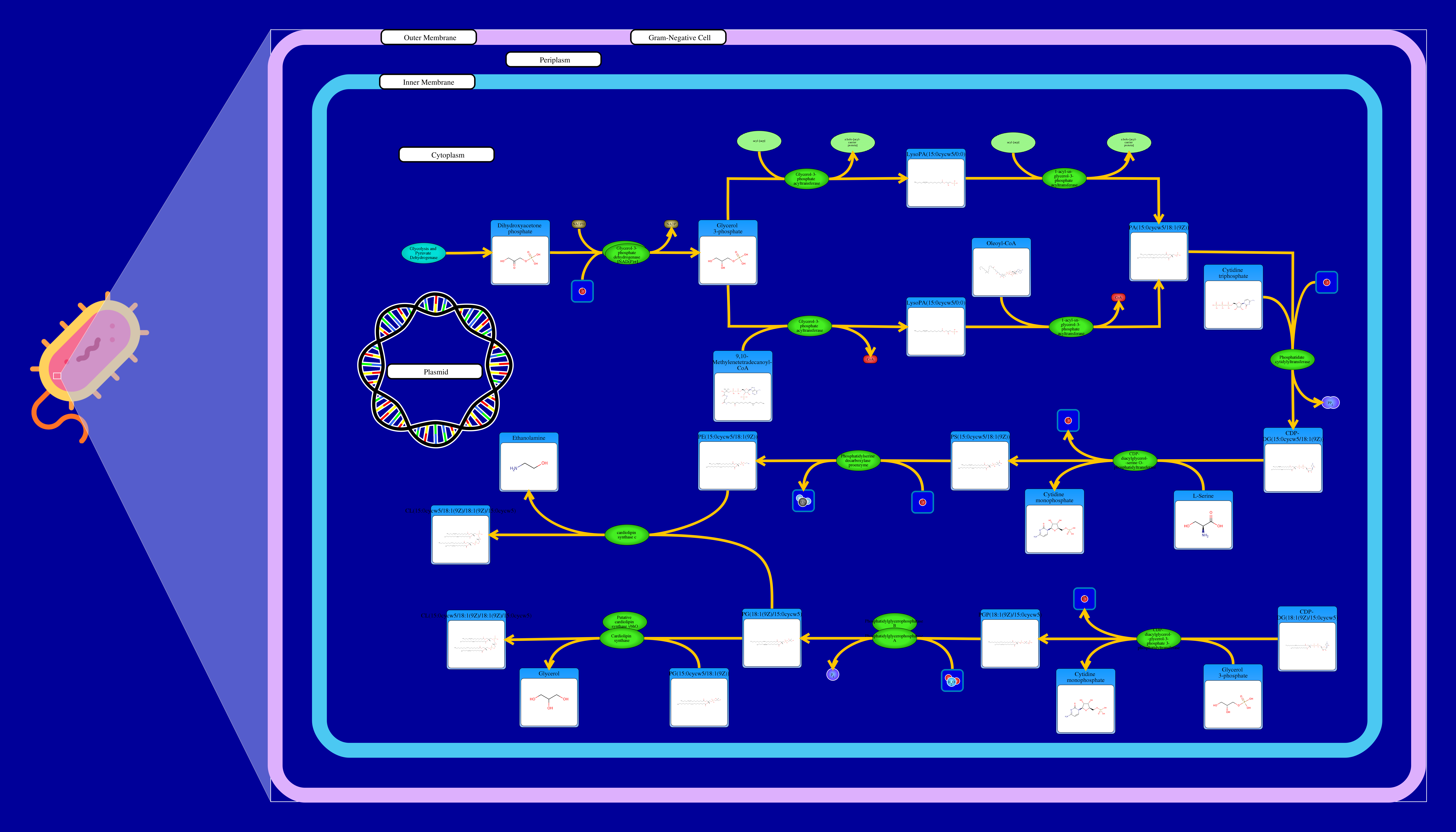 Phospholipids are membrane components in E. coli. The major phospholipids of E. coli are phosphatidylethanolamine, phosphatidylglycerol, and cardiolipin. All phospholipids contain sn-glycerol-3-phosphate esterified with fatty acids at the sn-1 and sn-2 positions. The reaction starts from a glycerone phosphate (dihydroxyacetone phosphate) produced in glycolysis. The glycerone phosphate is transformed into an sn-glycerol 3-phosphate (glycerol 3 phosphate) by NADPH-driven glycerol-3-phosphate dehydrogenase. sn-Glycerol 3-phosphate is transformed to a 1-acyl-sn-glycerol 3-phosphate (lysophosphatidic acid). This can be achieved by an sn-glycerol-3-phosphate acyltransferase that interacts either with a long-chain acyl-CoA or with an acyl-[acp]. The 1-acyl-sn-glycerol 3-phosphate is transformed into a 1,2-diacyl-sn-glycerol 3-phosphate (phosphatidic acid) through a 1-acylglycerol-3-phosphate O-acyltransferase. This compound is then converted into a CPD-diacylglycerol through a CTP phosphatidate cytididyltransferase. CPD-diacylglycerol can be transformed either into an L-1-phosphatidylserine or an L-1-phosphatidylglycerol-phosphate through a phosphatidylserine synthase or a phosphatidylglycerophosphate synthase, respectively. The L-1-phosphatidylserine transforms into L-1-phosphatidylethanolamine through a phosphatidylserine decarboxylase. On the other hand, L-1-phosphatidylglycerol-phosphate gets transformed into an L-1-phosphatidyl-glycerol through a phosphatidylglycerophosphatase. These 2 products combine to produce a cardiolipin and an ethanolamine. The L-1 phosphatidyl-glycerol can also interact with cardiolipin synthase resulting in a glycerol and a cardiolipin.
