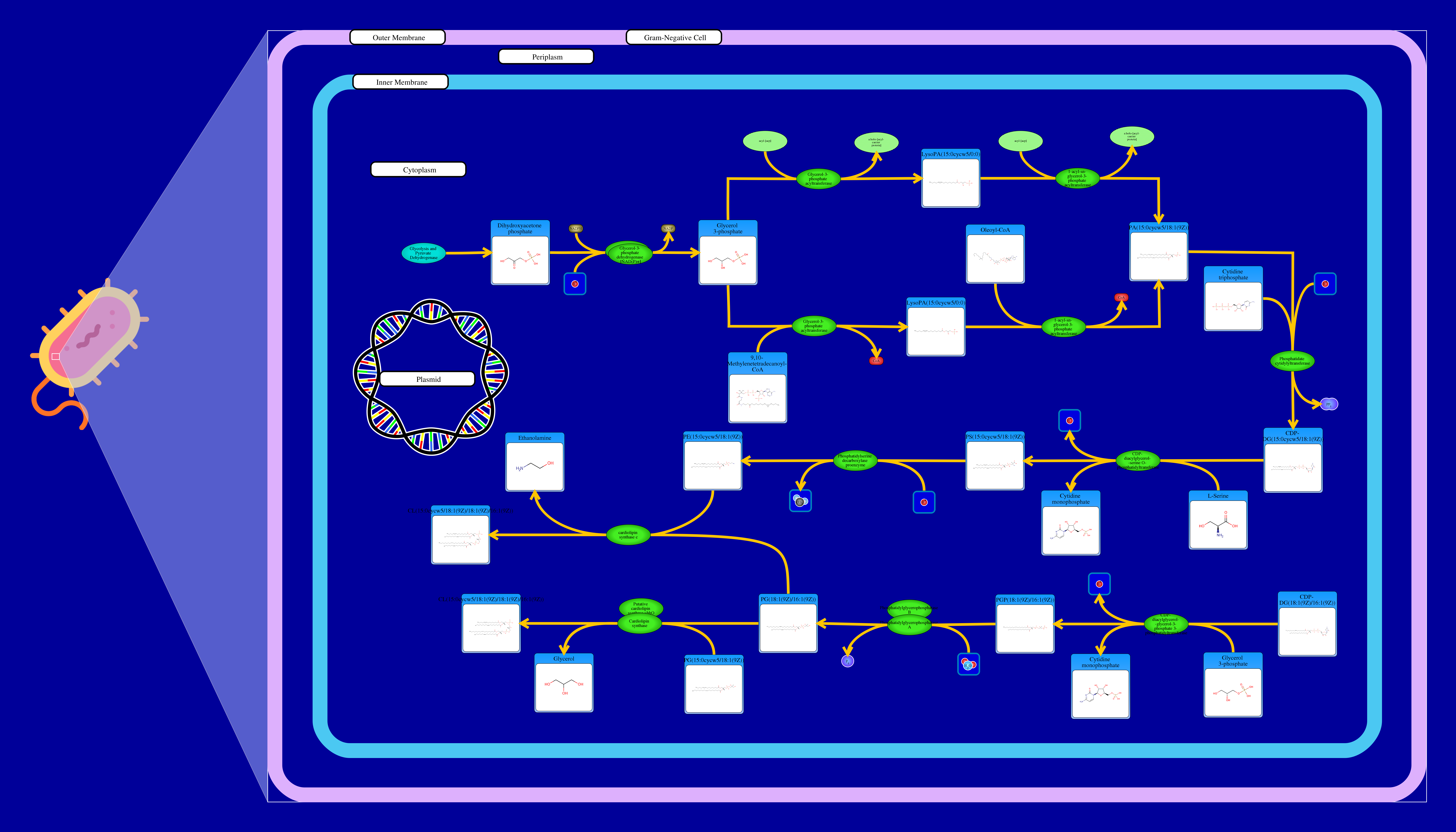 Phospholipids are membrane components in E. coli. The major phospholipids of E. coli are phosphatidylethanolamine, phosphatidylglycerol, and cardiolipin. All phospholipids contain sn-glycerol-3-phosphate esterified with fatty acids at the sn-1 and sn-2 positions. The reaction starts from a glycerone phosphate (dihydroxyacetone phosphate) produced in glycolysis. The glycerone phosphate is transformed into an sn-glycerol 3-phosphate (glycerol 3 phosphate) by NADPH-driven glycerol-3-phosphate dehydrogenase. sn-Glycerol 3-phosphate is transformed to a 1-acyl-sn-glycerol 3-phosphate (lysophosphatidic acid). This can be achieved by an sn-glycerol-3-phosphate acyltransferase that interacts either with a long-chain acyl-CoA or with an acyl-[acp]. The 1-acyl-sn-glycerol 3-phosphate is transformed into a 1,2-diacyl-sn-glycerol 3-phosphate (phosphatidic acid) through a 1-acylglycerol-3-phosphate O-acyltransferase. This compound is then converted into a CPD-diacylglycerol through a CTP phosphatidate cytididyltransferase. CPD-diacylglycerol can be transformed either into an L-1-phosphatidylserine or an L-1-phosphatidylglycerol-phosphate through a phosphatidylserine synthase or a phosphatidylglycerophosphate synthase, respectively. The L-1-phosphatidylserine transforms into L-1-phosphatidylethanolamine through a phosphatidylserine decarboxylase. On the other hand, L-1-phosphatidylglycerol-phosphate gets transformed into an L-1-phosphatidyl-glycerol through a phosphatidylglycerophosphatase. These 2 products combine to produce a cardiolipin and an ethanolamine. The L-1 phosphatidyl-glycerol can also interact with cardiolipin synthase resulting in a glycerol and a cardiolipin.
