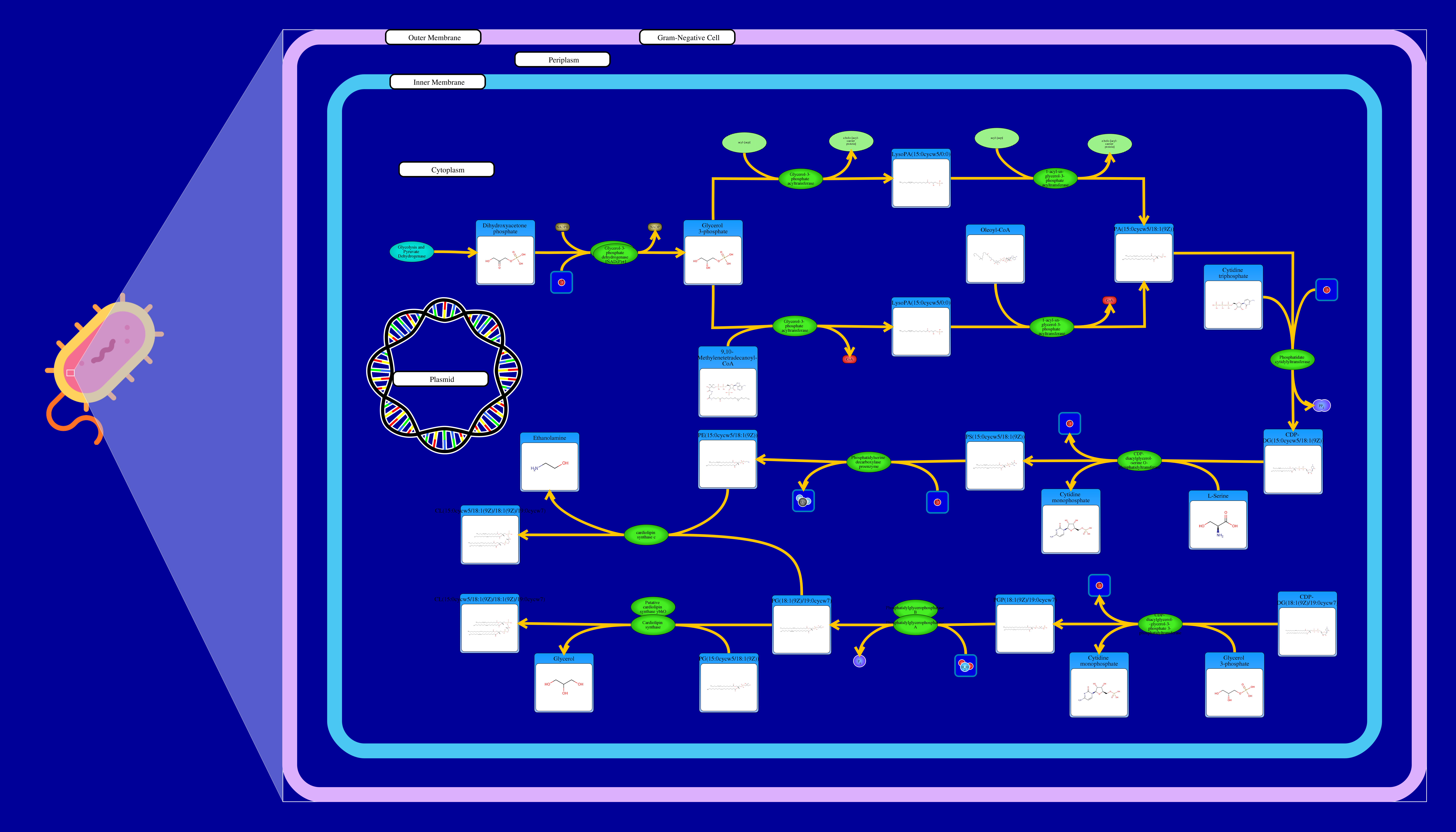 Phospholipids are membrane components in E. coli. The major phospholipids of E. coli are phosphatidylethanolamine, phosphatidylglycerol, and cardiolipin. All phospholipids contain sn-glycerol-3-phosphate esterified with fatty acids at the sn-1 and sn-2 positions. The reaction starts from a glycerone phosphate (dihydroxyacetone phosphate) produced in glycolysis. The glycerone phosphate is transformed into an sn-glycerol 3-phosphate (glycerol 3 phosphate) by NADPH-driven glycerol-3-phosphate dehydrogenase. sn-Glycerol 3-phosphate is transformed to a 1-acyl-sn-glycerol 3-phosphate (lysophosphatidic acid). This can be achieved by an sn-glycerol-3-phosphate acyltransferase that interacts either with a long-chain acyl-CoA or with an acyl-[acp]. The 1-acyl-sn-glycerol 3-phosphate is transformed into a 1,2-diacyl-sn-glycerol 3-phosphate (phosphatidic acid) through a 1-acylglycerol-3-phosphate O-acyltransferase. This compound is then converted into a CPD-diacylglycerol through a CTP phosphatidate cytididyltransferase. CPD-diacylglycerol can be transformed either into an L-1-phosphatidylserine or an L-1-phosphatidylglycerol-phosphate through a phosphatidylserine synthase or a phosphatidylglycerophosphate synthase, respectively. The L-1-phosphatidylserine transforms into L-1-phosphatidylethanolamine through a phosphatidylserine decarboxylase. On the other hand, L-1-phosphatidylglycerol-phosphate gets transformed into an L-1-phosphatidyl-glycerol through a phosphatidylglycerophosphatase. These 2 products combine to produce a cardiolipin and an ethanolamine. The L-1 phosphatidyl-glycerol can also interact with cardiolipin synthase resulting in a glycerol and a cardiolipin.