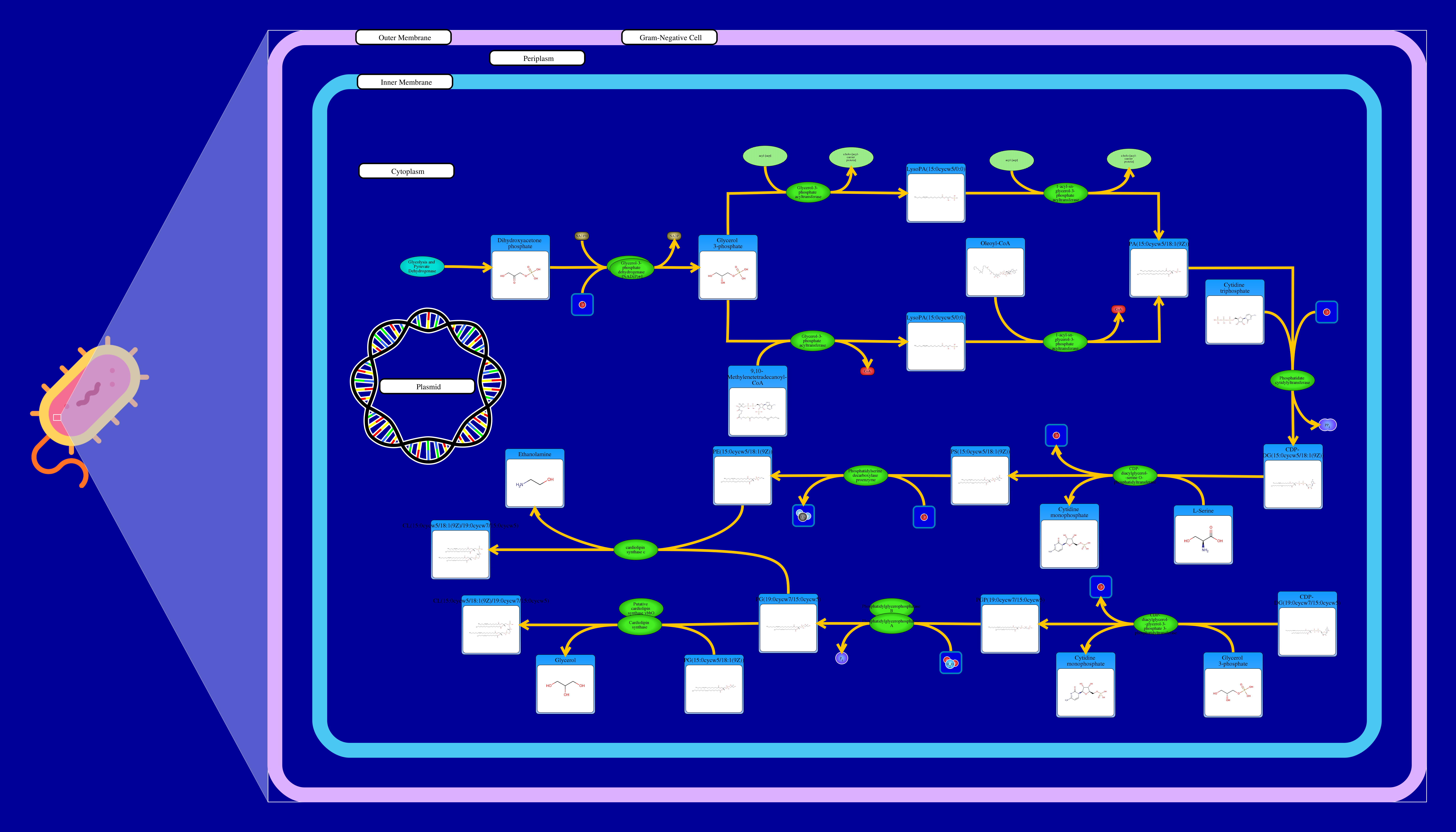 Phospholipids are membrane components in E. coli. The major phospholipids of E. coli are phosphatidylethanolamine, phosphatidylglycerol, and cardiolipin. All phospholipids contain sn-glycerol-3-phosphate esterified with fatty acids at the sn-1 and sn-2 positions. The reaction starts from a glycerone phosphate (dihydroxyacetone phosphate) produced in glycolysis. The glycerone phosphate is transformed into an sn-glycerol 3-phosphate (glycerol 3 phosphate) by NADPH-driven glycerol-3-phosphate dehydrogenase. sn-Glycerol 3-phosphate is transformed to a 1-acyl-sn-glycerol 3-phosphate (lysophosphatidic acid). This can be achieved by an sn-glycerol-3-phosphate acyltransferase that interacts either with a long-chain acyl-CoA or with an acyl-[acp]. The 1-acyl-sn-glycerol 3-phosphate is transformed into a 1,2-diacyl-sn-glycerol 3-phosphate (phosphatidic acid) through a 1-acylglycerol-3-phosphate O-acyltransferase. This compound is then converted into a CPD-diacylglycerol through a CTP phosphatidate cytididyltransferase. CPD-diacylglycerol can be transformed either into an L-1-phosphatidylserine or an L-1-phosphatidylglycerol-phosphate through a phosphatidylserine synthase or a phosphatidylglycerophosphate synthase, respectively. The L-1-phosphatidylserine transforms into L-1-phosphatidylethanolamine through a phosphatidylserine decarboxylase. On the other hand, L-1-phosphatidylglycerol-phosphate gets transformed into an L-1-phosphatidyl-glycerol through a phosphatidylglycerophosphatase. These 2 products combine to produce a cardiolipin and an ethanolamine. The L-1 phosphatidyl-glycerol can also interact with cardiolipin synthase resulting in a glycerol and a cardiolipin.