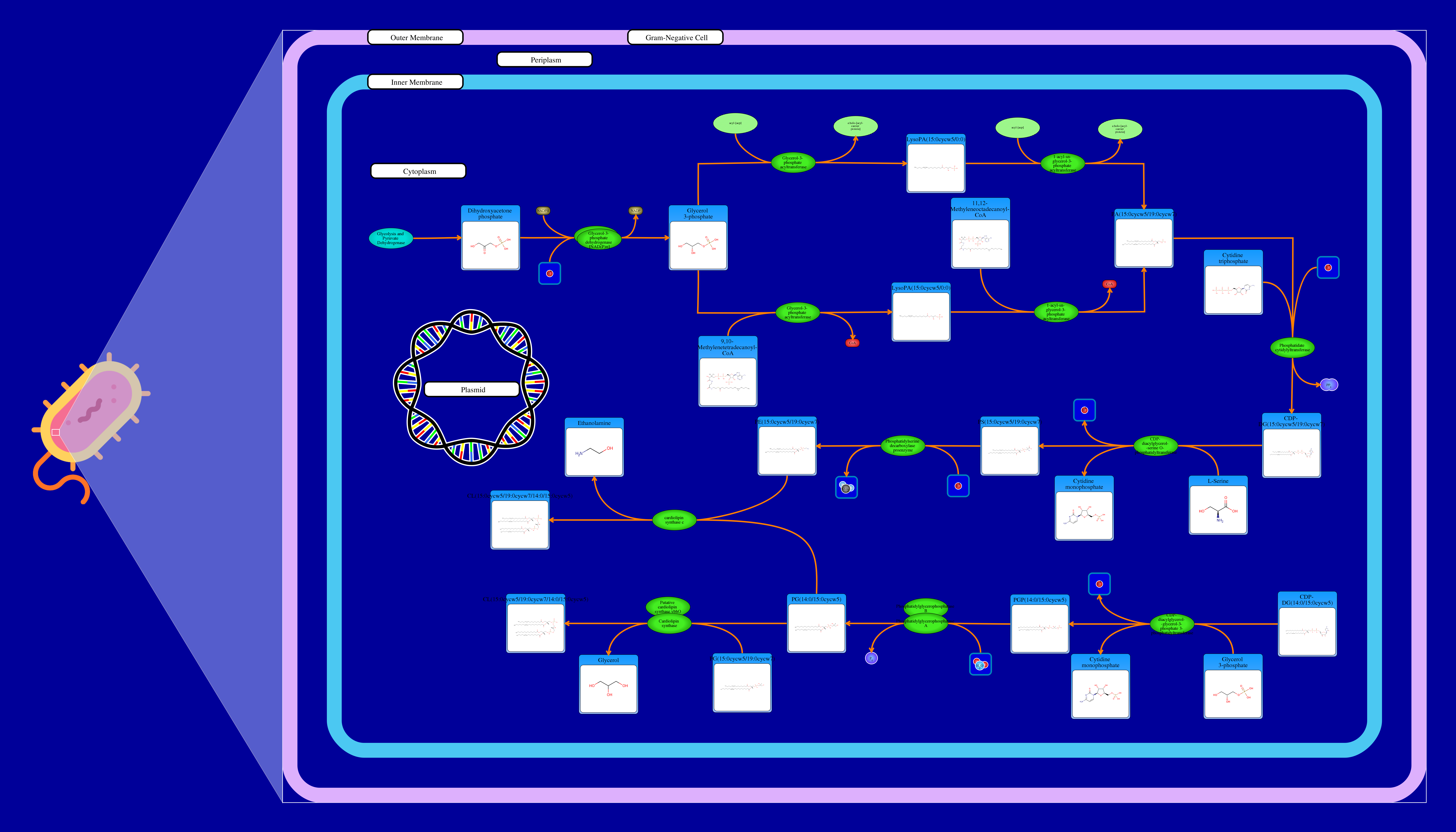 Phospholipids are membrane components in E. coli. The major phospholipids of E. coli are phosphatidylethanolamine, phosphatidylglycerol, and cardiolipin. All phospholipids contain sn-glycerol-3-phosphate esterified with fatty acids at the sn-1 and sn-2 positions. The reaction starts from a glycerone phosphate (dihydroxyacetone phosphate) produced in glycolysis. The glycerone phosphate is transformed into an sn-glycerol 3-phosphate (glycerol 3 phosphate) by NADPH-driven glycerol-3-phosphate dehydrogenase. sn-Glycerol 3-phosphate is transformed to a 1-acyl-sn-glycerol 3-phosphate (lysophosphatidic acid). This can be achieved by an sn-glycerol-3-phosphate acyltransferase that interacts either with a long-chain acyl-CoA or with an acyl-[acp]. The 1-acyl-sn-glycerol 3-phosphate is transformed into a 1,2-diacyl-sn-glycerol 3-phosphate (phosphatidic acid) through a 1-acylglycerol-3-phosphate O-acyltransferase. This compound is then converted into a CPD-diacylglycerol through a CTP phosphatidate cytididyltransferase. CPD-diacylglycerol can be transformed either into an L-1-phosphatidylserine or an L-1-phosphatidylglycerol-phosphate through a phosphatidylserine synthase or a phosphatidylglycerophosphate synthase, respectively. The L-1-phosphatidylserine transforms into L-1-phosphatidylethanolamine through a phosphatidylserine decarboxylase. On the other hand, L-1-phosphatidylglycerol-phosphate gets transformed into an L-1-phosphatidyl-glycerol through a phosphatidylglycerophosphatase. These 2 products combine to produce a cardiolipin and an ethanolamine. The L-1 phosphatidyl-glycerol can also interact with cardiolipin synthase resulting in a glycerol and a cardiolipin.