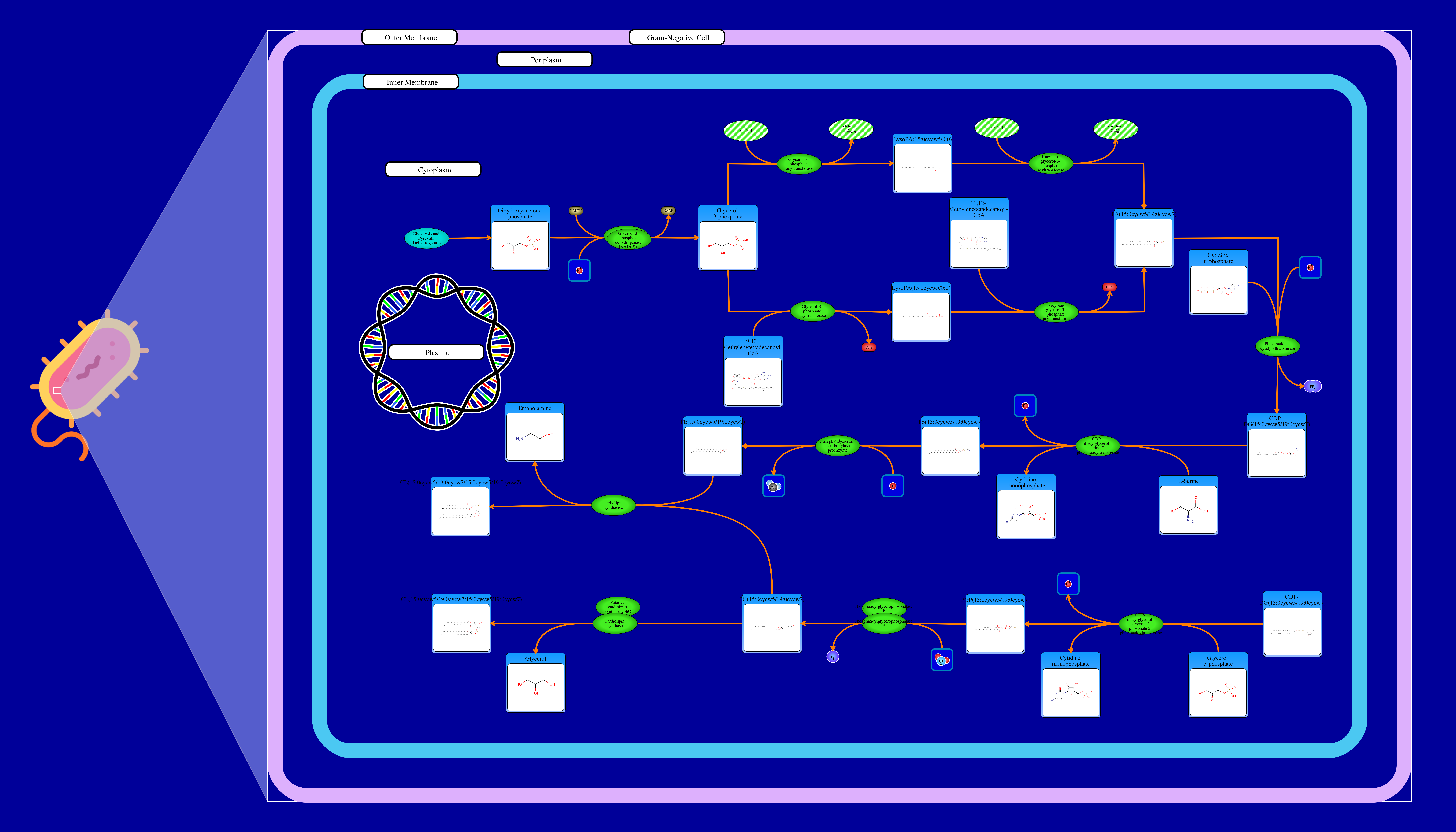 Phospholipids are membrane components in E. coli. The major phospholipids of E. coli are phosphatidylethanolamine, phosphatidylglycerol, and cardiolipin. All phospholipids contain sn-glycerol-3-phosphate esterified with fatty acids at the sn-1 and sn-2 positions. The reaction starts from a glycerone phosphate (dihydroxyacetone phosphate) produced in glycolysis. The glycerone phosphate is transformed into an sn-glycerol 3-phosphate (glycerol 3 phosphate) by NADPH-driven glycerol-3-phosphate dehydrogenase. sn-Glycerol 3-phosphate is transformed to a 1-acyl-sn-glycerol 3-phosphate (lysophosphatidic acid). This can be achieved by an sn-glycerol-3-phosphate acyltransferase that interacts either with a long-chain acyl-CoA or with an acyl-[acp]. The 1-acyl-sn-glycerol 3-phosphate is transformed into a 1,2-diacyl-sn-glycerol 3-phosphate (phosphatidic acid) through a 1-acylglycerol-3-phosphate O-acyltransferase. This compound is then converted into a CPD-diacylglycerol through a CTP phosphatidate cytididyltransferase. CPD-diacylglycerol can be transformed either into an L-1-phosphatidylserine or an L-1-phosphatidylglycerol-phosphate through a phosphatidylserine synthase or a phosphatidylglycerophosphate synthase, respectively. The L-1-phosphatidylserine transforms into L-1-phosphatidylethanolamine through a phosphatidylserine decarboxylase. On the other hand, L-1-phosphatidylglycerol-phosphate gets transformed into an L-1-phosphatidyl-glycerol through a phosphatidylglycerophosphatase. These 2 products combine to produce a cardiolipin and an ethanolamine. The L-1 phosphatidyl-glycerol can also interact with cardiolipin synthase resulting in a glycerol and a cardiolipin.