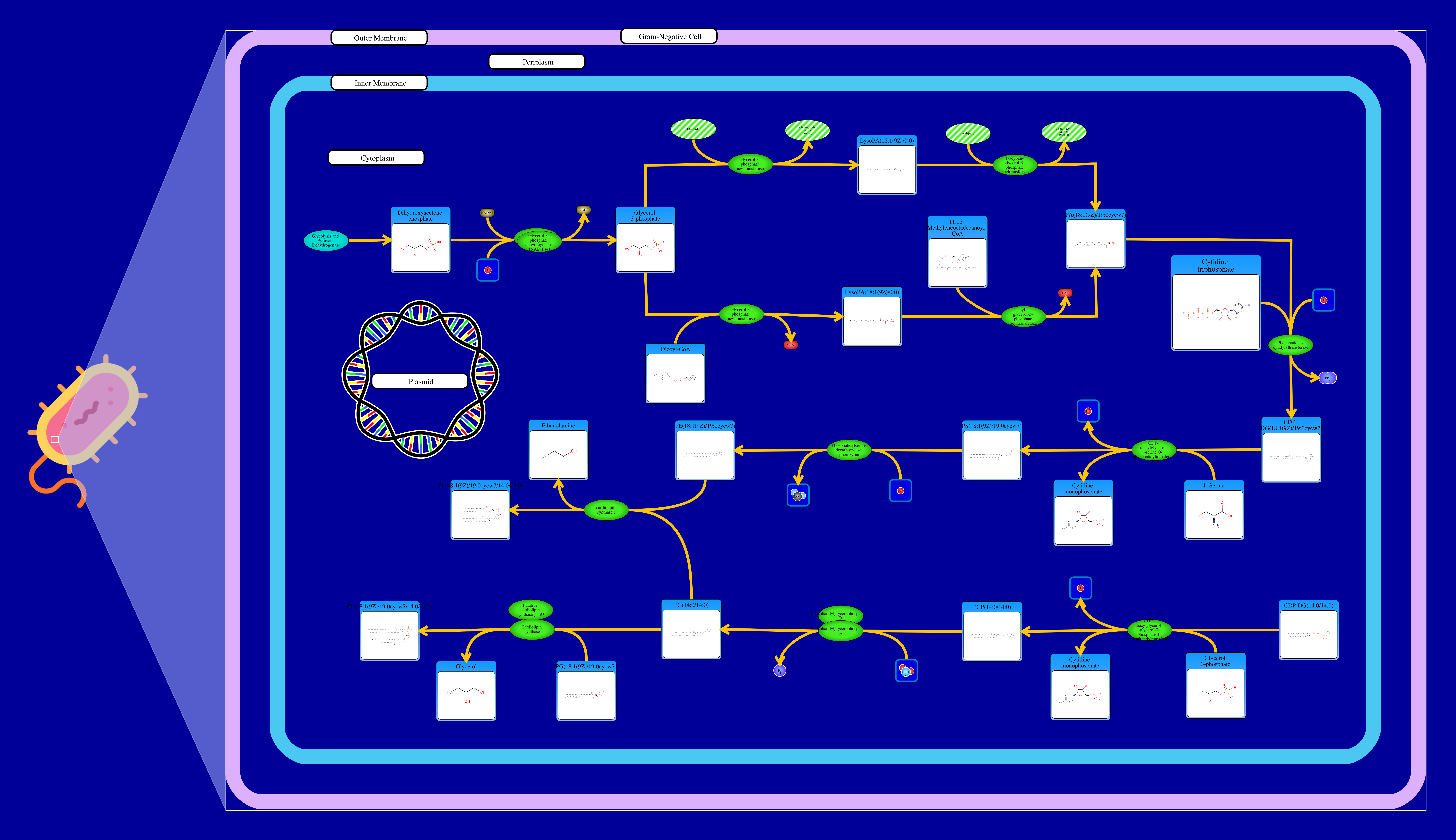 Phospholipids are membrane components in E. coli. The major phospholipids of E. coli are phosphatidylethanolamine, phosphatidylglycerol, and cardiolipin. All phospholipids contain sn-glycerol-3-phosphate esterified with fatty acids at the sn-1 and sn-2 positions. The reaction starts from a glycerone phosphate (dihydroxyacetone phosphate) produced in glycolysis. The glycerone phosphate is transformed into an sn-glycerol 3-phosphate (glycerol 3 phosphate) by NADPH-driven glycerol-3-phosphate dehydrogenase. sn-Glycerol 3-phosphate is transformed to a 1-acyl-sn-glycerol 3-phosphate (lysophosphatidic acid). This can be achieved by an sn-glycerol-3-phosphate acyltransferase that interacts either with a long-chain acyl-CoA or with an acyl-[acp]. The 1-acyl-sn-glycerol 3-phosphate is transformed into a 1,2-diacyl-sn-glycerol 3-phosphate (phosphatidic acid) through a 1-acylglycerol-3-phosphate O-acyltransferase. This compound is then converted into a CPD-diacylglycerol through a CTP phosphatidate cytididyltransferase. CPD-diacylglycerol can be transformed either into an L-1-phosphatidylserine or an L-1-phosphatidylglycerol-phosphate through a phosphatidylserine synthase or a phosphatidylglycerophosphate synthase, respectively. The L-1-phosphatidylserine transforms into L-1-phosphatidylethanolamine through a phosphatidylserine decarboxylase. On the other hand, L-1-phosphatidylglycerol-phosphate gets transformed into an L-1-phosphatidyl-glycerol through a phosphatidylglycerophosphatase. These 2 products combine to produce a cardiolipin and an ethanolamine. The L-1 phosphatidyl-glycerol can also interact with cardiolipin synthase resulting in a glycerol and a cardiolipin.
