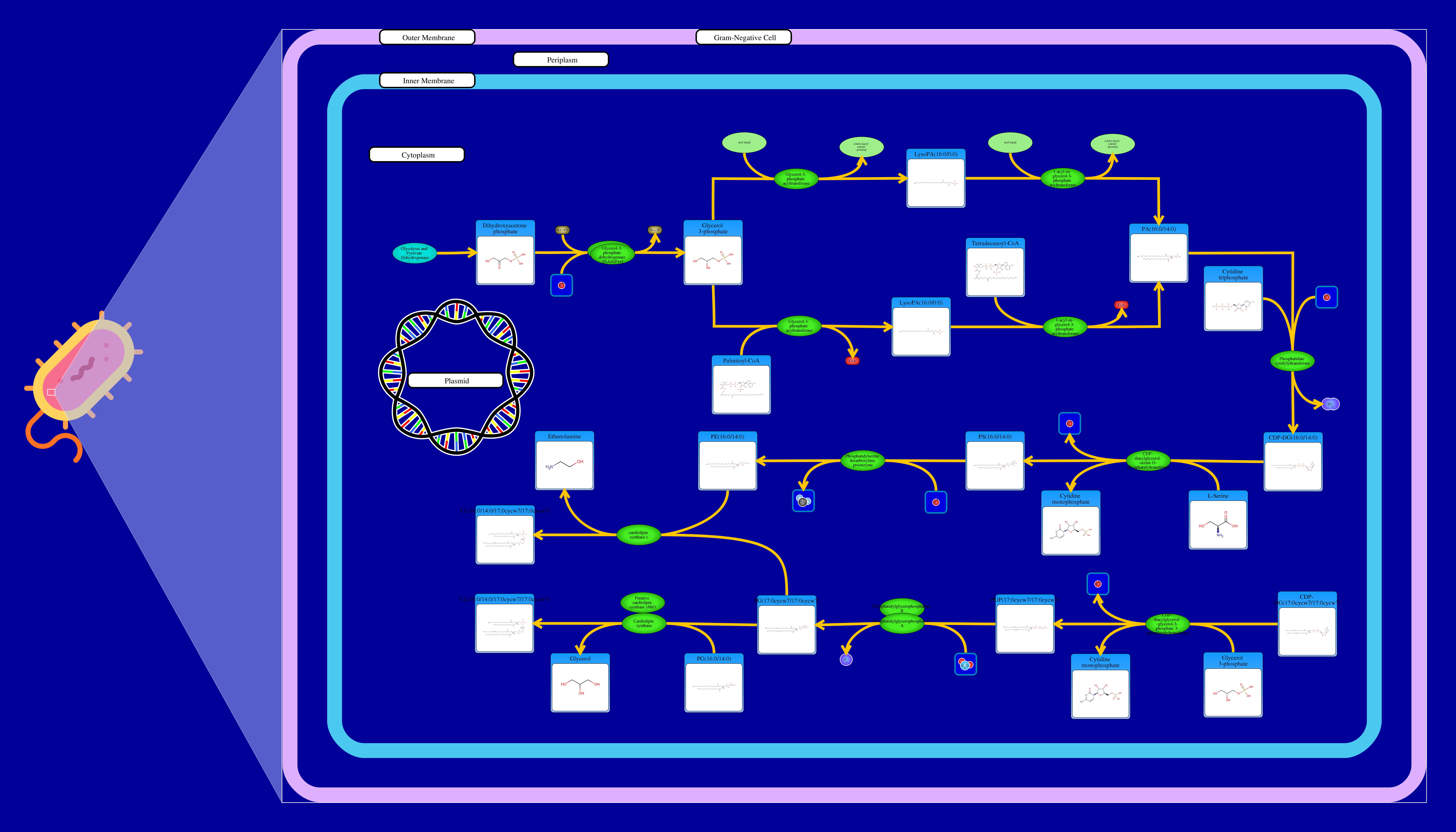 Phospholipids are membrane components in E. coli. The major phospholipids of E. coli are phosphatidylethanolamine, phosphatidylglycerol, and cardiolipin. All phospholipids contain sn-glycerol-3-phosphate esterified with fatty acids at the sn-1 and sn-2 positions. The reaction starts from a glycerone phosphate (dihydroxyacetone phosphate) produced in glycolysis. The glycerone phosphate is transformed into an sn-glycerol 3-phosphate (glycerol 3 phosphate) by NADPH-driven glycerol-3-phosphate dehydrogenase. sn-Glycerol 3-phosphate is transformed to a 1-acyl-sn-glycerol 3-phosphate (lysophosphatidic acid). This can be achieved by an sn-glycerol-3-phosphate acyltransferase that interacts either with a long-chain acyl-CoA or with an acyl-[acp]. The 1-acyl-sn-glycerol 3-phosphate is transformed into a 1,2-diacyl-sn-glycerol 3-phosphate (phosphatidic acid) through a 1-acylglycerol-3-phosphate O-acyltransferase. This compound is then converted into a CPD-diacylglycerol through a CTP phosphatidate cytididyltransferase. CPD-diacylglycerol can be transformed either into an L-1-phosphatidylserine or an L-1-phosphatidylglycerol-phosphate through a phosphatidylserine synthase or a phosphatidylglycerophosphate synthase, respectively. The L-1-phosphatidylserine transforms into L-1-phosphatidylethanolamine through a phosphatidylserine decarboxylase. On the other hand, L-1-phosphatidylglycerol-phosphate gets transformed into an L-1-phosphatidyl-glycerol through a phosphatidylglycerophosphatase. These 2 products combine to produce a cardiolipin and an ethanolamine. The L-1 phosphatidyl-glycerol can also interact with cardiolipin synthase resulting in a glycerol and a cardiolipin.