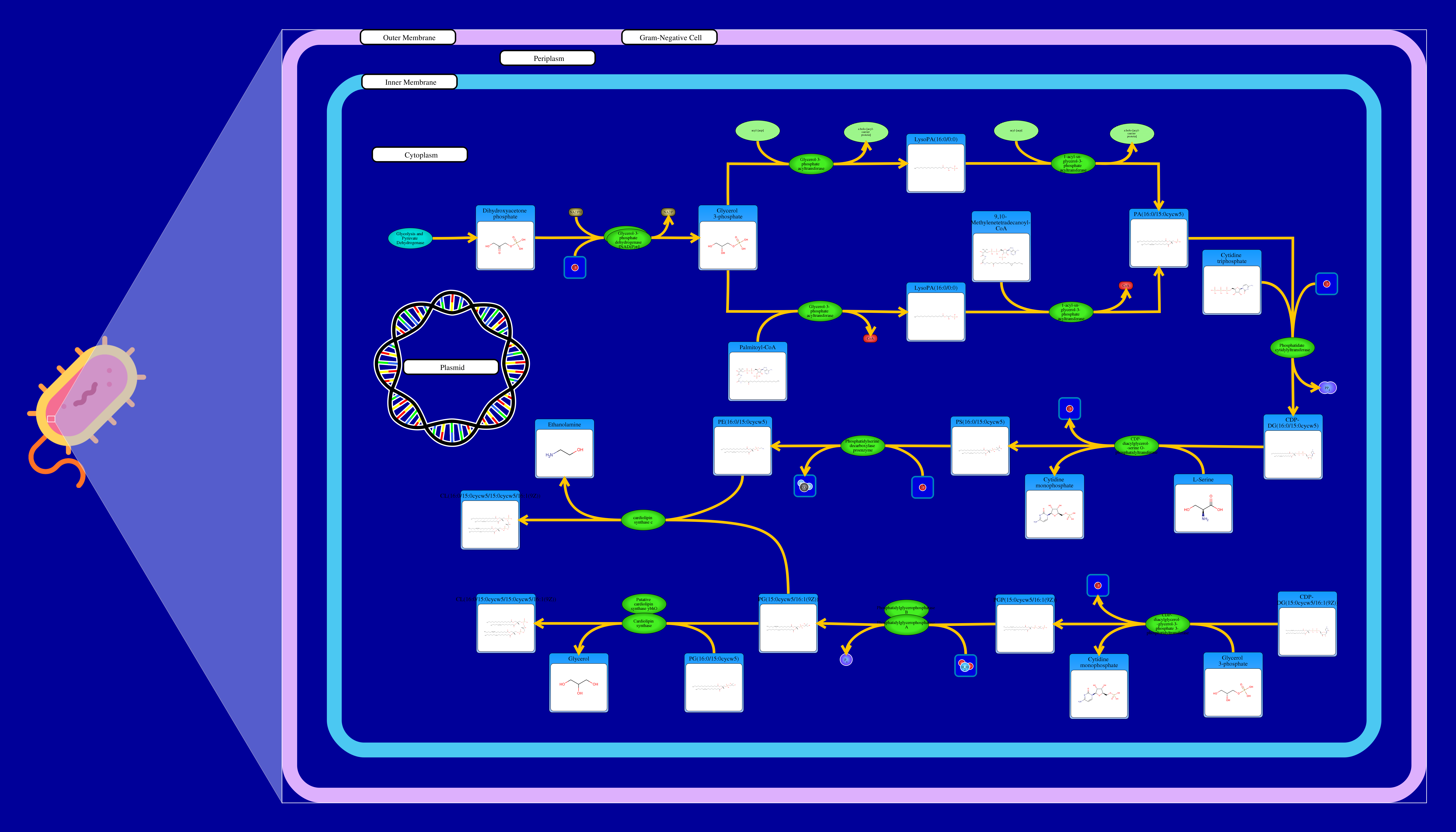 Phospholipids are membrane components in E. coli. The major phospholipids of E. coli are phosphatidylethanolamine, phosphatidylglycerol, and cardiolipin. All phospholipids contain sn-glycerol-3-phosphate esterified with fatty acids at the sn-1 and sn-2 positions. The reaction starts from a glycerone phosphate (dihydroxyacetone phosphate) produced in glycolysis. The glycerone phosphate is transformed into an sn-glycerol 3-phosphate (glycerol 3 phosphate) by NADPH-driven glycerol-3-phosphate dehydrogenase. sn-Glycerol 3-phosphate is transformed to a 1-acyl-sn-glycerol 3-phosphate (lysophosphatidic acid). This can be achieved by an sn-glycerol-3-phosphate acyltransferase that interacts either with a long-chain acyl-CoA or with an acyl-[acp]. The 1-acyl-sn-glycerol 3-phosphate is transformed into a 1,2-diacyl-sn-glycerol 3-phosphate (phosphatidic acid) through a 1-acylglycerol-3-phosphate O-acyltransferase. This compound is then converted into a CPD-diacylglycerol through a CTP phosphatidate cytididyltransferase. CPD-diacylglycerol can be transformed either into an L-1-phosphatidylserine or an L-1-phosphatidylglycerol-phosphate through a phosphatidylserine synthase or a phosphatidylglycerophosphate synthase, respectively. The L-1-phosphatidylserine transforms into L-1-phosphatidylethanolamine through a phosphatidylserine decarboxylase. On the other hand, L-1-phosphatidylglycerol-phosphate gets transformed into an L-1-phosphatidyl-glycerol through a phosphatidylglycerophosphatase. These 2 products combine to produce a cardiolipin and an ethanolamine. The L-1 phosphatidyl-glycerol can also interact with cardiolipin synthase resulting in a glycerol and a cardiolipin.
