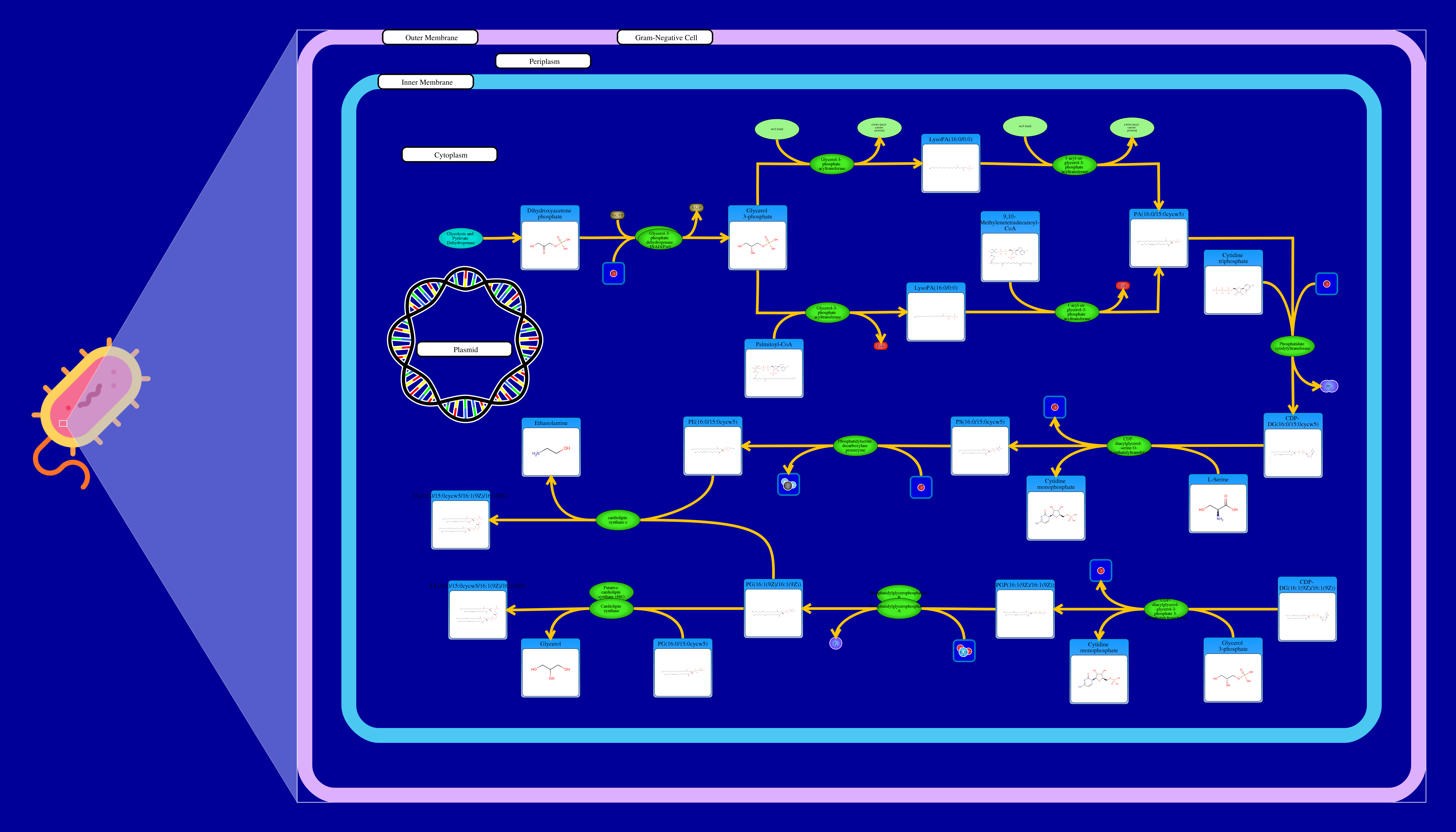 Phospholipids are membrane components in E. coli. The major phospholipids of E. coli are phosphatidylethanolamine, phosphatidylglycerol, and cardiolipin. All phospholipids contain sn-glycerol-3-phosphate esterified with fatty acids at the sn-1 and sn-2 positions. The reaction starts from a glycerone phosphate (dihydroxyacetone phosphate) produced in glycolysis. The glycerone phosphate is transformed into an sn-glycerol 3-phosphate (glycerol 3 phosphate) by NADPH-driven glycerol-3-phosphate dehydrogenase. sn-Glycerol 3-phosphate is transformed to a 1-acyl-sn-glycerol 3-phosphate (lysophosphatidic acid). This can be achieved by an sn-glycerol-3-phosphate acyltransferase that interacts either with a long-chain acyl-CoA or with an acyl-[acp]. The 1-acyl-sn-glycerol 3-phosphate is transformed into a 1,2-diacyl-sn-glycerol 3-phosphate (phosphatidic acid) through a 1-acylglycerol-3-phosphate O-acyltransferase. This compound is then converted into a CPD-diacylglycerol through a CTP phosphatidate cytididyltransferase. CPD-diacylglycerol can be transformed either into an L-1-phosphatidylserine or an L-1-phosphatidylglycerol-phosphate through a phosphatidylserine synthase or a phosphatidylglycerophosphate synthase, respectively. The L-1-phosphatidylserine transforms into L-1-phosphatidylethanolamine through a phosphatidylserine decarboxylase. On the other hand, L-1-phosphatidylglycerol-phosphate gets transformed into an L-1-phosphatidyl-glycerol through a phosphatidylglycerophosphatase. These 2 products combine to produce a cardiolipin and an ethanolamine. The L-1 phosphatidyl-glycerol can also interact with cardiolipin synthase resulting in a glycerol and a cardiolipin.
