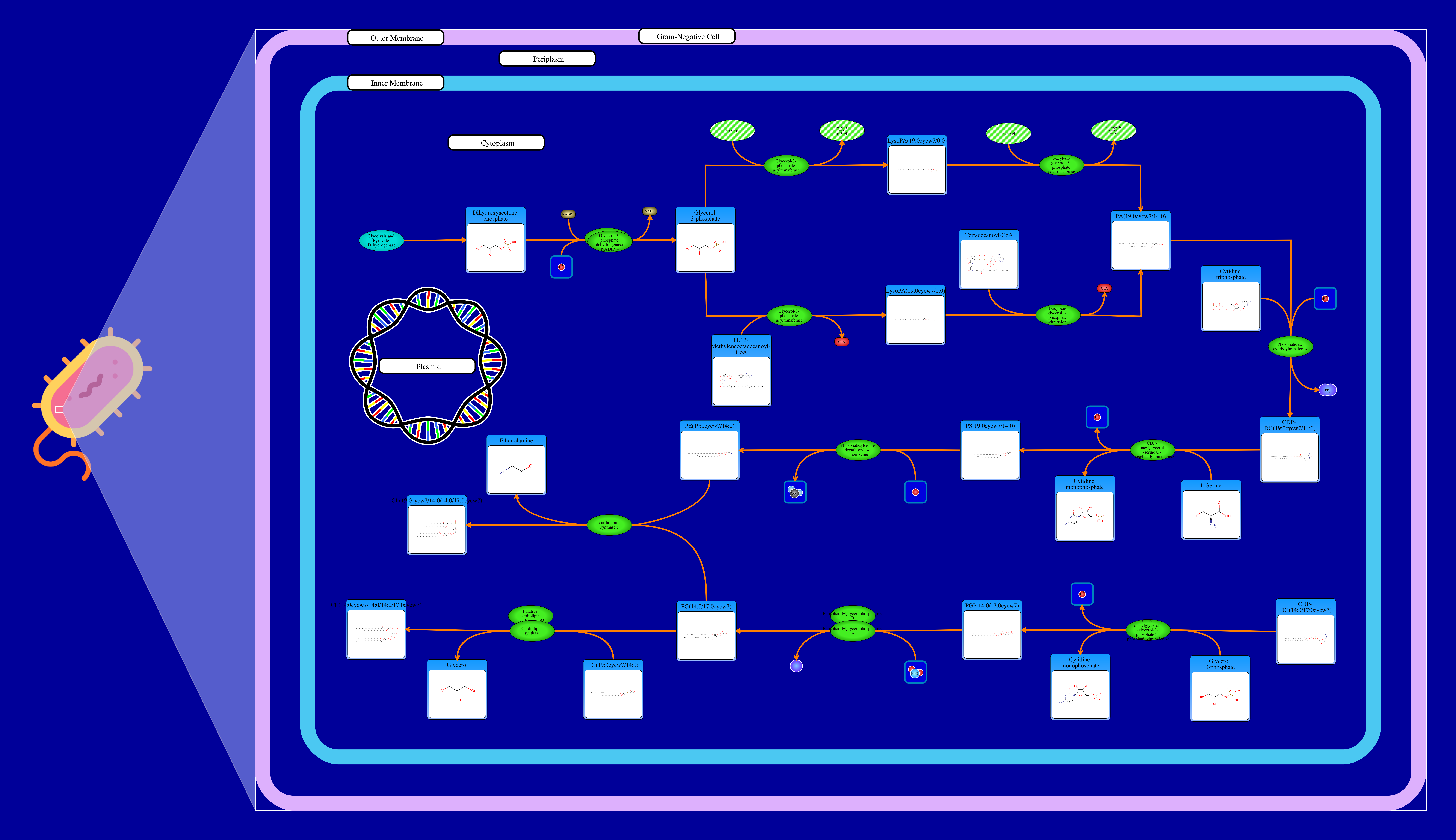 Phospholipids are membrane components in E. coli. The major phospholipids of E. coli are phosphatidylethanolamine, phosphatidylglycerol, and cardiolipin. All phospholipids contain sn-glycerol-3-phosphate esterified with fatty acids at the sn-1 and sn-2 positions. The reaction starts from a glycerone phosphate (dihydroxyacetone phosphate) produced in glycolysis. The glycerone phosphate is transformed into an sn-glycerol 3-phosphate (glycerol 3 phosphate) by NADPH-driven glycerol-3-phosphate dehydrogenase. sn-Glycerol 3-phosphate is transformed to a 1-acyl-sn-glycerol 3-phosphate (lysophosphatidic acid). This can be achieved by an sn-glycerol-3-phosphate acyltransferase that interacts either with a long-chain acyl-CoA or with an acyl-[acp]. The 1-acyl-sn-glycerol 3-phosphate is transformed into a 1,2-diacyl-sn-glycerol 3-phosphate (phosphatidic acid) through a 1-acylglycerol-3-phosphate O-acyltransferase. This compound is then converted into a CPD-diacylglycerol through a CTP phosphatidate cytididyltransferase. CPD-diacylglycerol can be transformed either into an L-1-phosphatidylserine or an L-1-phosphatidylglycerol-phosphate through a phosphatidylserine synthase or a phosphatidylglycerophosphate synthase, respectively. The L-1-phosphatidylserine transforms into L-1-phosphatidylethanolamine through a phosphatidylserine decarboxylase. On the other hand, L-1-phosphatidylglycerol-phosphate gets transformed into an L-1-phosphatidyl-glycerol through a phosphatidylglycerophosphatase. These 2 products combine to produce a cardiolipin and an ethanolamine. The L-1 phosphatidyl-glycerol can also interact with cardiolipin synthase resulting in a glycerol and a cardiolipin.