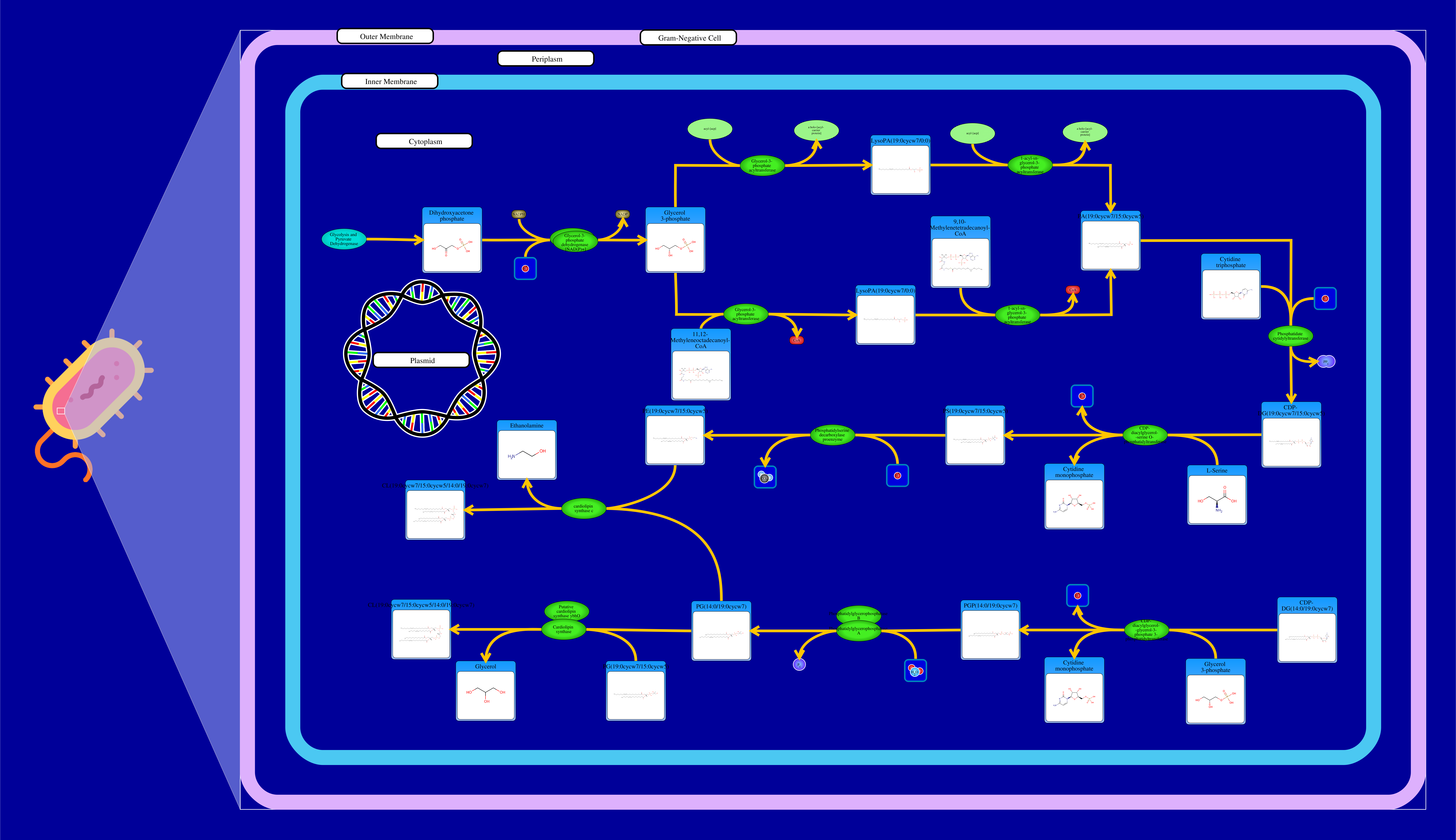 Phospholipids are membrane components in E. coli. The major phospholipids of E. coli are phosphatidylethanolamine, phosphatidylglycerol, and cardiolipin. All phospholipids contain sn-glycerol-3-phosphate esterified with fatty acids at the sn-1 and sn-2 positions. The reaction starts from a glycerone phosphate (dihydroxyacetone phosphate) produced in glycolysis. The glycerone phosphate is transformed into an sn-glycerol 3-phosphate (glycerol 3 phosphate) by NADPH-driven glycerol-3-phosphate dehydrogenase. sn-Glycerol 3-phosphate is transformed to a 1-acyl-sn-glycerol 3-phosphate (lysophosphatidic acid). This can be achieved by an sn-glycerol-3-phosphate acyltransferase that interacts either with a long-chain acyl-CoA or with an acyl-[acp]. The 1-acyl-sn-glycerol 3-phosphate is transformed into a 1,2-diacyl-sn-glycerol 3-phosphate (phosphatidic acid) through a 1-acylglycerol-3-phosphate O-acyltransferase. This compound is then converted into a CPD-diacylglycerol through a CTP phosphatidate cytididyltransferase. CPD-diacylglycerol can be transformed either into an L-1-phosphatidylserine or an L-1-phosphatidylglycerol-phosphate through a phosphatidylserine synthase or a phosphatidylglycerophosphate synthase, respectively. The L-1-phosphatidylserine transforms into L-1-phosphatidylethanolamine through a phosphatidylserine decarboxylase. On the other hand, L-1-phosphatidylglycerol-phosphate gets transformed into an L-1-phosphatidyl-glycerol through a phosphatidylglycerophosphatase. These 2 products combine to produce a cardiolipin and an ethanolamine. The L-1 phosphatidyl-glycerol can also interact with cardiolipin synthase resulting in a glycerol and a cardiolipin.
