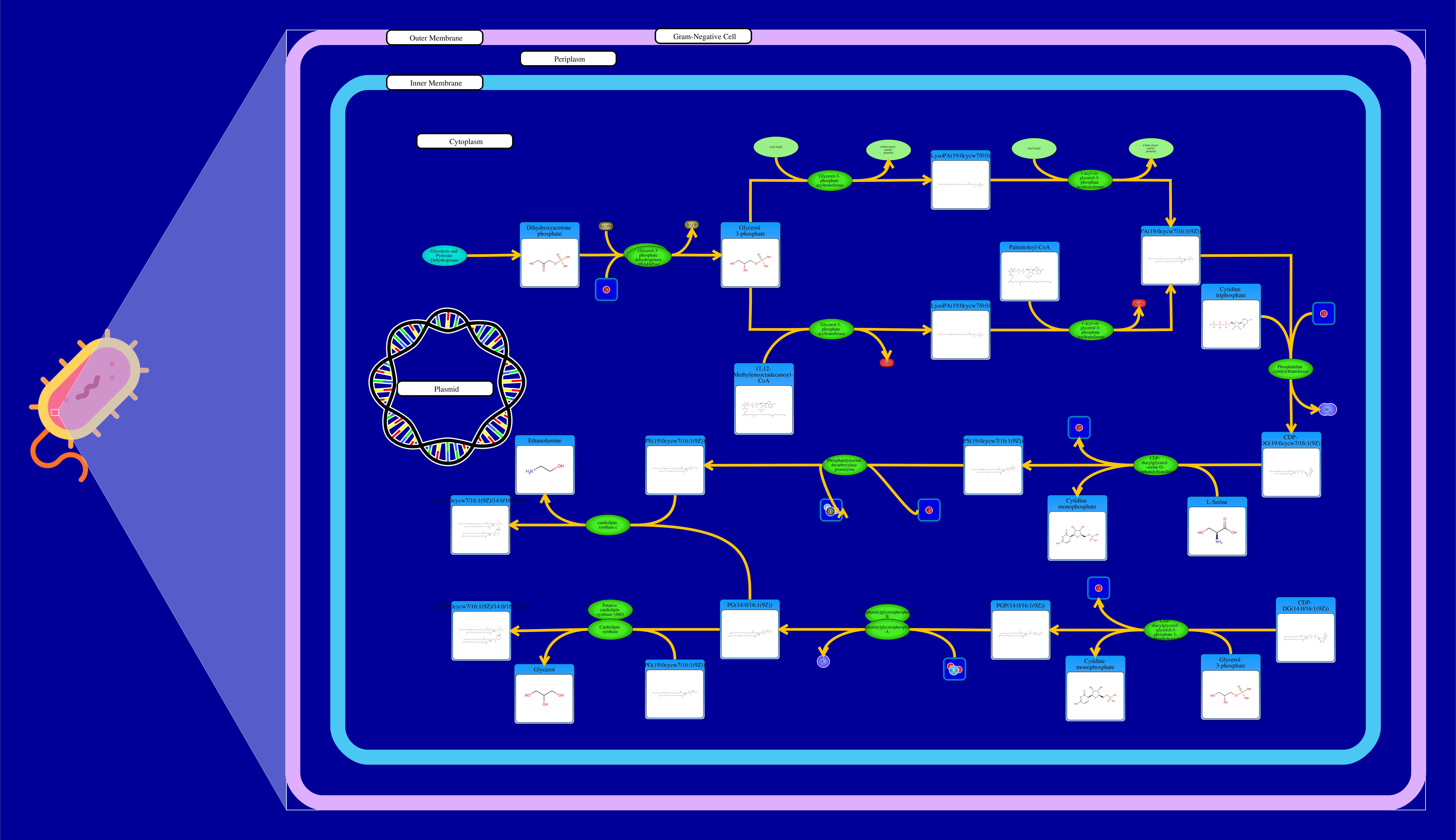 Phospholipids are membrane components in E. coli. The major phospholipids of E. coli are phosphatidylethanolamine, phosphatidylglycerol, and cardiolipin. All phospholipids contain sn-glycerol-3-phosphate esterified with fatty acids at the sn-1 and sn-2 positions. The reaction starts from a glycerone phosphate (dihydroxyacetone phosphate) produced in glycolysis. The glycerone phosphate is transformed into an sn-glycerol 3-phosphate (glycerol 3 phosphate) by NADPH-driven glycerol-3-phosphate dehydrogenase. sn-Glycerol 3-phosphate is transformed to a 1-acyl-sn-glycerol 3-phosphate (lysophosphatidic acid). This can be achieved by an sn-glycerol-3-phosphate acyltransferase that interacts either with a long-chain acyl-CoA or with an acyl-[acp]. The 1-acyl-sn-glycerol 3-phosphate is transformed into a 1,2-diacyl-sn-glycerol 3-phosphate (phosphatidic acid) through a 1-acylglycerol-3-phosphate O-acyltransferase. This compound is then converted into a CPD-diacylglycerol through a CTP phosphatidate cytididyltransferase. CPD-diacylglycerol can be transformed either into an L-1-phosphatidylserine or an L-1-phosphatidylglycerol-phosphate through a phosphatidylserine synthase or a phosphatidylglycerophosphate synthase, respectively. The L-1-phosphatidylserine transforms into L-1-phosphatidylethanolamine through a phosphatidylserine decarboxylase. On the other hand, L-1-phosphatidylglycerol-phosphate gets transformed into an L-1-phosphatidyl-glycerol through a phosphatidylglycerophosphatase. These 2 products combine to produce a cardiolipin and an ethanolamine. The L-1 phosphatidyl-glycerol can also interact with cardiolipin synthase resulting in a glycerol and a cardiolipin.