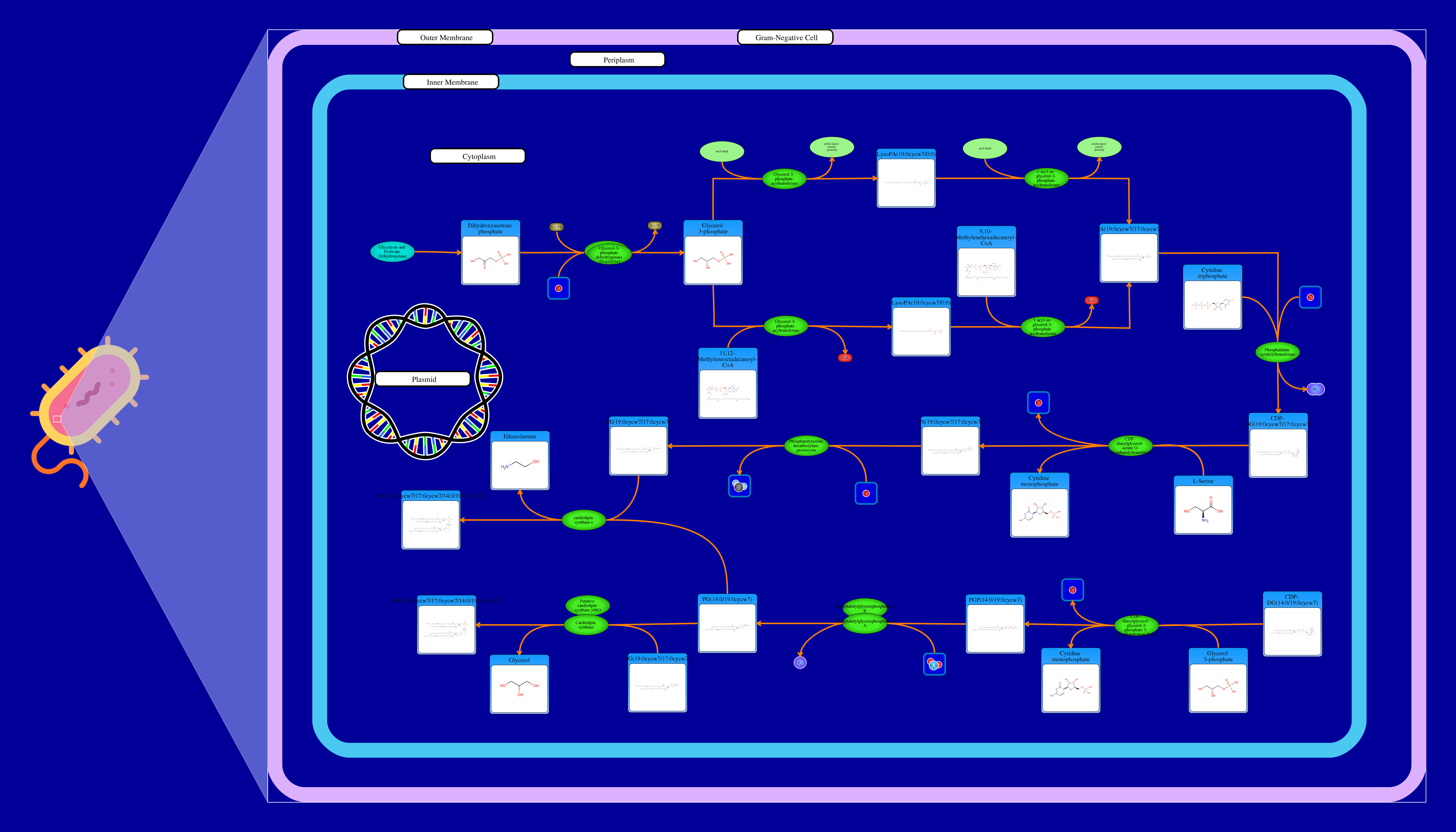 Phospholipids are membrane components in E. coli. The major phospholipids of E. coli are phosphatidylethanolamine, phosphatidylglycerol, and cardiolipin. All phospholipids contain sn-glycerol-3-phosphate esterified with fatty acids at the sn-1 and sn-2 positions. The reaction starts from a glycerone phosphate (dihydroxyacetone phosphate) produced in glycolysis. The glycerone phosphate is transformed into an sn-glycerol 3-phosphate (glycerol 3 phosphate) by NADPH-driven glycerol-3-phosphate dehydrogenase. sn-Glycerol 3-phosphate is transformed to a 1-acyl-sn-glycerol 3-phosphate (lysophosphatidic acid). This can be achieved by an sn-glycerol-3-phosphate acyltransferase that interacts either with a long-chain acyl-CoA or with an acyl-[acp]. The 1-acyl-sn-glycerol 3-phosphate is transformed into a 1,2-diacyl-sn-glycerol 3-phosphate (phosphatidic acid) through a 1-acylglycerol-3-phosphate O-acyltransferase. This compound is then converted into a CPD-diacylglycerol through a CTP phosphatidate cytididyltransferase. CPD-diacylglycerol can be transformed either into an L-1-phosphatidylserine or an L-1-phosphatidylglycerol-phosphate through a phosphatidylserine synthase or a phosphatidylglycerophosphate synthase, respectively. The L-1-phosphatidylserine transforms into L-1-phosphatidylethanolamine through a phosphatidylserine decarboxylase. On the other hand, L-1-phosphatidylglycerol-phosphate gets transformed into an L-1-phosphatidyl-glycerol through a phosphatidylglycerophosphatase. These 2 products combine to produce a cardiolipin and an ethanolamine. The L-1 phosphatidyl-glycerol can also interact with cardiolipin synthase resulting in a glycerol and a cardiolipin.