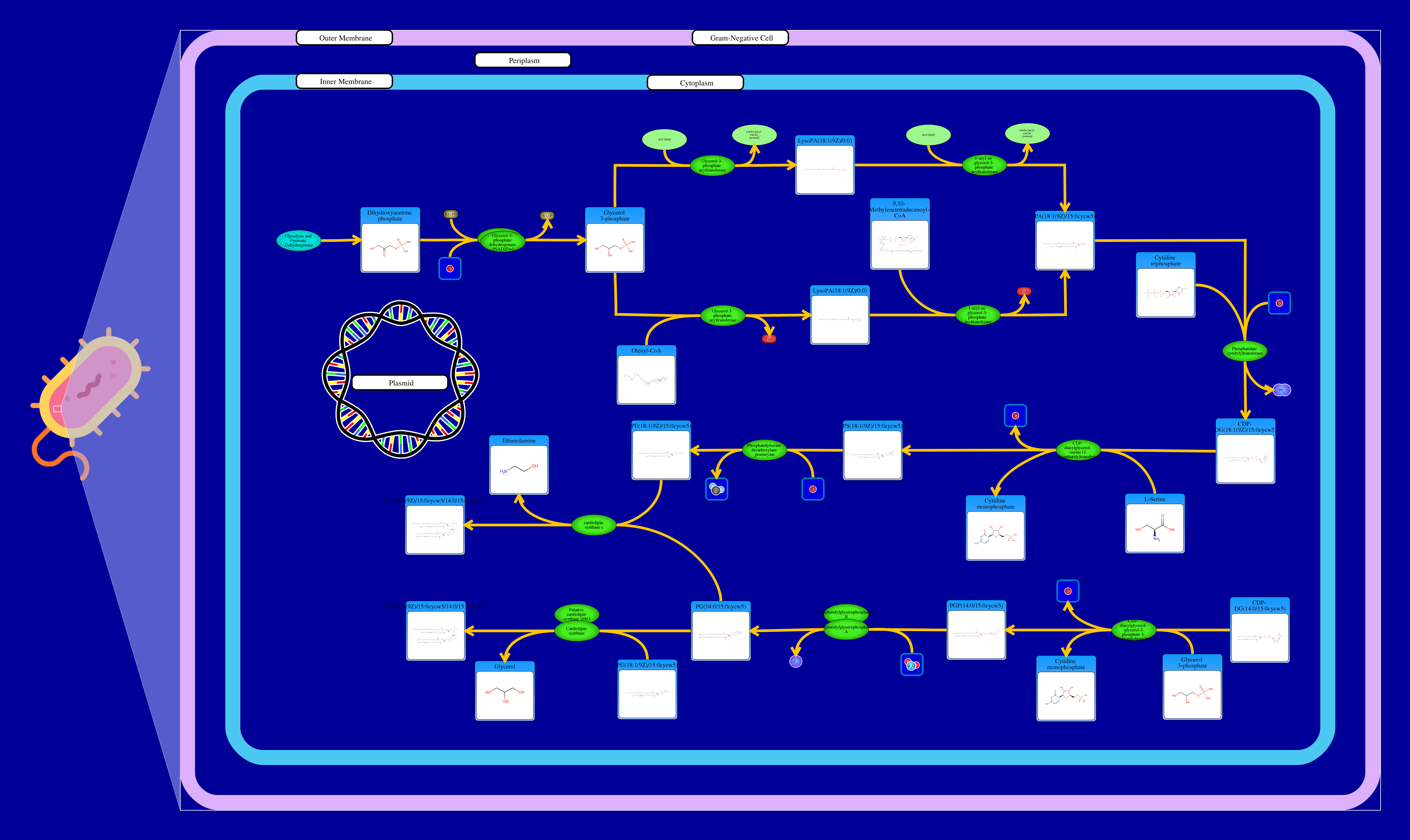 Phospholipids are membrane components in E. coli. The major phospholipids of E. coli are phosphatidylethanolamine, phosphatidylglycerol, and cardiolipin. All phospholipids contain sn-glycerol-3-phosphate esterified with fatty acids at the sn-1 and sn-2 positions. The reaction starts from a glycerone phosphate (dihydroxyacetone phosphate) produced in glycolysis. The glycerone phosphate is transformed into an sn-glycerol 3-phosphate (glycerol 3 phosphate) by NADPH-driven glycerol-3-phosphate dehydrogenase. sn-Glycerol 3-phosphate is transformed to a 1-acyl-sn-glycerol 3-phosphate (lysophosphatidic acid). This can be achieved by an sn-glycerol-3-phosphate acyltransferase that interacts either with a long-chain acyl-CoA or with an acyl-[acp]. The 1-acyl-sn-glycerol 3-phosphate is transformed into a 1,2-diacyl-sn-glycerol 3-phosphate (phosphatidic acid) through a 1-acylglycerol-3-phosphate O-acyltransferase. This compound is then converted into a CPD-diacylglycerol through a CTP phosphatidate cytididyltransferase. CPD-diacylglycerol can be transformed either into an L-1-phosphatidylserine or an L-1-phosphatidylglycerol-phosphate through a phosphatidylserine synthase or a phosphatidylglycerophosphate synthase, respectively. The L-1-phosphatidylserine transforms into L-1-phosphatidylethanolamine through a phosphatidylserine decarboxylase. On the other hand, L-1-phosphatidylglycerol-phosphate gets transformed into an L-1-phosphatidyl-glycerol through a phosphatidylglycerophosphatase. These 2 products combine to produce a cardiolipin and an ethanolamine. The L-1 phosphatidyl-glycerol can also interact with cardiolipin synthase resulting in a glycerol and a cardiolipin.