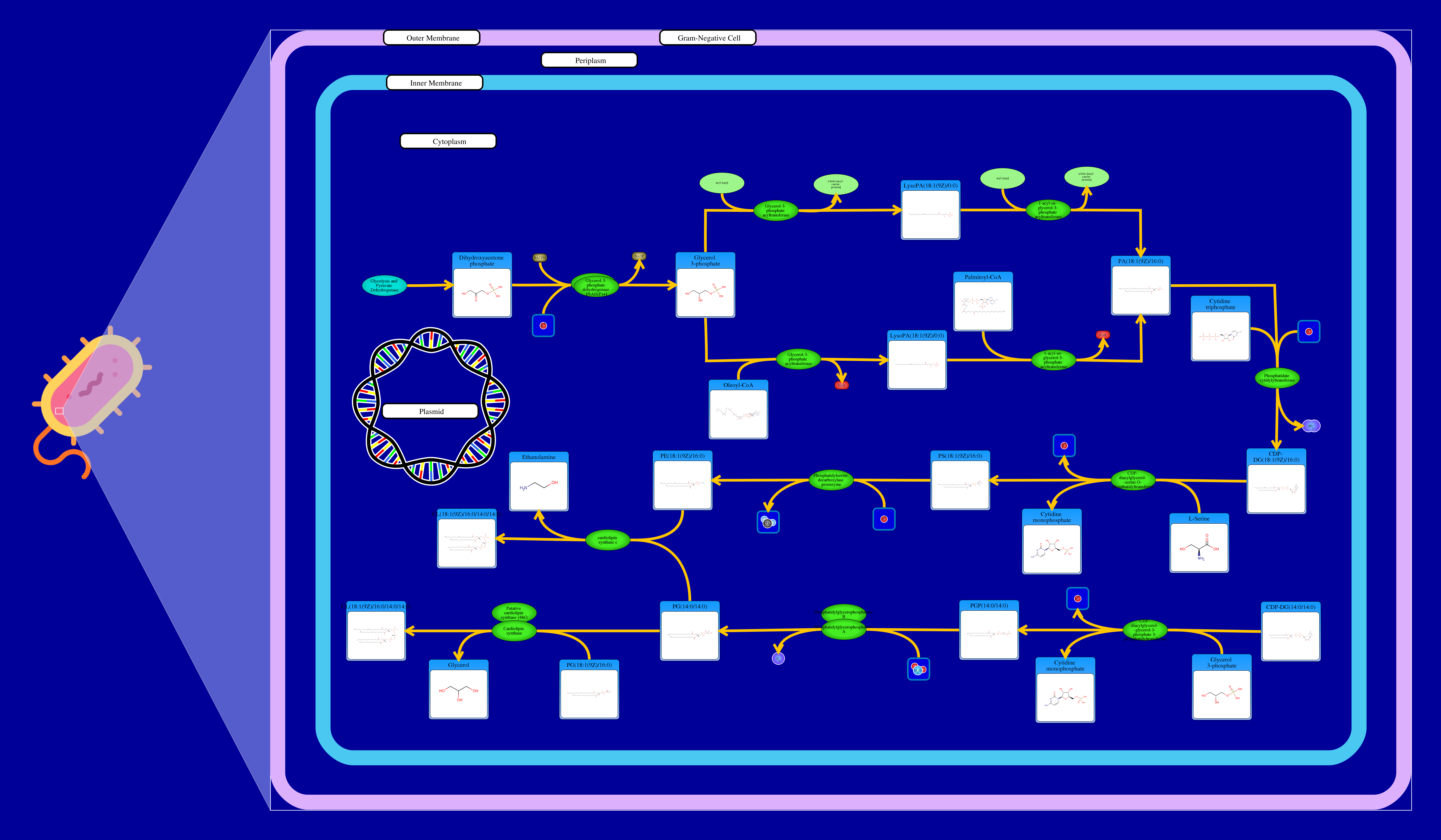 Phospholipids are membrane components in E. coli. The major phospholipids of E. coli are phosphatidylethanolamine, phosphatidylglycerol, and cardiolipin. All phospholipids contain sn-glycerol-3-phosphate esterified with fatty acids at the sn-1 and sn-2 positions. The reaction starts from a glycerone phosphate (dihydroxyacetone phosphate) produced in glycolysis. The glycerone phosphate is transformed into an sn-glycerol 3-phosphate (glycerol 3 phosphate) by NADPH-driven glycerol-3-phosphate dehydrogenase. sn-Glycerol 3-phosphate is transformed to a 1-acyl-sn-glycerol 3-phosphate (lysophosphatidic acid). This can be achieved by an sn-glycerol-3-phosphate acyltransferase that interacts either with a long-chain acyl-CoA or with an acyl-[acp]. The 1-acyl-sn-glycerol 3-phosphate is transformed into a 1,2-diacyl-sn-glycerol 3-phosphate (phosphatidic acid) through a 1-acylglycerol-3-phosphate O-acyltransferase. This compound is then converted into a CPD-diacylglycerol through a CTP phosphatidate cytididyltransferase. CPD-diacylglycerol can be transformed either into an L-1-phosphatidylserine or an L-1-phosphatidylglycerol-phosphate through a phosphatidylserine synthase or a phosphatidylglycerophosphate synthase, respectively. The L-1-phosphatidylserine transforms into L-1-phosphatidylethanolamine through a phosphatidylserine decarboxylase. On the other hand, L-1-phosphatidylglycerol-phosphate gets transformed into an L-1-phosphatidyl-glycerol through a phosphatidylglycerophosphatase. These 2 products combine to produce a cardiolipin and an ethanolamine. The L-1 phosphatidyl-glycerol can also interact with cardiolipin synthase resulting in a glycerol and a cardiolipin.