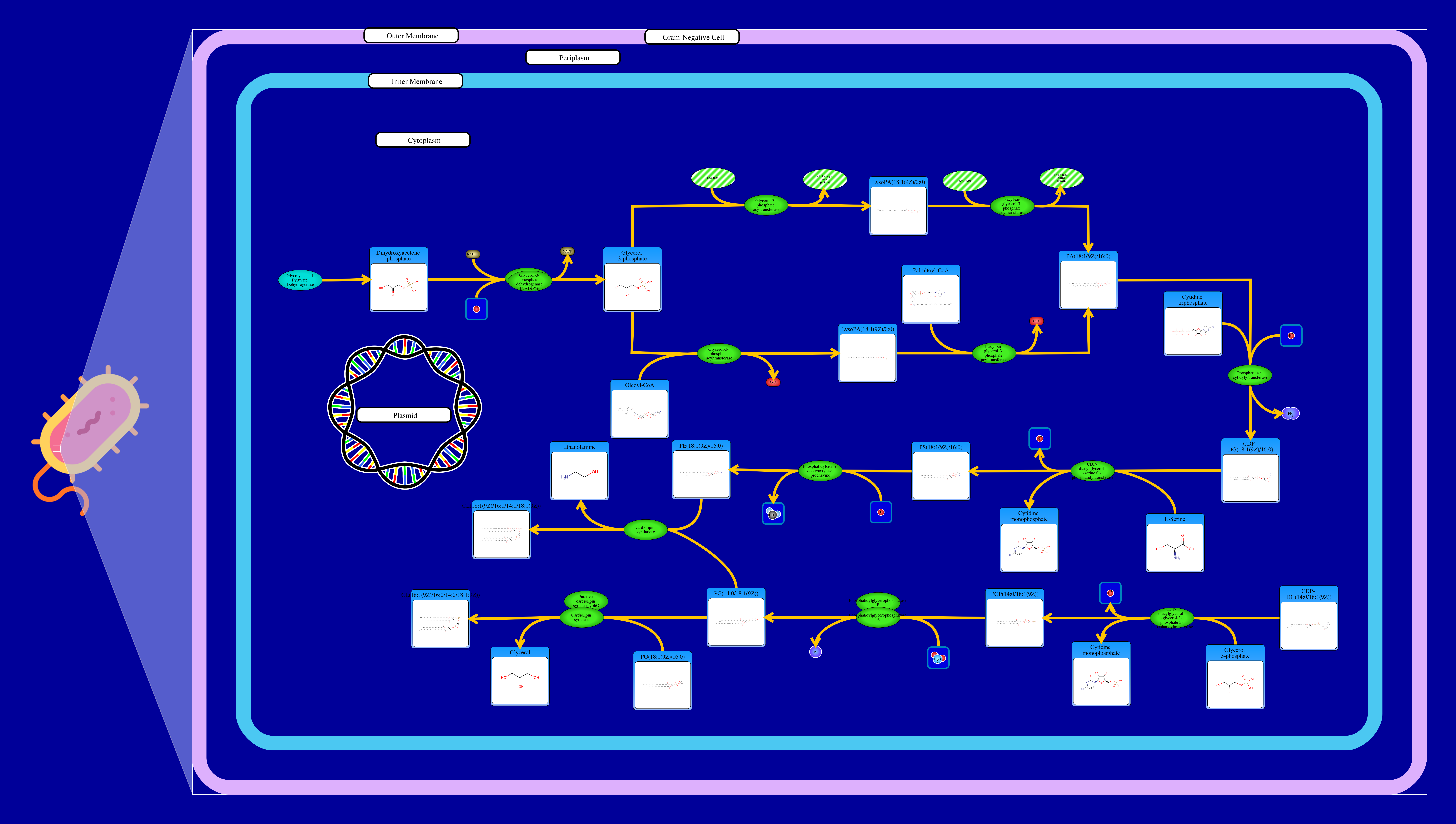 Phospholipids are membrane components in E. coli. The major phospholipids of E. coli are phosphatidylethanolamine, phosphatidylglycerol, and cardiolipin. All phospholipids contain sn-glycerol-3-phosphate esterified with fatty acids at the sn-1 and sn-2 positions. The reaction starts from a glycerone phosphate (dihydroxyacetone phosphate) produced in glycolysis. The glycerone phosphate is transformed into an sn-glycerol 3-phosphate (glycerol 3 phosphate) by NADPH-driven glycerol-3-phosphate dehydrogenase. sn-Glycerol 3-phosphate is transformed to a 1-acyl-sn-glycerol 3-phosphate (lysophosphatidic acid). This can be achieved by an sn-glycerol-3-phosphate acyltransferase that interacts either with a long-chain acyl-CoA or with an acyl-[acp]. The 1-acyl-sn-glycerol 3-phosphate is transformed into a 1,2-diacyl-sn-glycerol 3-phosphate (phosphatidic acid) through a 1-acylglycerol-3-phosphate O-acyltransferase. This compound is then converted into a CPD-diacylglycerol through a CTP phosphatidate cytididyltransferase. CPD-diacylglycerol can be transformed either into an L-1-phosphatidylserine or an L-1-phosphatidylglycerol-phosphate through a phosphatidylserine synthase or a phosphatidylglycerophosphate synthase, respectively. The L-1-phosphatidylserine transforms into L-1-phosphatidylethanolamine through a phosphatidylserine decarboxylase. On the other hand, L-1-phosphatidylglycerol-phosphate gets transformed into an L-1-phosphatidyl-glycerol through a phosphatidylglycerophosphatase. These 2 products combine to produce a cardiolipin and an ethanolamine. The L-1 phosphatidyl-glycerol can also interact with cardiolipin synthase resulting in a glycerol and a cardiolipin.