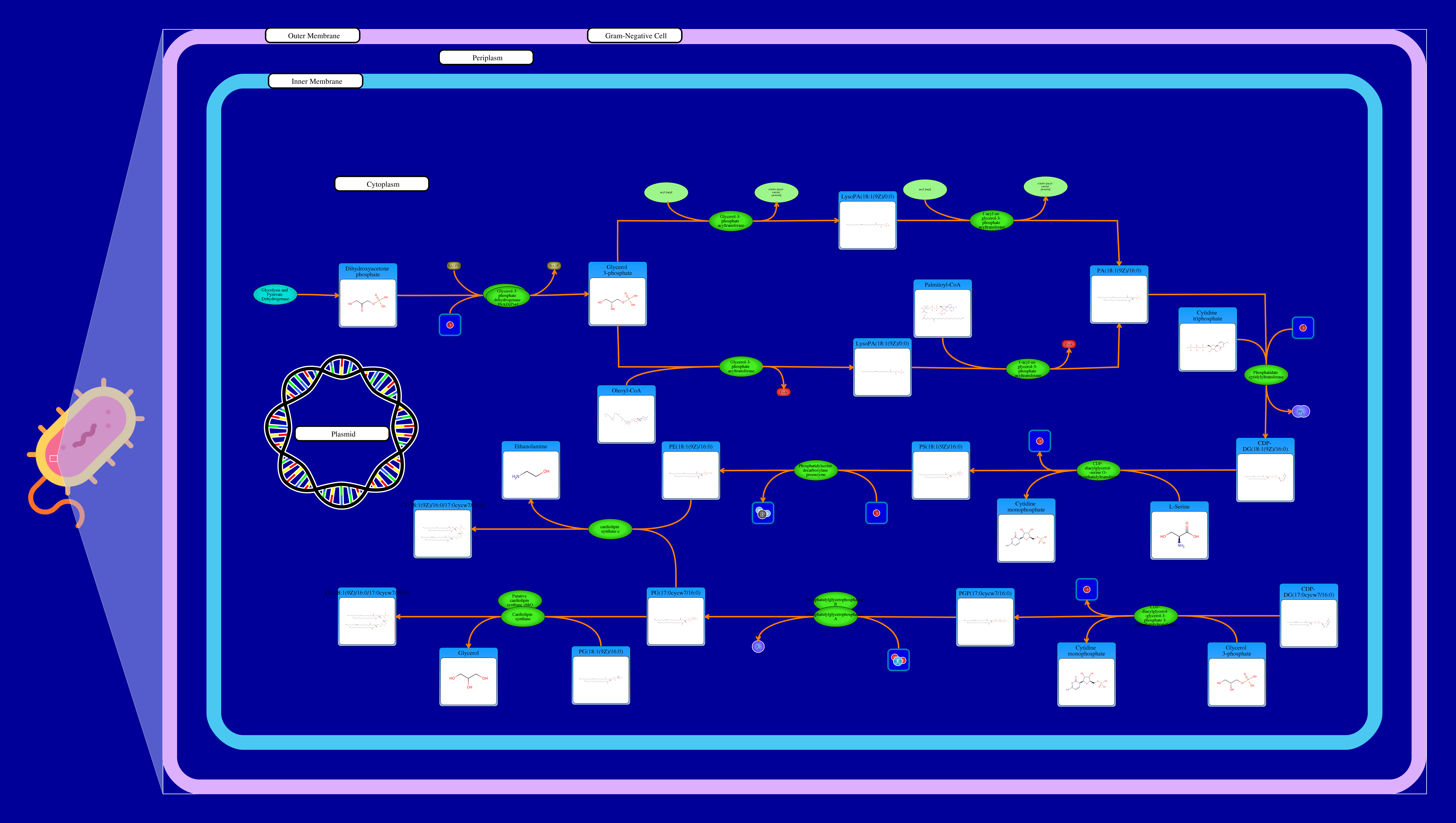 Phospholipids are membrane components in E. coli. The major phospholipids of E. coli are phosphatidylethanolamine, phosphatidylglycerol, and cardiolipin. All phospholipids contain sn-glycerol-3-phosphate esterified with fatty acids at the sn-1 and sn-2 positions. The reaction starts from a glycerone phosphate (dihydroxyacetone phosphate) produced in glycolysis. The glycerone phosphate is transformed into an sn-glycerol 3-phosphate (glycerol 3 phosphate) by NADPH-driven glycerol-3-phosphate dehydrogenase. sn-Glycerol 3-phosphate is transformed to a 1-acyl-sn-glycerol 3-phosphate (lysophosphatidic acid). This can be achieved by an sn-glycerol-3-phosphate acyltransferase that interacts either with a long-chain acyl-CoA or with an acyl-[acp]. The 1-acyl-sn-glycerol 3-phosphate is transformed into a 1,2-diacyl-sn-glycerol 3-phosphate (phosphatidic acid) through a 1-acylglycerol-3-phosphate O-acyltransferase. This compound is then converted into a CPD-diacylglycerol through a CTP phosphatidate cytididyltransferase. CPD-diacylglycerol can be transformed either into an L-1-phosphatidylserine or an L-1-phosphatidylglycerol-phosphate through a phosphatidylserine synthase or a phosphatidylglycerophosphate synthase, respectively. The L-1-phosphatidylserine transforms into L-1-phosphatidylethanolamine through a phosphatidylserine decarboxylase. On the other hand, L-1-phosphatidylglycerol-phosphate gets transformed into an L-1-phosphatidyl-glycerol through a phosphatidylglycerophosphatase. These 2 products combine to produce a cardiolipin and an ethanolamine. The L-1 phosphatidyl-glycerol can also interact with cardiolipin synthase resulting in a glycerol and a cardiolipin.