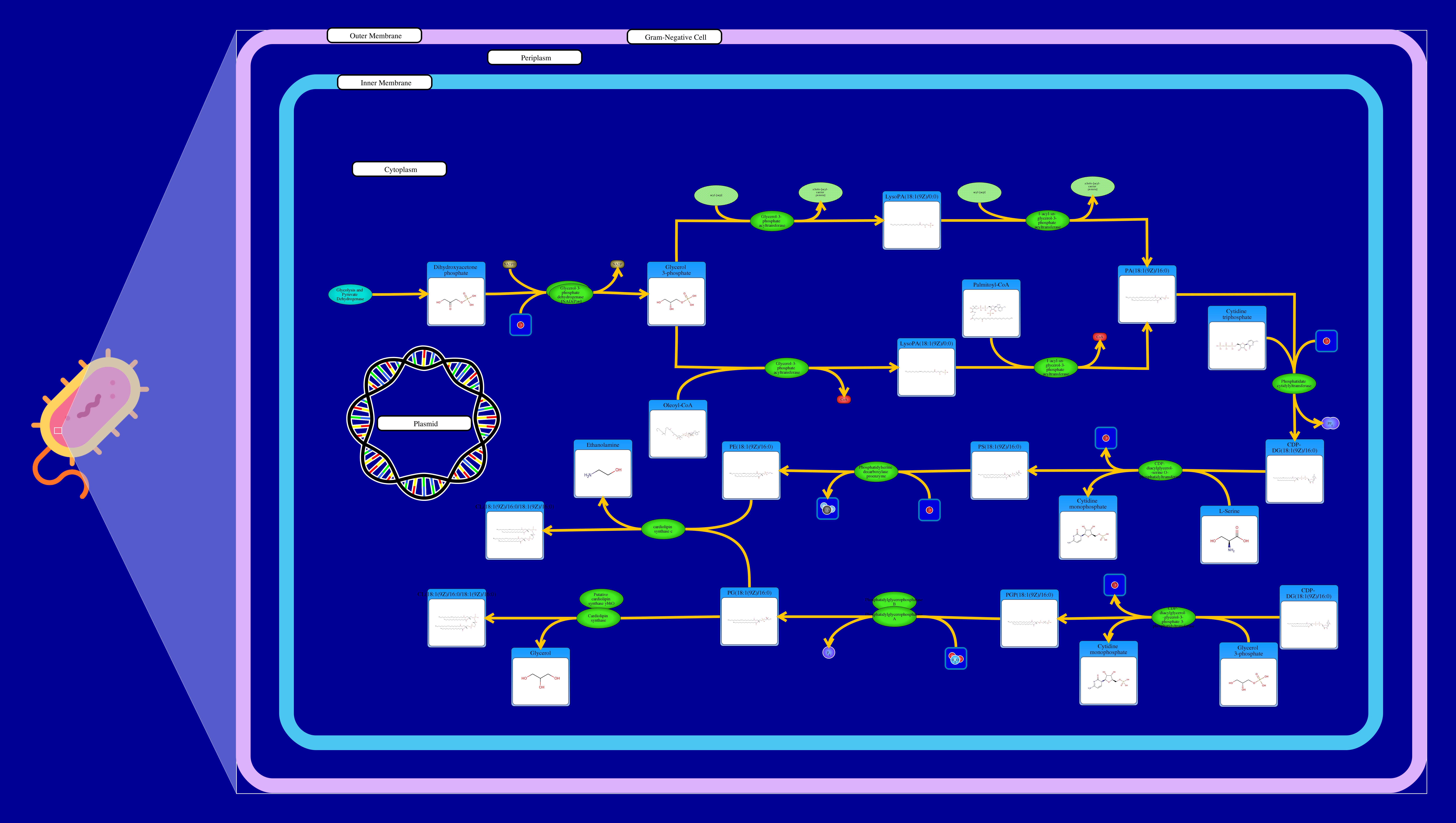 Phospholipids are membrane components in E. coli. The major phospholipids of E. coli are phosphatidylethanolamine, phosphatidylglycerol, and cardiolipin. All phospholipids contain sn-glycerol-3-phosphate esterified with fatty acids at the sn-1 and sn-2 positions. The reaction starts from a glycerone phosphate (dihydroxyacetone phosphate) produced in glycolysis. The glycerone phosphate is transformed into an sn-glycerol 3-phosphate (glycerol 3 phosphate) by NADPH-driven glycerol-3-phosphate dehydrogenase. sn-Glycerol 3-phosphate is transformed to a 1-acyl-sn-glycerol 3-phosphate (lysophosphatidic acid). This can be achieved by an sn-glycerol-3-phosphate acyltransferase that interacts either with a long-chain acyl-CoA or with an acyl-[acp]. The 1-acyl-sn-glycerol 3-phosphate is transformed into a 1,2-diacyl-sn-glycerol 3-phosphate (phosphatidic acid) through a 1-acylglycerol-3-phosphate O-acyltransferase. This compound is then converted into a CPD-diacylglycerol through a CTP phosphatidate cytididyltransferase. CPD-diacylglycerol can be transformed either into an L-1-phosphatidylserine or an L-1-phosphatidylglycerol-phosphate through a phosphatidylserine synthase or a phosphatidylglycerophosphate synthase, respectively. The L-1-phosphatidylserine transforms into L-1-phosphatidylethanolamine through a phosphatidylserine decarboxylase. On the other hand, L-1-phosphatidylglycerol-phosphate gets transformed into an L-1-phosphatidyl-glycerol through a phosphatidylglycerophosphatase. These 2 products combine to produce a cardiolipin and an ethanolamine. The L-1 phosphatidyl-glycerol can also interact with cardiolipin synthase resulting in a glycerol and a cardiolipin.