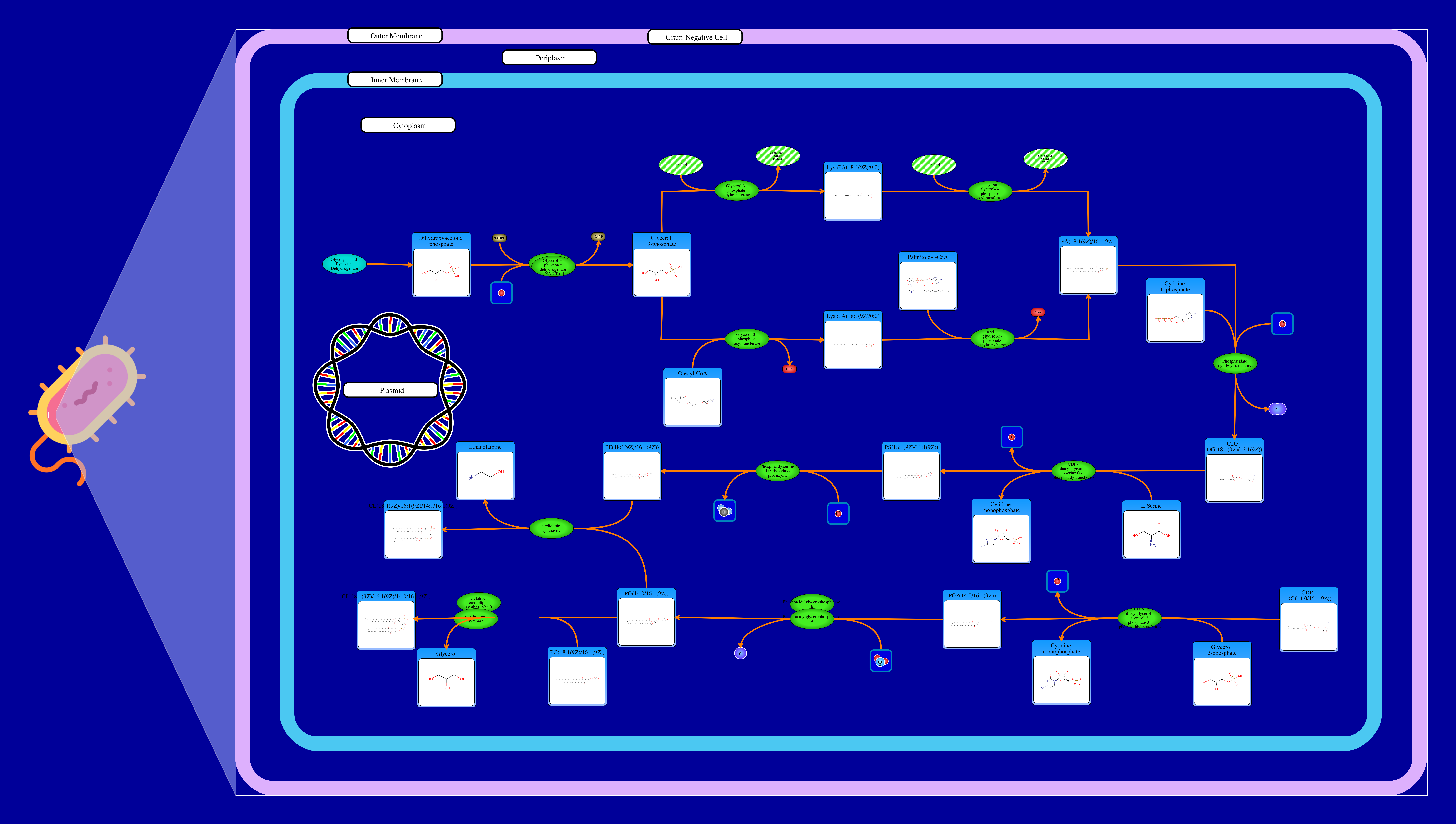 Phospholipids are membrane components in E. coli. The major phospholipids of E. coli are phosphatidylethanolamine, phosphatidylglycerol, and cardiolipin. All phospholipids contain sn-glycerol-3-phosphate esterified with fatty acids at the sn-1 and sn-2 positions. The reaction starts from a glycerone phosphate (dihydroxyacetone phosphate) produced in glycolysis. The glycerone phosphate is transformed into an sn-glycerol 3-phosphate (glycerol 3 phosphate) by NADPH-driven glycerol-3-phosphate dehydrogenase. sn-Glycerol 3-phosphate is transformed to a 1-acyl-sn-glycerol 3-phosphate (lysophosphatidic acid). This can be achieved by an sn-glycerol-3-phosphate acyltransferase that interacts either with a long-chain acyl-CoA or with an acyl-[acp]. The 1-acyl-sn-glycerol 3-phosphate is transformed into a 1,2-diacyl-sn-glycerol 3-phosphate (phosphatidic acid) through a 1-acylglycerol-3-phosphate O-acyltransferase. This compound is then converted into a CPD-diacylglycerol through a CTP phosphatidate cytididyltransferase. CPD-diacylglycerol can be transformed either into an L-1-phosphatidylserine or an L-1-phosphatidylglycerol-phosphate through a phosphatidylserine synthase or a phosphatidylglycerophosphate synthase, respectively. The L-1-phosphatidylserine transforms into L-1-phosphatidylethanolamine through a phosphatidylserine decarboxylase. On the other hand, L-1-phosphatidylglycerol-phosphate gets transformed into an L-1-phosphatidyl-glycerol through a phosphatidylglycerophosphatase. These 2 products combine to produce a cardiolipin and an ethanolamine. The L-1 phosphatidyl-glycerol can also interact with cardiolipin synthase resulting in a glycerol and a cardiolipin.