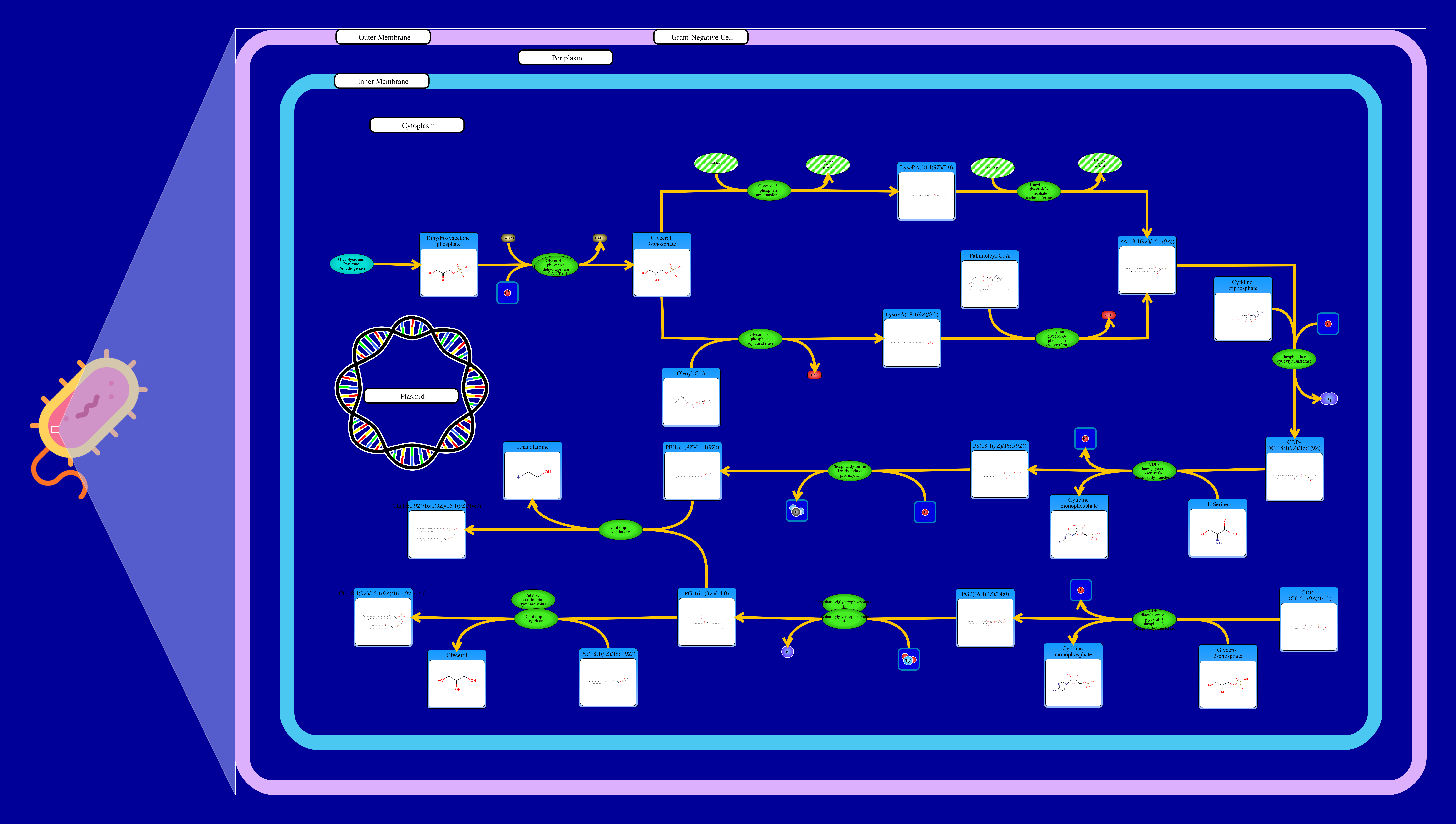 Phospholipids are membrane components in E. coli. The major phospholipids of E. coli are phosphatidylethanolamine, phosphatidylglycerol, and cardiolipin. All phospholipids contain sn-glycerol-3-phosphate esterified with fatty acids at the sn-1 and sn-2 positions. The reaction starts from a glycerone phosphate (dihydroxyacetone phosphate) produced in glycolysis. The glycerone phosphate is transformed into an sn-glycerol 3-phosphate (glycerol 3 phosphate) by NADPH-driven glycerol-3-phosphate dehydrogenase. sn-Glycerol 3-phosphate is transformed to a 1-acyl-sn-glycerol 3-phosphate (lysophosphatidic acid). This can be achieved by an sn-glycerol-3-phosphate acyltransferase that interacts either with a long-chain acyl-CoA or with an acyl-[acp]. The 1-acyl-sn-glycerol 3-phosphate is transformed into a 1,2-diacyl-sn-glycerol 3-phosphate (phosphatidic acid) through a 1-acylglycerol-3-phosphate O-acyltransferase. This compound is then converted into a CPD-diacylglycerol through a CTP phosphatidate cytididyltransferase. CPD-diacylglycerol can be transformed either into an L-1-phosphatidylserine or an L-1-phosphatidylglycerol-phosphate through a phosphatidylserine synthase or a phosphatidylglycerophosphate synthase, respectively. The L-1-phosphatidylserine transforms into L-1-phosphatidylethanolamine through a phosphatidylserine decarboxylase. On the other hand, L-1-phosphatidylglycerol-phosphate gets transformed into an L-1-phosphatidyl-glycerol through a phosphatidylglycerophosphatase. These 2 products combine to produce a cardiolipin and an ethanolamine. The L-1 phosphatidyl-glycerol can also interact with cardiolipin synthase resulting in a glycerol and a cardiolipin.
