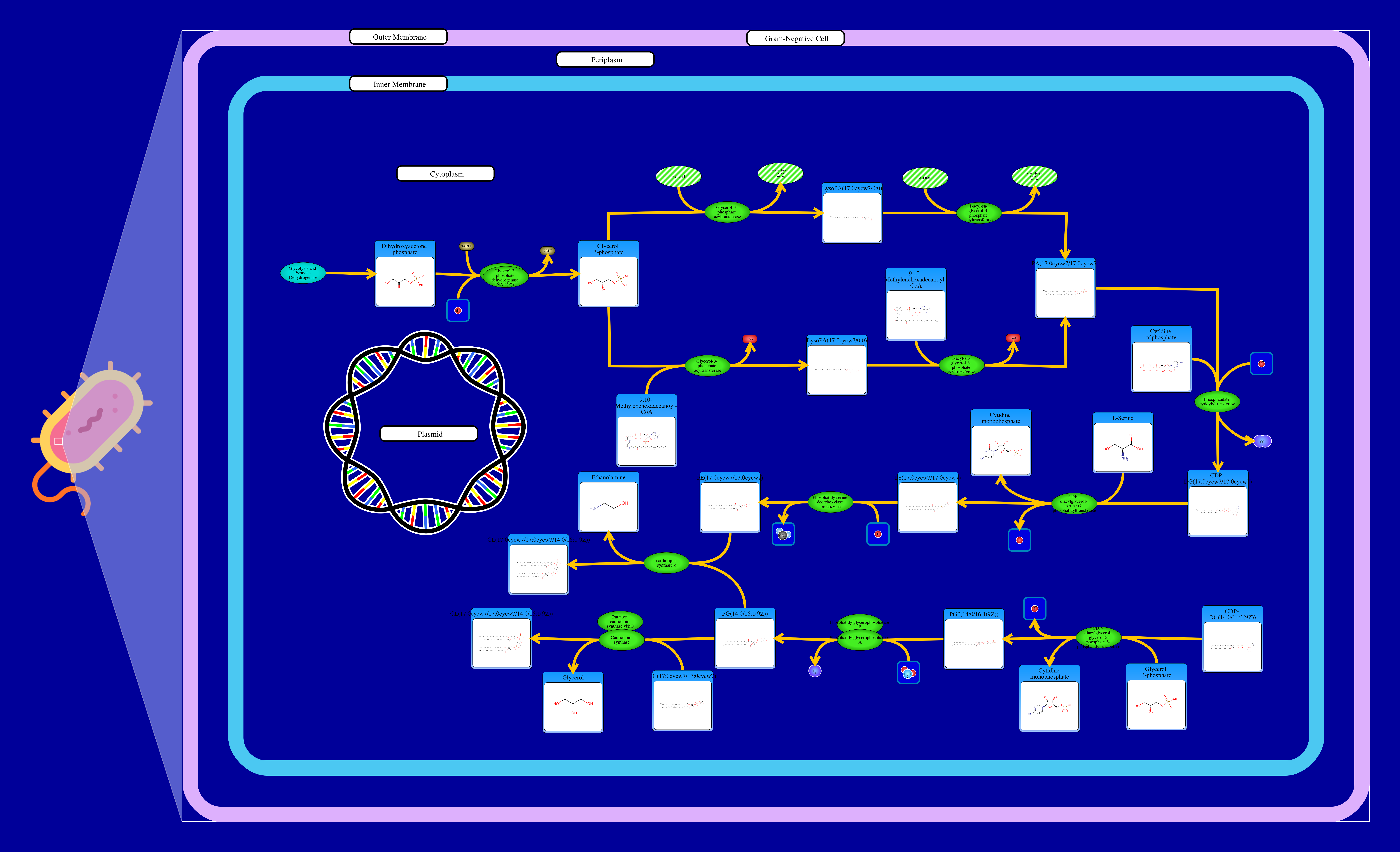 Phospholipids are membrane components in E. coli. The major phospholipids of E. coli are phosphatidylethanolamine, phosphatidylglycerol, and cardiolipin. All phospholipids contain sn-glycerol-3-phosphate esterified with fatty acids at the sn-1 and sn-2 positions. The reaction starts from a glycerone phosphate (dihydroxyacetone phosphate) produced in glycolysis. The glycerone phosphate is transformed into an sn-glycerol 3-phosphate (glycerol 3 phosphate) by NADPH-driven glycerol-3-phosphate dehydrogenase. sn-Glycerol 3-phosphate is transformed to a 1-acyl-sn-glycerol 3-phosphate (lysophosphatidic acid). This can be achieved by an sn-glycerol-3-phosphate acyltransferase that interacts either with a long-chain acyl-CoA or with an acyl-[acp]. The 1-acyl-sn-glycerol 3-phosphate is transformed into a 1,2-diacyl-sn-glycerol 3-phosphate (phosphatidic acid) through a 1-acylglycerol-3-phosphate O-acyltransferase. This compound is then converted into a CPD-diacylglycerol through a CTP phosphatidate cytididyltransferase. CPD-diacylglycerol can be transformed either into an L-1-phosphatidylserine or an L-1-phosphatidylglycerol-phosphate through a phosphatidylserine synthase or a phosphatidylglycerophosphate synthase, respectively. The L-1-phosphatidylserine transforms into L-1-phosphatidylethanolamine through a phosphatidylserine decarboxylase. On the other hand, L-1-phosphatidylglycerol-phosphate gets transformed into an L-1-phosphatidyl-glycerol through a phosphatidylglycerophosphatase. These 2 products combine to produce a cardiolipin and an ethanolamine. The L-1 phosphatidyl-glycerol can also interact with cardiolipin synthase resulting in a glycerol and a cardiolipin.