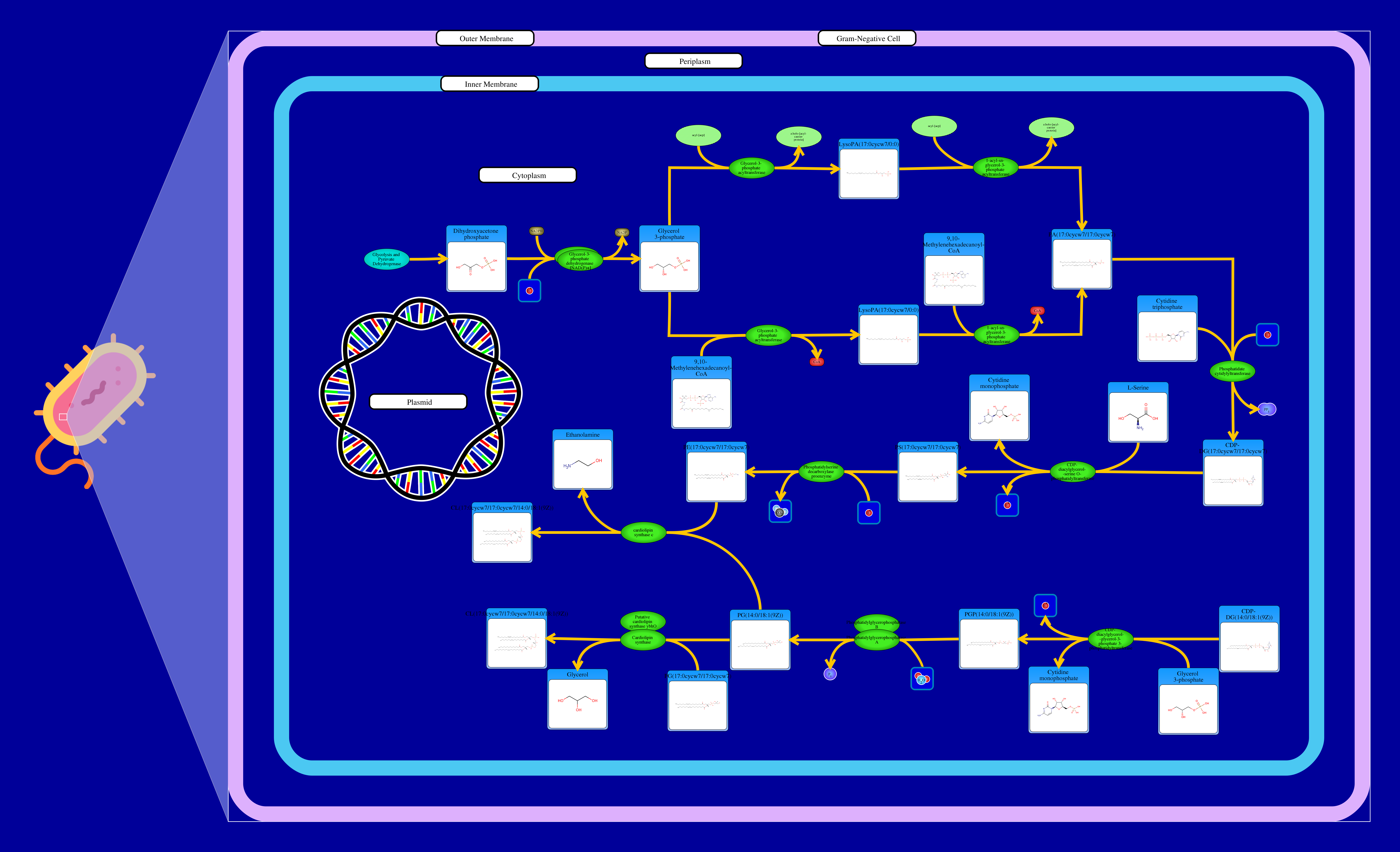 Phospholipids are membrane components in E. coli. The major phospholipids of E. coli are phosphatidylethanolamine, phosphatidylglycerol, and cardiolipin. All phospholipids contain sn-glycerol-3-phosphate esterified with fatty acids at the sn-1 and sn-2 positions. The reaction starts from a glycerone phosphate (dihydroxyacetone phosphate) produced in glycolysis. The glycerone phosphate is transformed into an sn-glycerol 3-phosphate (glycerol 3 phosphate) by NADPH-driven glycerol-3-phosphate dehydrogenase. sn-Glycerol 3-phosphate is transformed to a 1-acyl-sn-glycerol 3-phosphate (lysophosphatidic acid). This can be achieved by an sn-glycerol-3-phosphate acyltransferase that interacts either with a long-chain acyl-CoA or with an acyl-[acp]. The 1-acyl-sn-glycerol 3-phosphate is transformed into a 1,2-diacyl-sn-glycerol 3-phosphate (phosphatidic acid) through a 1-acylglycerol-3-phosphate O-acyltransferase. This compound is then converted into a CPD-diacylglycerol through a CTP phosphatidate cytididyltransferase. CPD-diacylglycerol can be transformed either into an L-1-phosphatidylserine or an L-1-phosphatidylglycerol-phosphate through a phosphatidylserine synthase or a phosphatidylglycerophosphate synthase, respectively. The L-1-phosphatidylserine transforms into L-1-phosphatidylethanolamine through a phosphatidylserine decarboxylase. On the other hand, L-1-phosphatidylglycerol-phosphate gets transformed into an L-1-phosphatidyl-glycerol through a phosphatidylglycerophosphatase. These 2 products combine to produce a cardiolipin and an ethanolamine. The L-1 phosphatidyl-glycerol can also interact with cardiolipin synthase resulting in a glycerol and a cardiolipin.