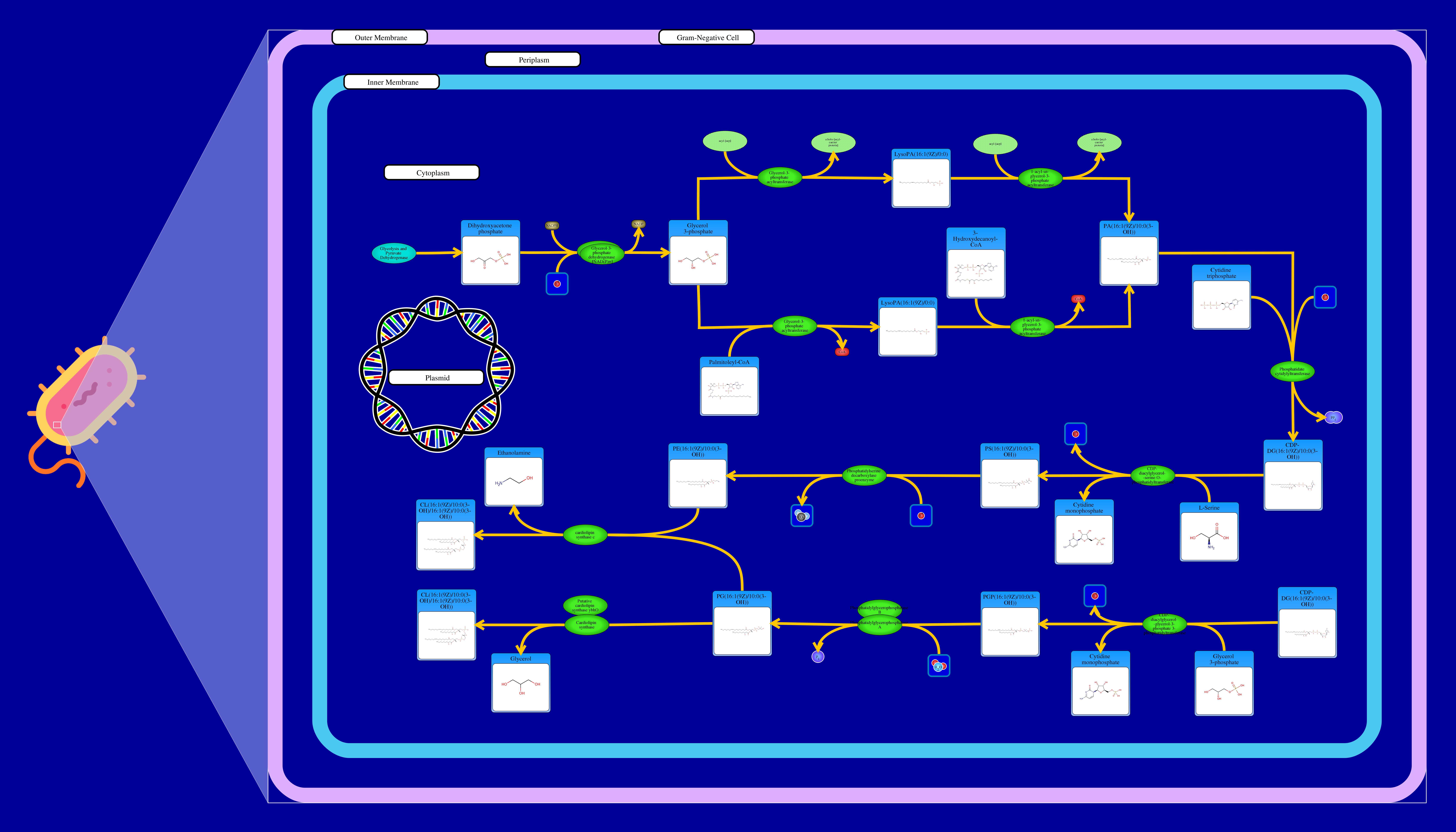Phospholipids are membrane components in E. coli. The major phospholipids of E. coli are phosphatidylethanolamine, phosphatidylglycerol, and cardiolipin. All phospholipids contain sn-glycerol-3-phosphate esterified with fatty acids at the sn-1 and sn-2 positions. The reaction starts from a glycerone phosphate (dihydroxyacetone phosphate) produced in glycolysis. The glycerone phosphate is transformed into an sn-glycerol 3-phosphate (glycerol 3 phosphate) by NADPH-driven glycerol-3-phosphate dehydrogenase. sn-Glycerol 3-phosphate is transformed to a 1-acyl-sn-glycerol 3-phosphate (lysophosphatidic acid). This can be achieved by an sn-glycerol-3-phosphate acyltransferase that interacts either with a long-chain acyl-CoA or with an acyl-[acp]. The 1-acyl-sn-glycerol 3-phosphate is transformed into a 1,2-diacyl-sn-glycerol 3-phosphate (phosphatidic acid) through a 1-acylglycerol-3-phosphate O-acyltransferase. This compound is then converted into a CPD-diacylglycerol through a CTP phosphatidate cytididyltransferase. CPD-diacylglycerol can be transformed either into an L-1-phosphatidylserine or an L-1-phosphatidylglycerol-phosphate through a phosphatidylserine synthase or a phosphatidylglycerophosphate synthase, respectively. The L-1-phosphatidylserine transforms into L-1-phosphatidylethanolamine through a phosphatidylserine decarboxylase. On the other hand, L-1-phosphatidylglycerol-phosphate gets transformed into an L-1-phosphatidyl-glycerol through a phosphatidylglycerophosphatase. These 2 products combine to produce a cardiolipin and an ethanolamine. The L-1 phosphatidyl-glycerol can also interact with cardiolipin synthase resulting in a glycerol and a cardiolipin.