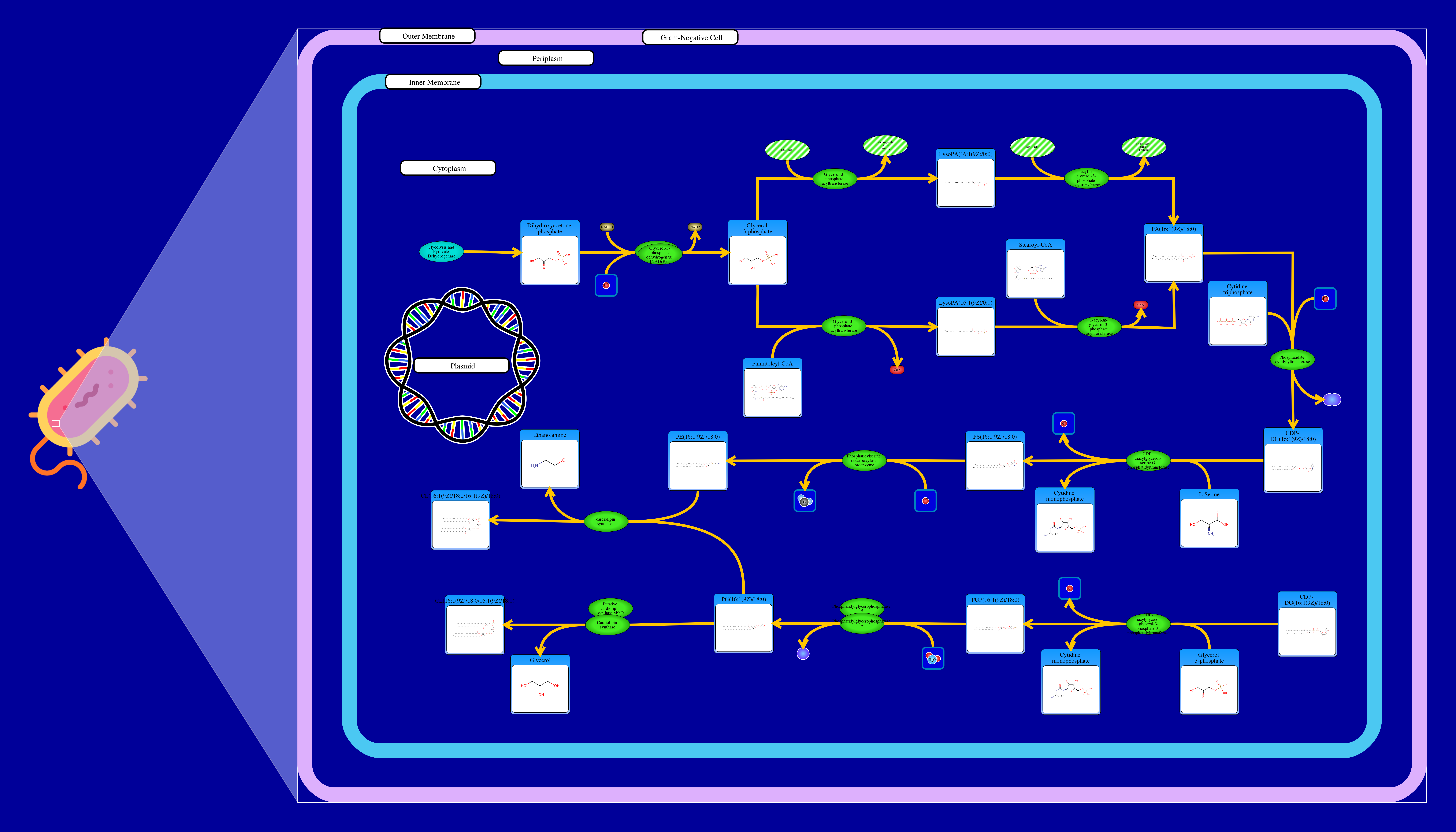 Phospholipids are membrane components in E. coli. The major phospholipids of E. coli are phosphatidylethanolamine, phosphatidylglycerol, and cardiolipin. All phospholipids contain sn-glycerol-3-phosphate esterified with fatty acids at the sn-1 and sn-2 positions. The reaction starts from a glycerone phosphate (dihydroxyacetone phosphate) produced in glycolysis. The glycerone phosphate is transformed into an sn-glycerol 3-phosphate (glycerol 3 phosphate) by NADPH-driven glycerol-3-phosphate dehydrogenase. sn-Glycerol 3-phosphate is transformed to a 1-acyl-sn-glycerol 3-phosphate (lysophosphatidic acid). This can be achieved by an sn-glycerol-3-phosphate acyltransferase that interacts either with a long-chain acyl-CoA or with an acyl-[acp]. The 1-acyl-sn-glycerol 3-phosphate is transformed into a 1,2-diacyl-sn-glycerol 3-phosphate (phosphatidic acid) through a 1-acylglycerol-3-phosphate O-acyltransferase. This compound is then converted into a CPD-diacylglycerol through a CTP phosphatidate cytididyltransferase. CPD-diacylglycerol can be transformed either into an L-1-phosphatidylserine or an L-1-phosphatidylglycerol-phosphate through a phosphatidylserine synthase or a phosphatidylglycerophosphate synthase, respectively. The L-1-phosphatidylserine transforms into L-1-phosphatidylethanolamine through a phosphatidylserine decarboxylase. On the other hand, L-1-phosphatidylglycerol-phosphate gets transformed into an L-1-phosphatidyl-glycerol through a phosphatidylglycerophosphatase. These 2 products combine to produce a cardiolipin and an ethanolamine. The L-1 phosphatidyl-glycerol can also interact with cardiolipin synthase resulting in a glycerol and a cardiolipin.