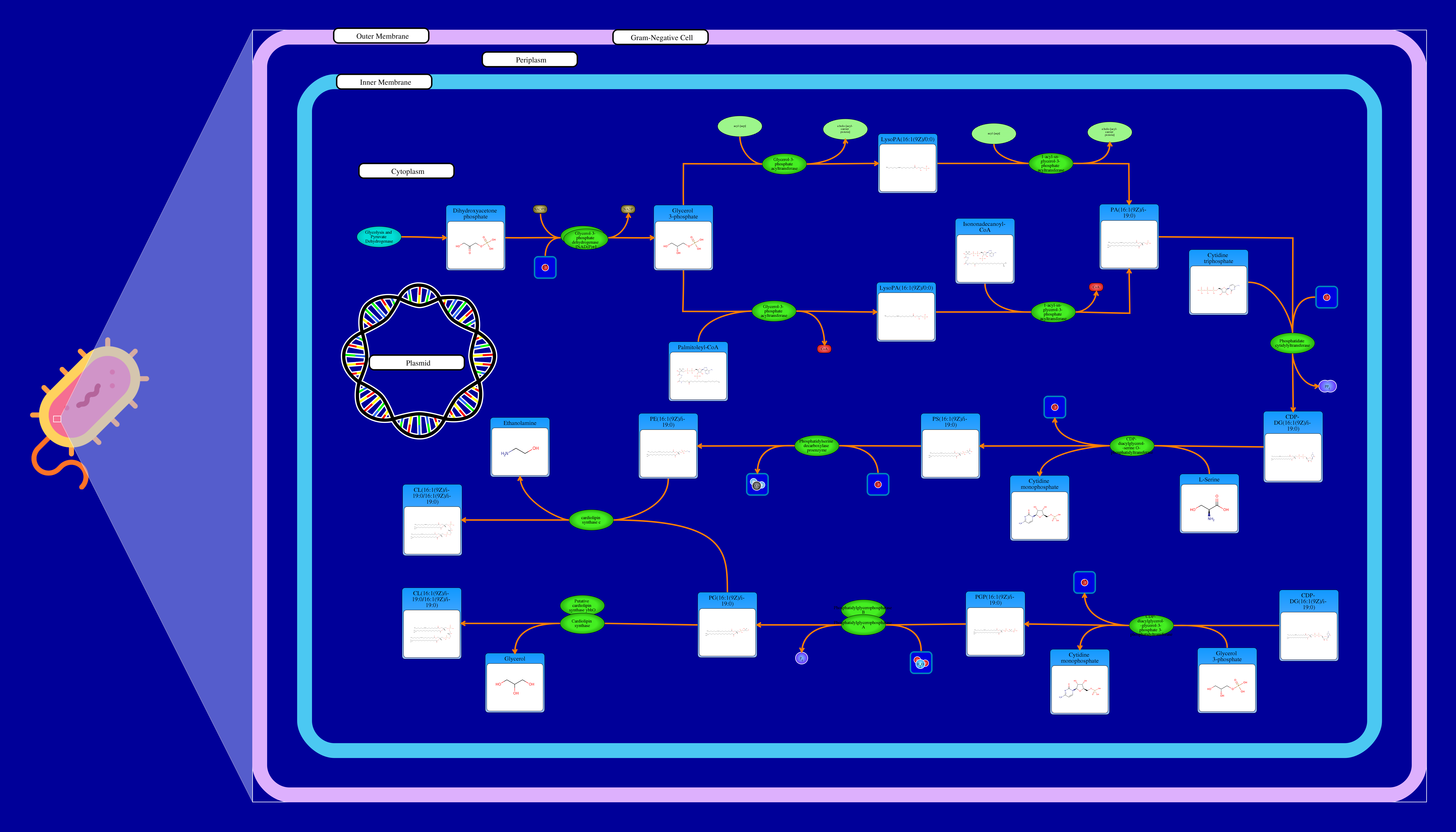 Phospholipids are membrane components in E. coli. The major phospholipids of E. coli are phosphatidylethanolamine, phosphatidylglycerol, and cardiolipin. All phospholipids contain sn-glycerol-3-phosphate esterified with fatty acids at the sn-1 and sn-2 positions. The reaction starts from a glycerone phosphate (dihydroxyacetone phosphate) produced in glycolysis. The glycerone phosphate is transformed into an sn-glycerol 3-phosphate (glycerol 3 phosphate) by NADPH-driven glycerol-3-phosphate dehydrogenase. sn-Glycerol 3-phosphate is transformed to a 1-acyl-sn-glycerol 3-phosphate (lysophosphatidic acid). This can be achieved by an sn-glycerol-3-phosphate acyltransferase that interacts either with a long-chain acyl-CoA or with an acyl-[acp]. The 1-acyl-sn-glycerol 3-phosphate is transformed into a 1,2-diacyl-sn-glycerol 3-phosphate (phosphatidic acid) through a 1-acylglycerol-3-phosphate O-acyltransferase. This compound is then converted into a CPD-diacylglycerol through a CTP phosphatidate cytididyltransferase. CPD-diacylglycerol can be transformed either into an L-1-phosphatidylserine or an L-1-phosphatidylglycerol-phosphate through a phosphatidylserine synthase or a phosphatidylglycerophosphate synthase, respectively. The L-1-phosphatidylserine transforms into L-1-phosphatidylethanolamine through a phosphatidylserine decarboxylase. On the other hand, L-1-phosphatidylglycerol-phosphate gets transformed into an L-1-phosphatidyl-glycerol through a phosphatidylglycerophosphatase. These 2 products combine to produce a cardiolipin and an ethanolamine. The L-1 phosphatidyl-glycerol can also interact with cardiolipin synthase resulting in a glycerol and a cardiolipin.