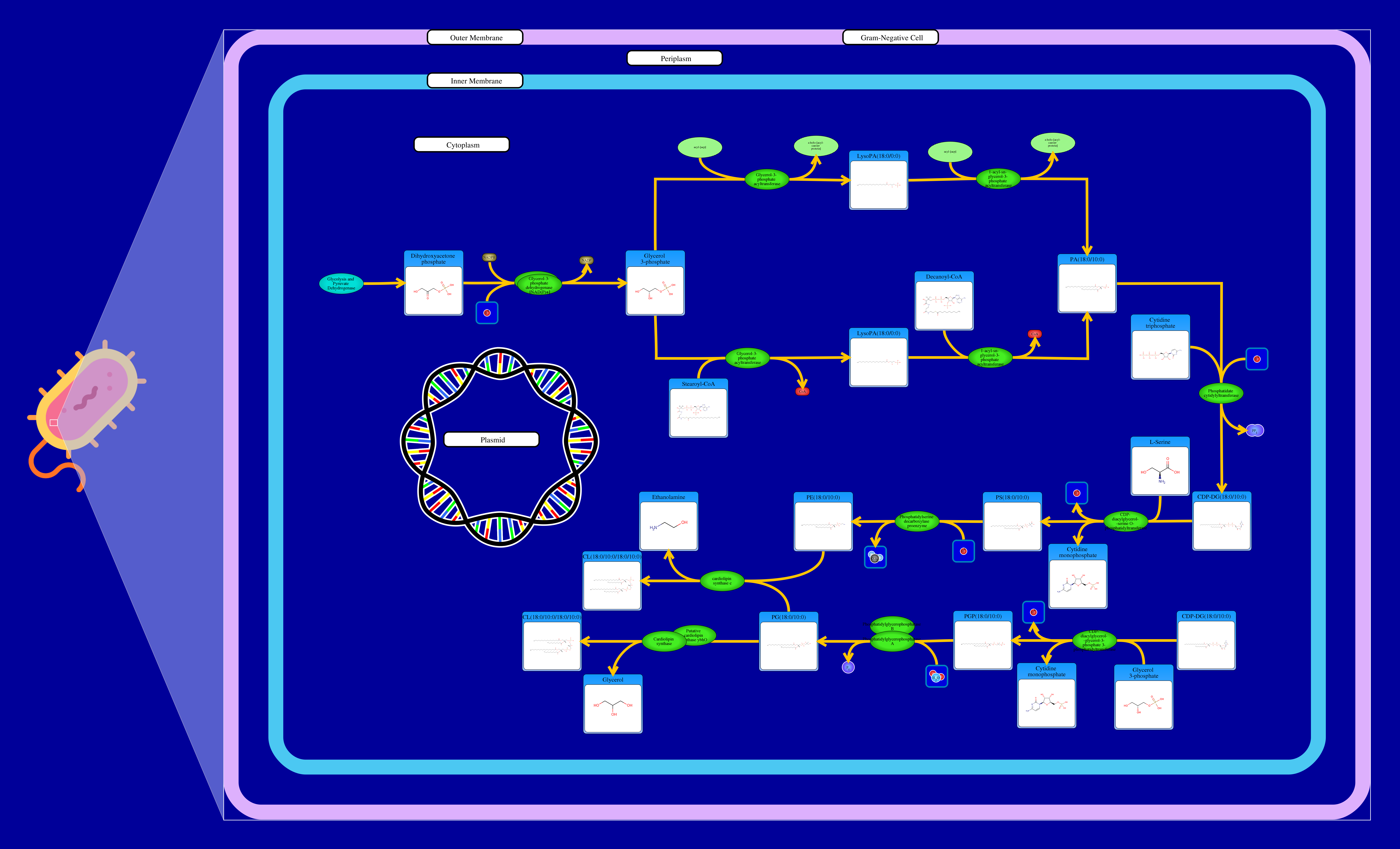 Phospholipids are membrane components in E. coli. The major phospholipids of E. coli are phosphatidylethanolamine, phosphatidylglycerol, and cardiolipin. All phospholipids contain sn-glycerol-3-phosphate esterified with fatty acids at the sn-1 and sn-2 positions. The reaction starts from a glycerone phosphate (dihydroxyacetone phosphate) produced in glycolysis. The glycerone phosphate is transformed into an sn-glycerol 3-phosphate (glycerol 3 phosphate) by NADPH-driven glycerol-3-phosphate dehydrogenase. sn-Glycerol 3-phosphate is transformed to a 1-acyl-sn-glycerol 3-phosphate (lysophosphatidic acid). This can be achieved by an sn-glycerol-3-phosphate acyltransferase that interacts either with a long-chain acyl-CoA or with an acyl-[acp]. The 1-acyl-sn-glycerol 3-phosphate is transformed into a 1,2-diacyl-sn-glycerol 3-phosphate (phosphatidic acid) through a 1-acylglycerol-3-phosphate O-acyltransferase. This compound is then converted into a CPD-diacylglycerol through a CTP phosphatidate cytididyltransferase. CPD-diacylglycerol can be transformed either into an L-1-phosphatidylserine or an L-1-phosphatidylglycerol-phosphate through a phosphatidylserine synthase or a phosphatidylglycerophosphate synthase, respectively. The L-1-phosphatidylserine transforms into L-1-phosphatidylethanolamine through a phosphatidylserine decarboxylase. On the other hand, L-1-phosphatidylglycerol-phosphate gets transformed into an L-1-phosphatidyl-glycerol through a phosphatidylglycerophosphatase. These 2 products combine to produce a cardiolipin and an ethanolamine. The L-1 phosphatidyl-glycerol can also interact with cardiolipin synthase resulting in a glycerol and a cardiolipin.