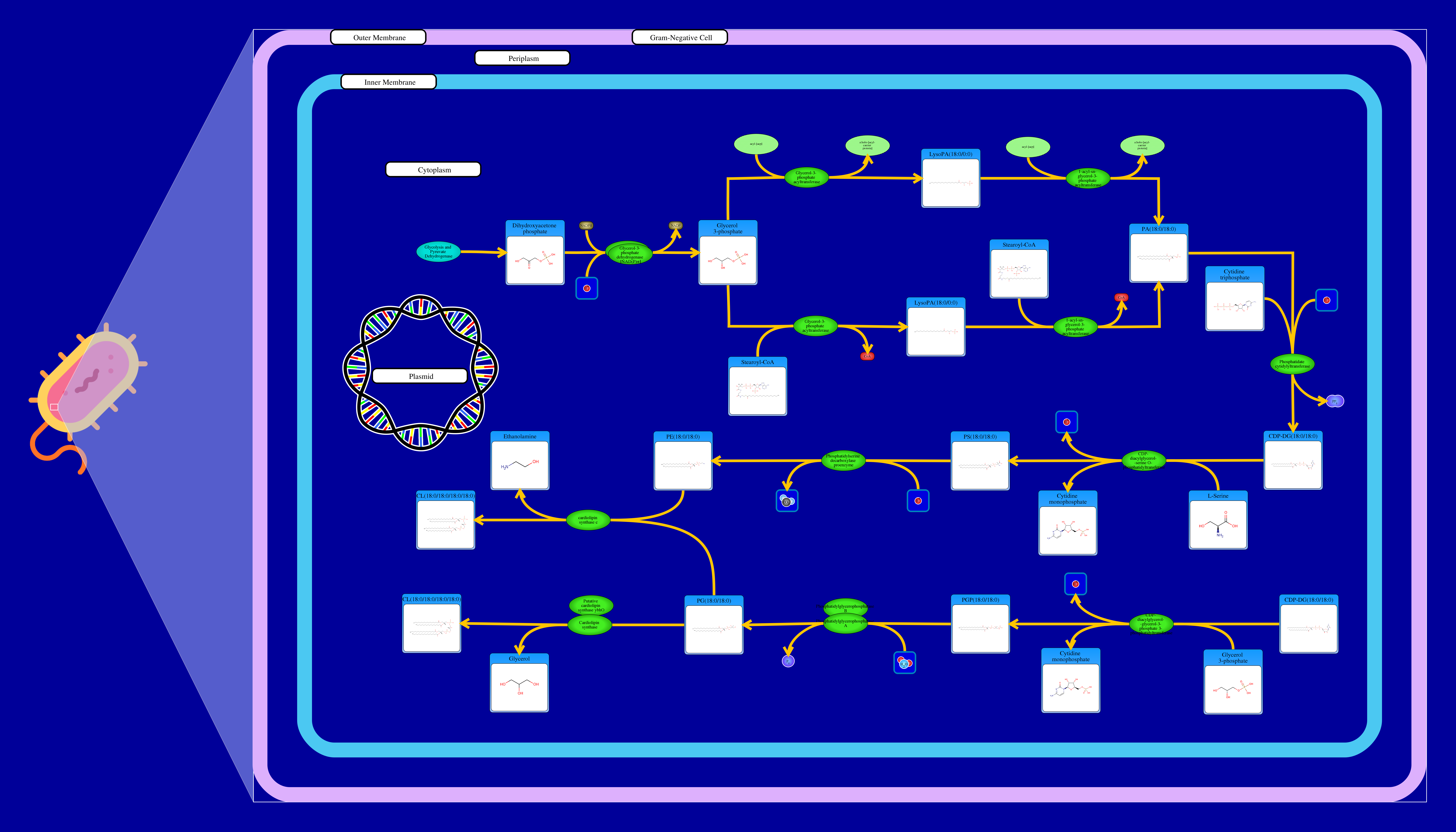 Phospholipids are membrane components in E. coli. The major phospholipids of E. coli are phosphatidylethanolamine, phosphatidylglycerol, and cardiolipin. All phospholipids contain sn-glycerol-3-phosphate esterified with fatty acids at the sn-1 and sn-2 positions. The reaction starts from a glycerone phosphate (dihydroxyacetone phosphate) produced in glycolysis. The glycerone phosphate is transformed into an sn-glycerol 3-phosphate (glycerol 3 phosphate) by NADPH-driven glycerol-3-phosphate dehydrogenase. sn-Glycerol 3-phosphate is transformed to a 1-acyl-sn-glycerol 3-phosphate (lysophosphatidic acid). This can be achieved by an sn-glycerol-3-phosphate acyltransferase that interacts either with a long-chain acyl-CoA or with an acyl-[acp]. The 1-acyl-sn-glycerol 3-phosphate is transformed into a 1,2-diacyl-sn-glycerol 3-phosphate (phosphatidic acid) through a 1-acylglycerol-3-phosphate O-acyltransferase. This compound is then converted into a CPD-diacylglycerol through a CTP phosphatidate cytididyltransferase. CPD-diacylglycerol can be transformed either into an L-1-phosphatidylserine or an L-1-phosphatidylglycerol-phosphate through a phosphatidylserine synthase or a phosphatidylglycerophosphate synthase, respectively. The L-1-phosphatidylserine transforms into L-1-phosphatidylethanolamine through a phosphatidylserine decarboxylase. On the other hand, L-1-phosphatidylglycerol-phosphate gets transformed into an L-1-phosphatidyl-glycerol through a phosphatidylglycerophosphatase. These 2 products combine to produce a cardiolipin and an ethanolamine. The L-1 phosphatidyl-glycerol can also interact with cardiolipin synthase resulting in a glycerol and a cardiolipin.